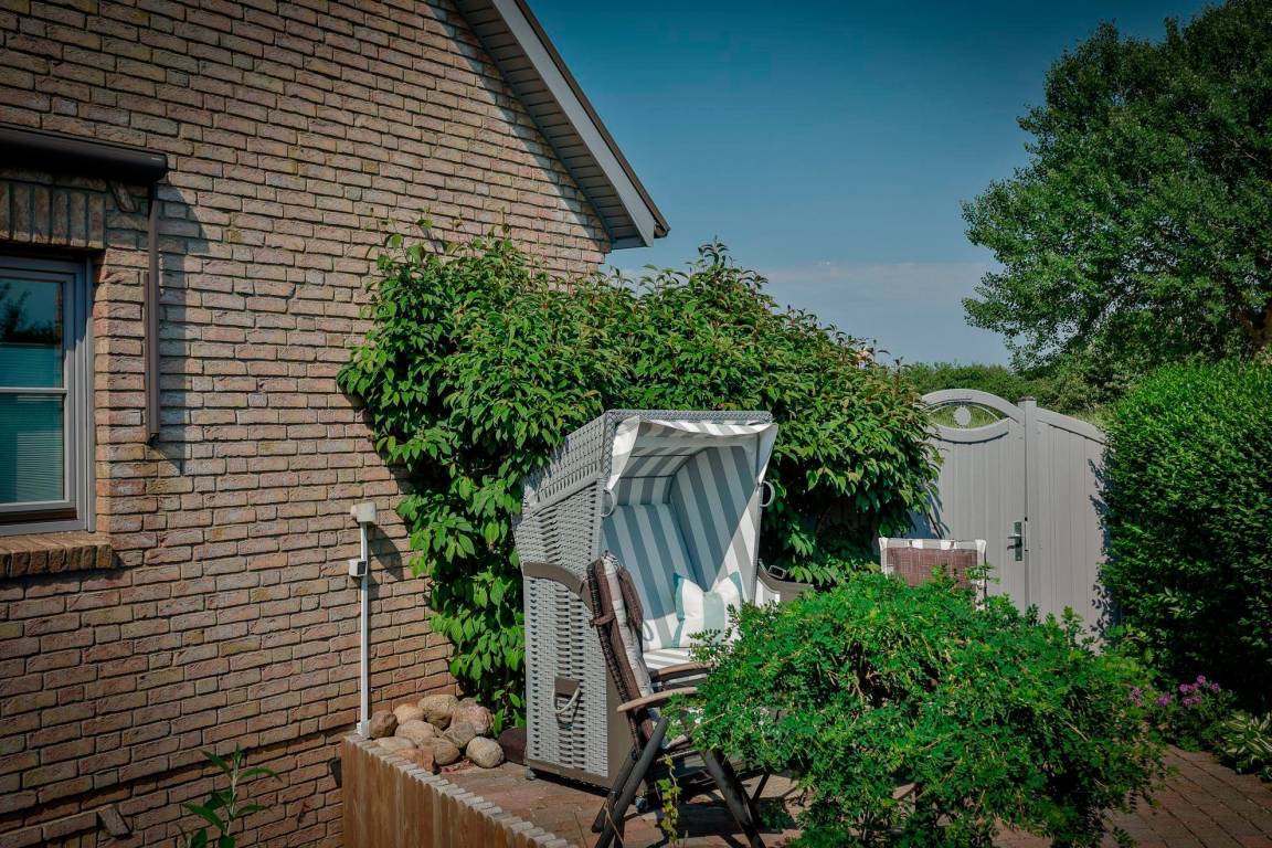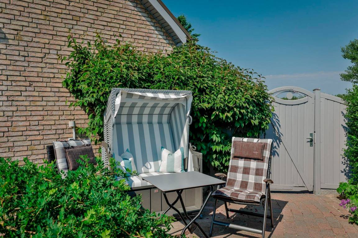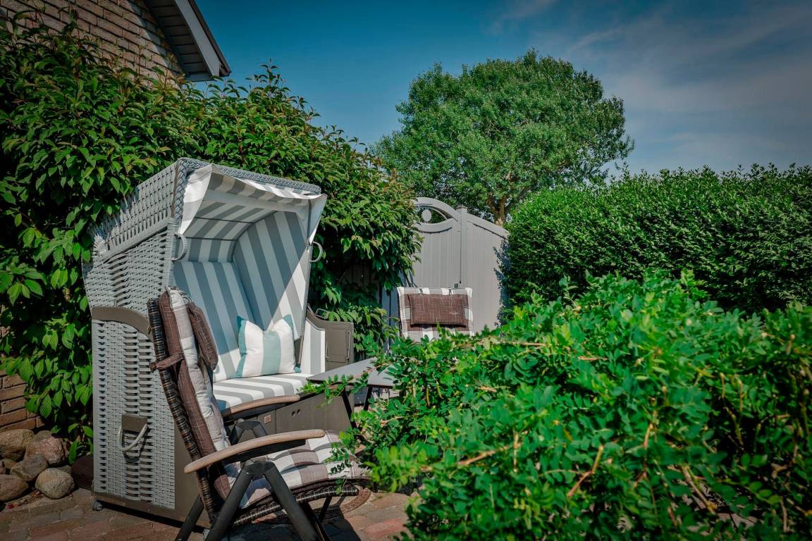 Eine sonnige Südterrasse mit Strandkorb und Gartenmöbeln lädt zum Erholen und Entspannen ein.
