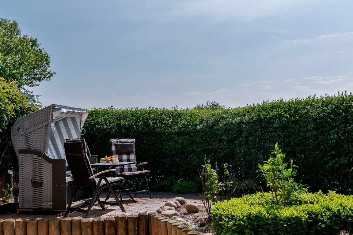 Zur Ferienwohnung gehört eine eigene Südterrasse mit Standkorb und Gartenmöbeln.