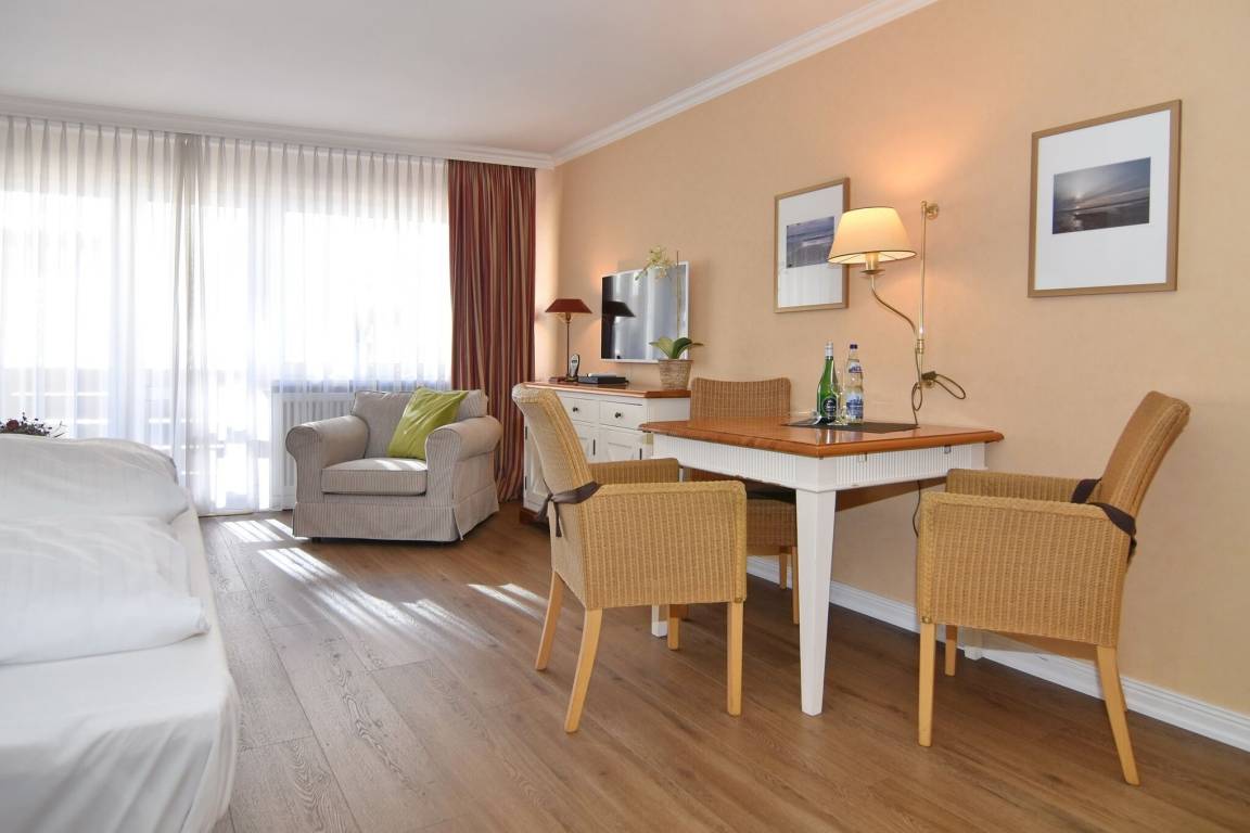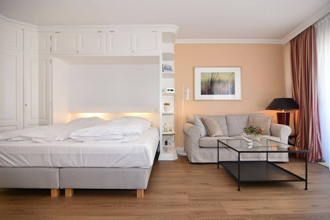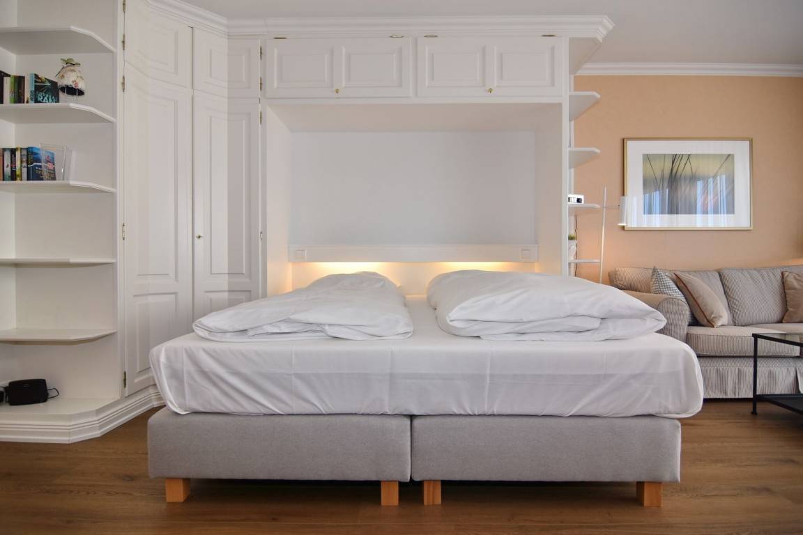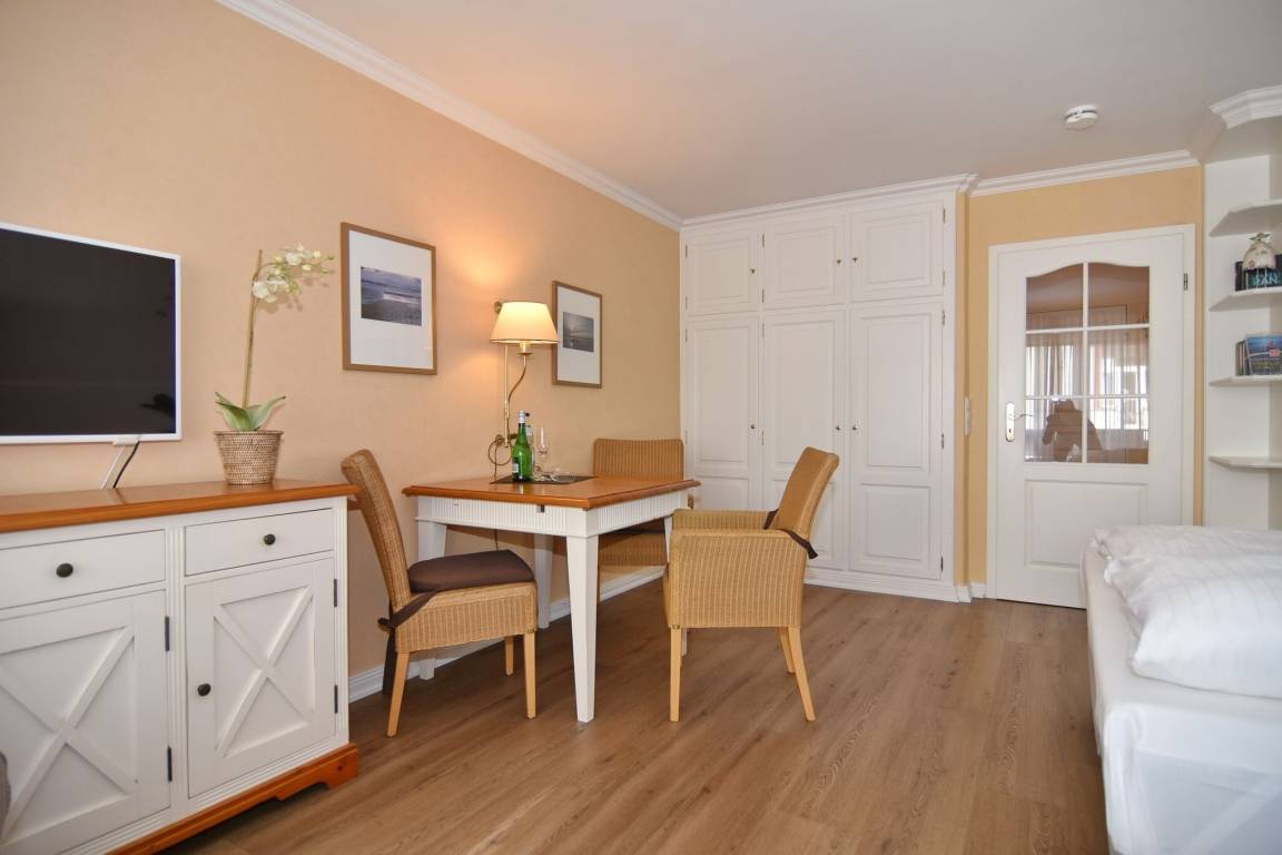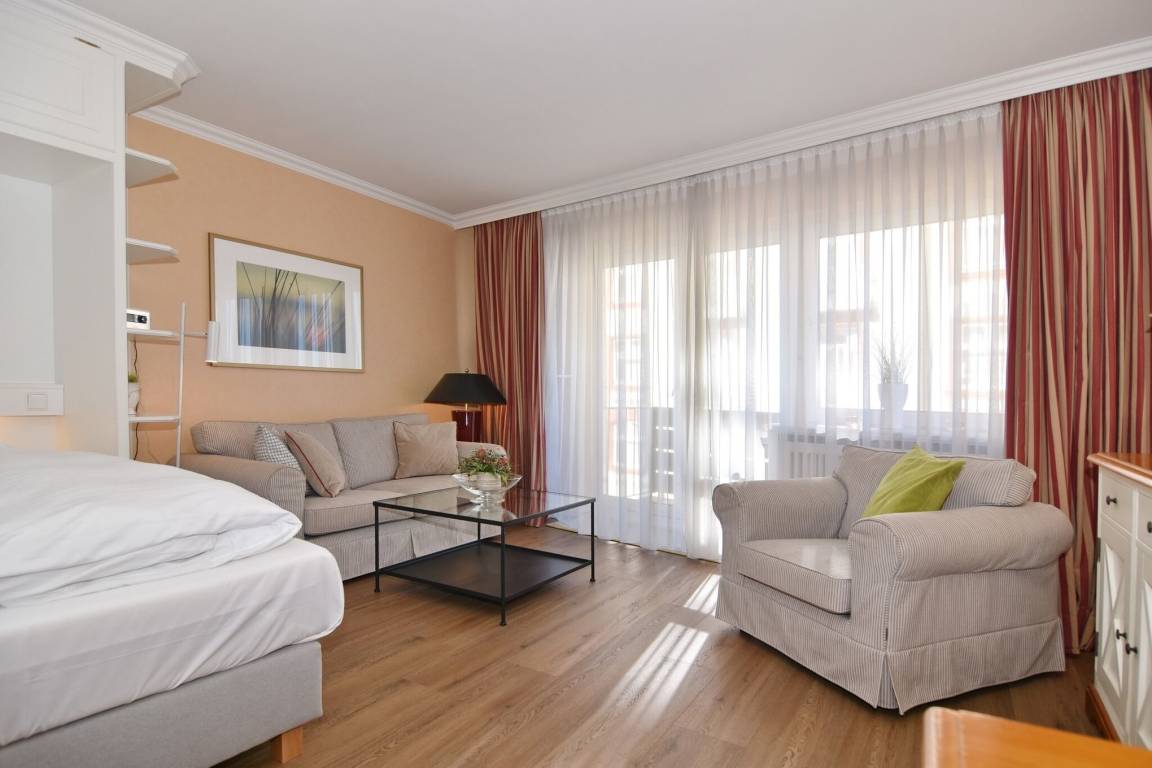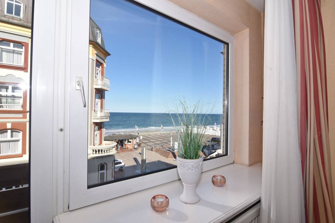 Exklusive 1 Zimmer-Ferienwohnung, ca. 38m², 3.OG. Wohn-/Schlafraum mit kleinem Westbalkon und teilweisen Meeresblick, Bockspringbett (1,80 x 2,00m), Eßtisch, Designerboden, 2-Sitzer-Couch und Couchtisch, Kabel-TV (Flachbildschirm) inkl. Radio, DVD, separate Küche mit Microwelle und Geschirrspüler sowie Nespresso-Maschine. Duschbad/WC. Fahrstuhl vorhanden. Nichtraucher-Whg.! W-LAN Anschluß (ohne Gewähr) vorhanden. Tierhaltung ist nicht gestattet. Pkw-Stellplatz kann kostenpflichtig hinzugebucht werden. Bettwäsche und Handtücher sind zur Anreise aufgezogen!