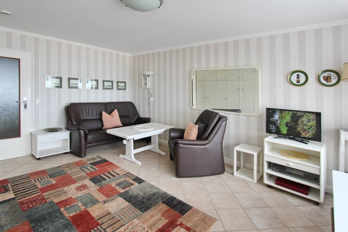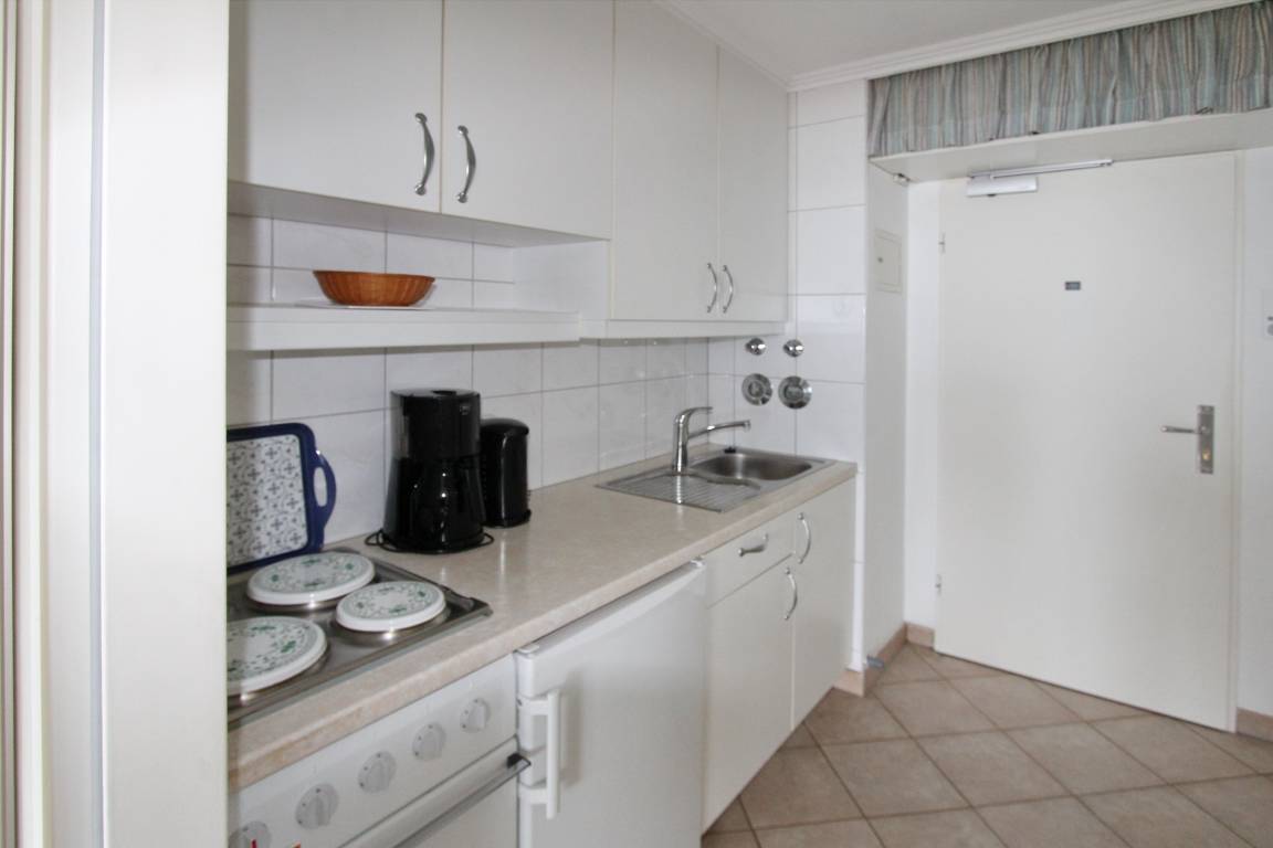 In der 7. Etage des Haus am Meer befindet sich diese Einzimmerwohnung zur Westseite. Sie hat einen tollen Blick auf die Nordsee und die Promenade ... sogar die Musiker in der Musikmuschel können sie noch sehen. Der kombinierte Wohn-/Schlafraum mit vorgelagertem Westbalkon (Balkonmöbel mit Auflagen sind vorhanden) verfügt über Einzelschrankbetten, einen Fliesenboden, einen Essplatz mit 2 Stühlen am Fenster und eine Couchgarnitur mit Fernsehsessel. Das moderne Badezimmer hat eine Dusche mit niedrigem Einstieg, einen Duschhocker und viel Abstellfläche für ihre persönlichen Dinge. In der Küchenzeile mit Backofen und 3 Herdplatten können sie sich selbst verpflegen. Zur technischen Ausstattung gehört: ein Flachbildfernseher und ein Radio. Kosten-und passwortfreier Zugang zum WLAN Hot Spot des Gebäudes (WEG Haus am Meer - Passwortfrei - ohne Gewähr). Wohnungsgröße: ca. 34 m².