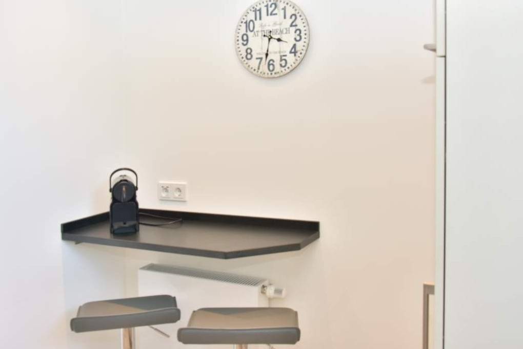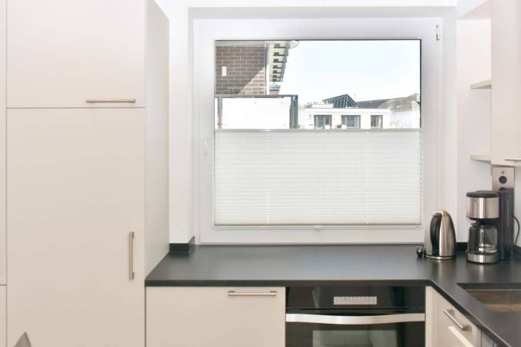 Die separate Küche hat einen Herd mit Backofen, 4-Platten-Ceranfeld, einen Kühlschrank, eine Waschmaschine und ein Fenster. Filter-Kaffeemaschine und Nespresso-Maschine, Wasserkocher und Toaster gehören zur Grundausstattung.