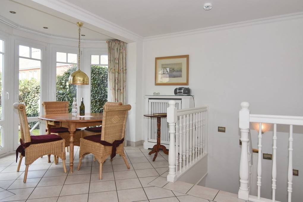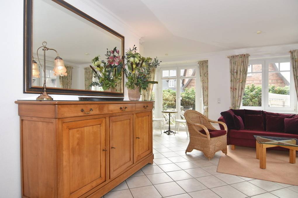 Elegante 3-Zimmer-Ferienwohnung im Haus Hopfengarten, EG/UG, 73 qm. Nichtraucher-Whg.! EG: ist gefliest mit Teppich bei der Sitzgruppe, Wohnraum mit Couch und Sessel, Eßtisch, Radio+Cass., HD-Flat-TV, W-Lan/Telefonflatrate ins dt. Festnetz, Internet [nbsp]ohne Gewähr), Gartenbereich mit möblierter Süd- und Westterrasse (kein Sonnenschirm). Keine Verwendung von Pestiziden. Strandkorb (Apr.-Okt.). Offene Küche mit Geschirrspüler, Microwelle und Backofen und kleinem Bistrotisch, Gäste-WC. UG: 1 Schlafzimmer mit Doppelbett und TV, Schlafzimmer mit Himmel-Doppelbett, Bad mit Wanne, Dusche und WC, Waschmaschine mit Trockner, PKW-Stellplatz Nr.9, Bettwäsche und Handtücher sind zur Anreise aufgezogen. Tierhaltung ist nicht gestattet. Gemeinschaftlicher Fahrradabstellraum ist vorhanden.