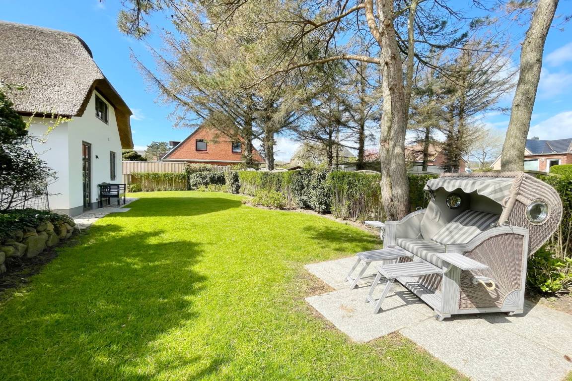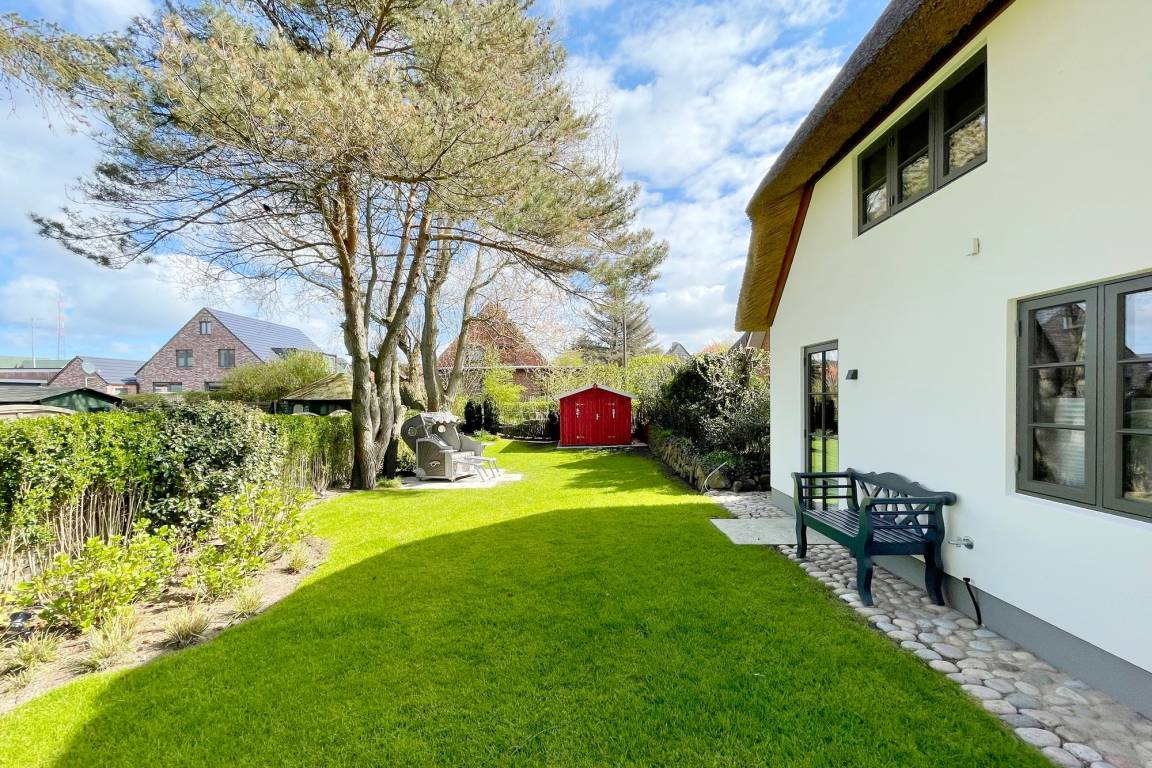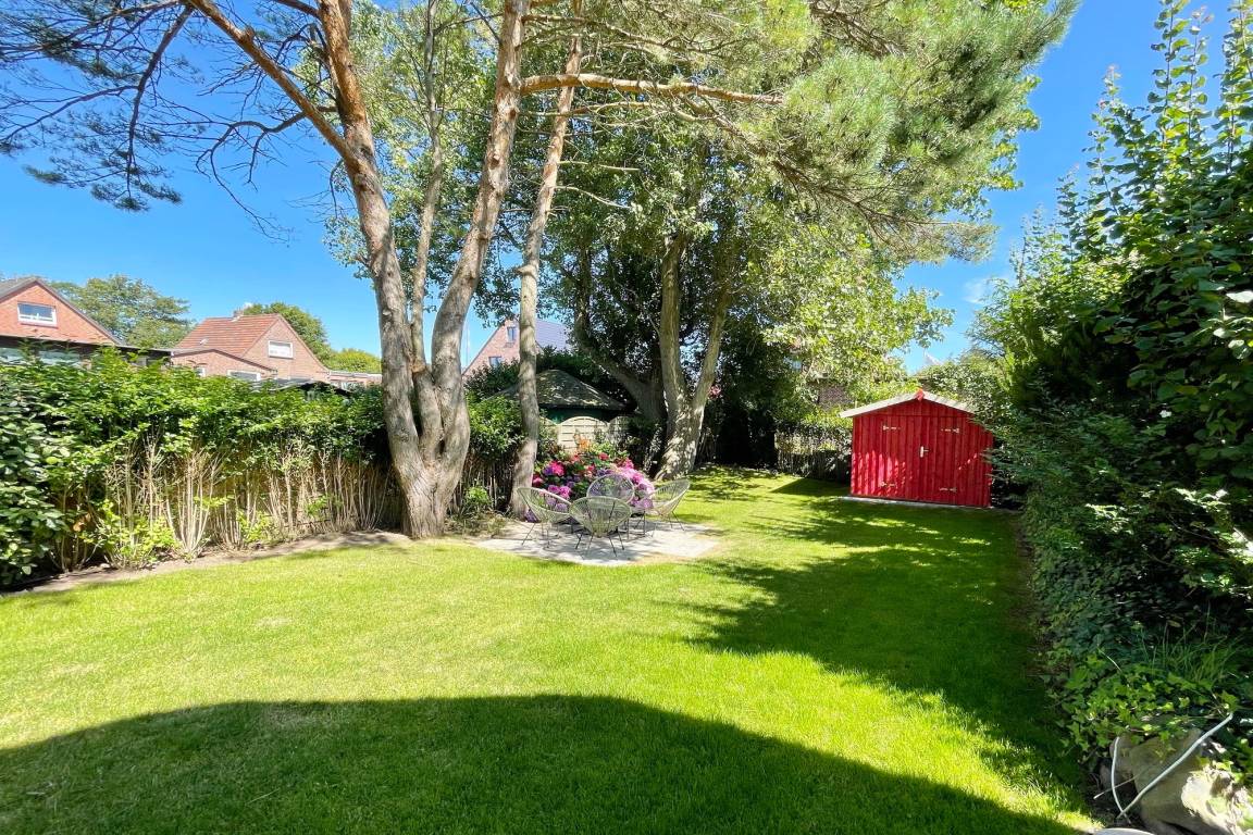 Der ebenfalls von einem Landschafts- und Gartenbauer neu gestaltete Garten wird von einem Friesenwall mit Eingangspforte umgeben und lässt inklusive des Vorplatzes am Abend wunderschön beleuchten. Dieser umgibt das Haus, bietet viel Privatsphäre und ganz nach Wunsch Sonne oder Schatten auf Krusten-Naturstein / Katzenkopfpflaster-Terrassen oder auf dem Rasen, schwedenrotes Gartenhaus für die Terrassenmöbel im Garten und eine Alu-Fahrradbox direkt am Haus.
