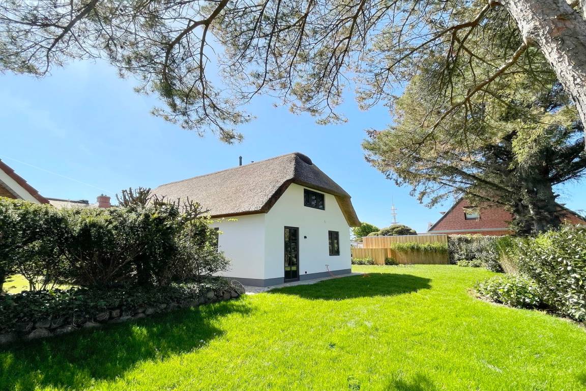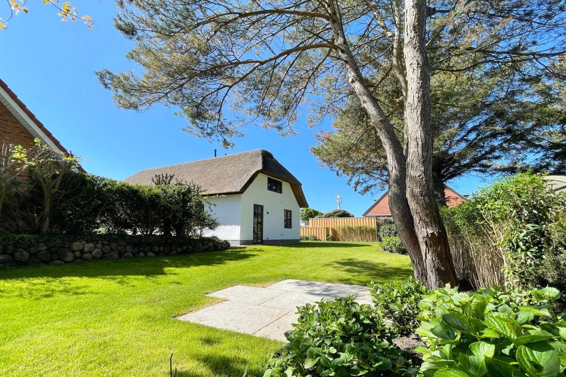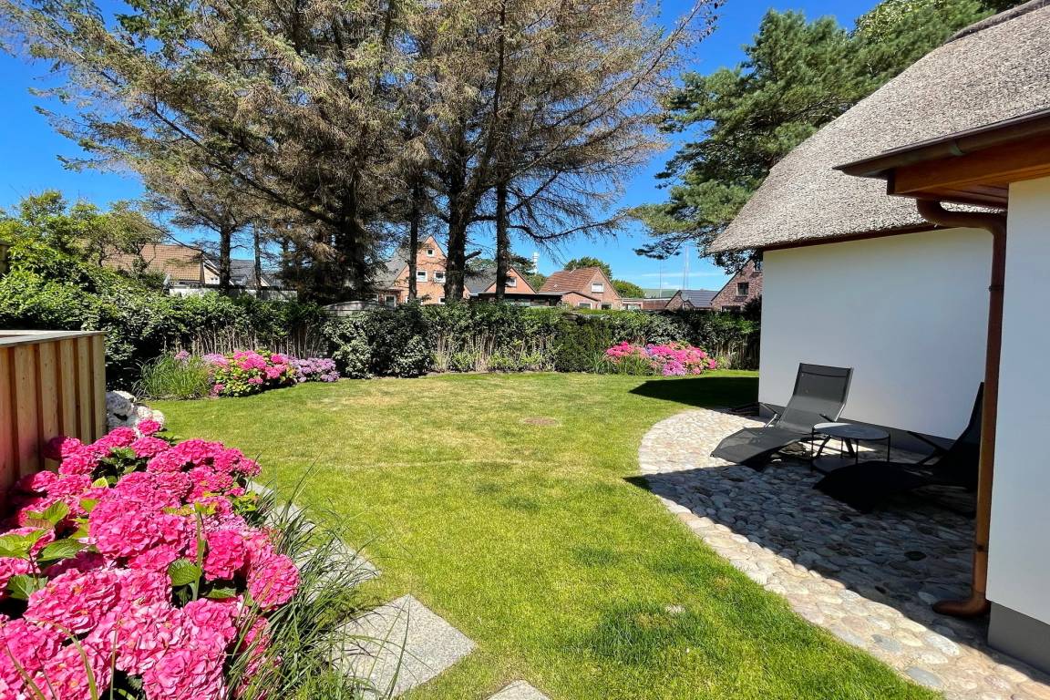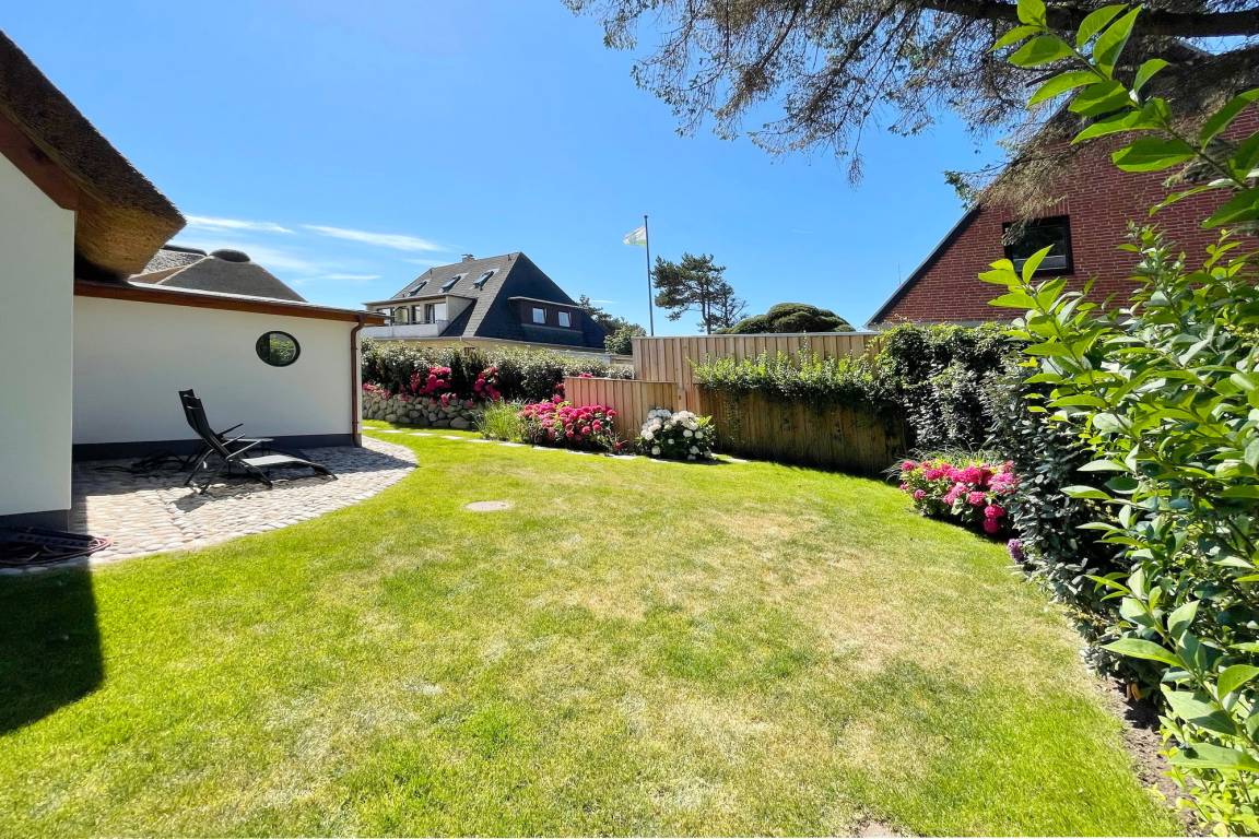 Der ebenfalls von einem Landschafts- und Gartenbauer neu gestaltete Garten wird von einem Friesenwall mit Eingangspforte umgeben und lässt inklusive des Vorplatzes am Abend wunderschön beleuchten. Dieser umgibt das Haus, bietet viel Privatsphäre und ganz nach Wunsch Sonne oder Schatten auf Krusten-Naturstein / Katzenkopfpflaster-Terrassen oder auf dem Rasen, schwedenrotes Gartenhaus für die Terrassenmöbel im Garten und eine Alu-Fahrradbox direkt am Haus.