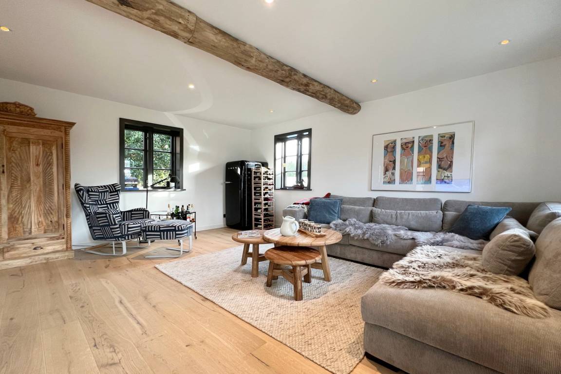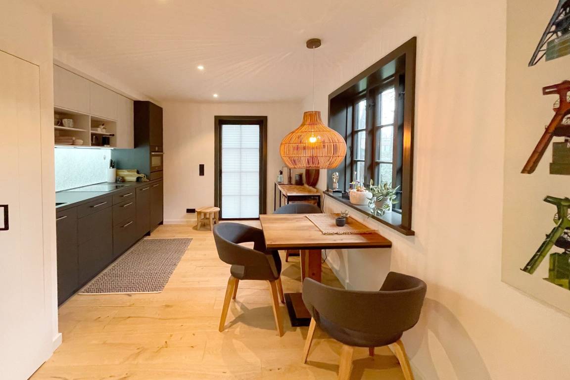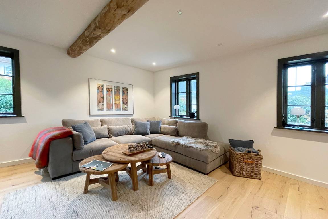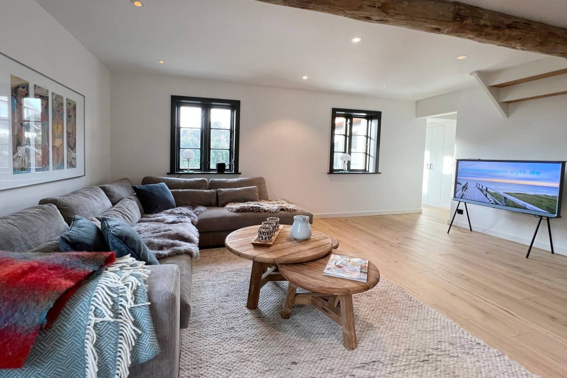 EG: Wohnbereich mit großzügiger Lounge-Ecke und Schaukelsessel mit Footstool zum Relaxen, Smeg-Kühlschrank, Magenta TV und Apple-Box, Elektrokamin mit Kaminbank für 2. Die offene moderne Küche der Firma Leicht ist top ausgestattet und verfügt über eine Arbeitsplatte mit Lautsprecher und Aufladestation . Hier ist auch ein kleiner Sitzplatz für 2-3 Personen.