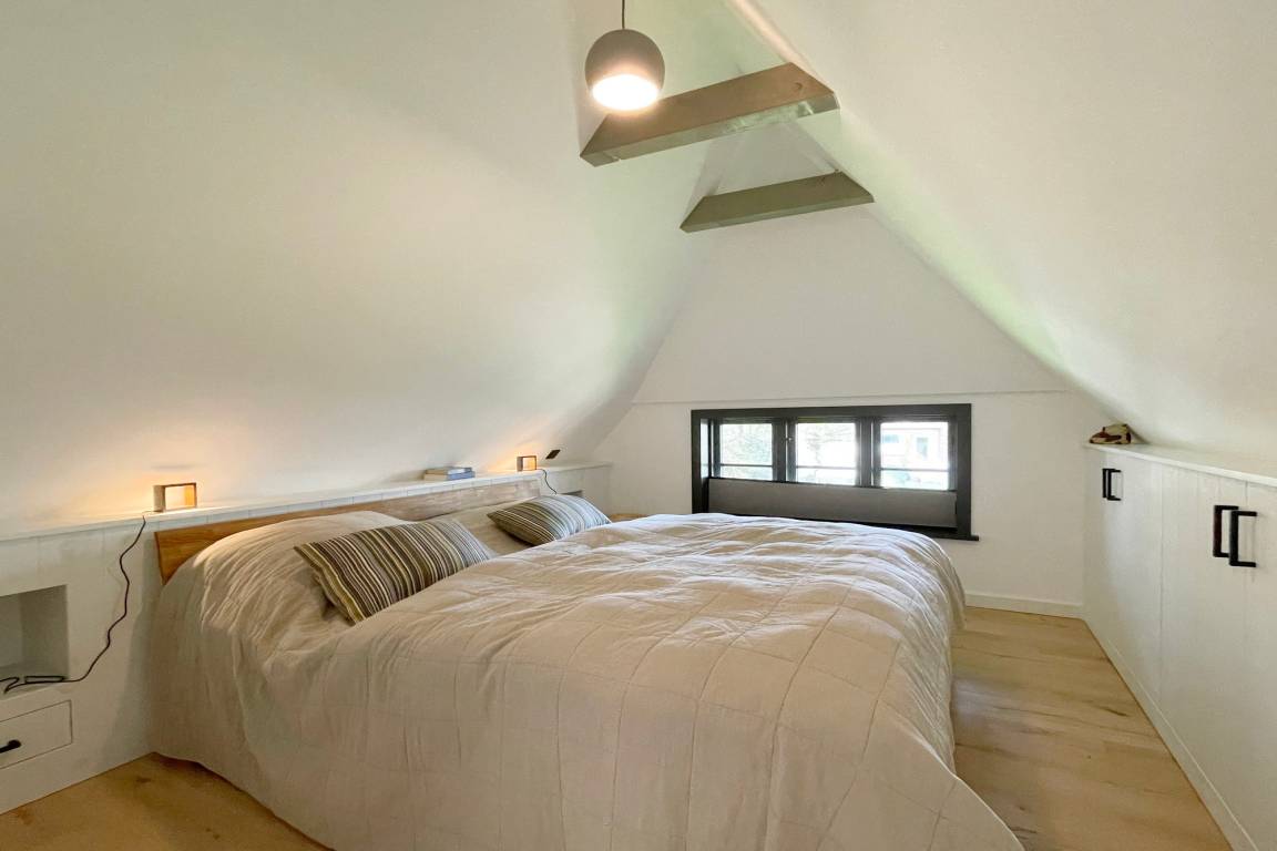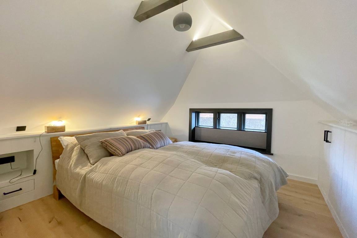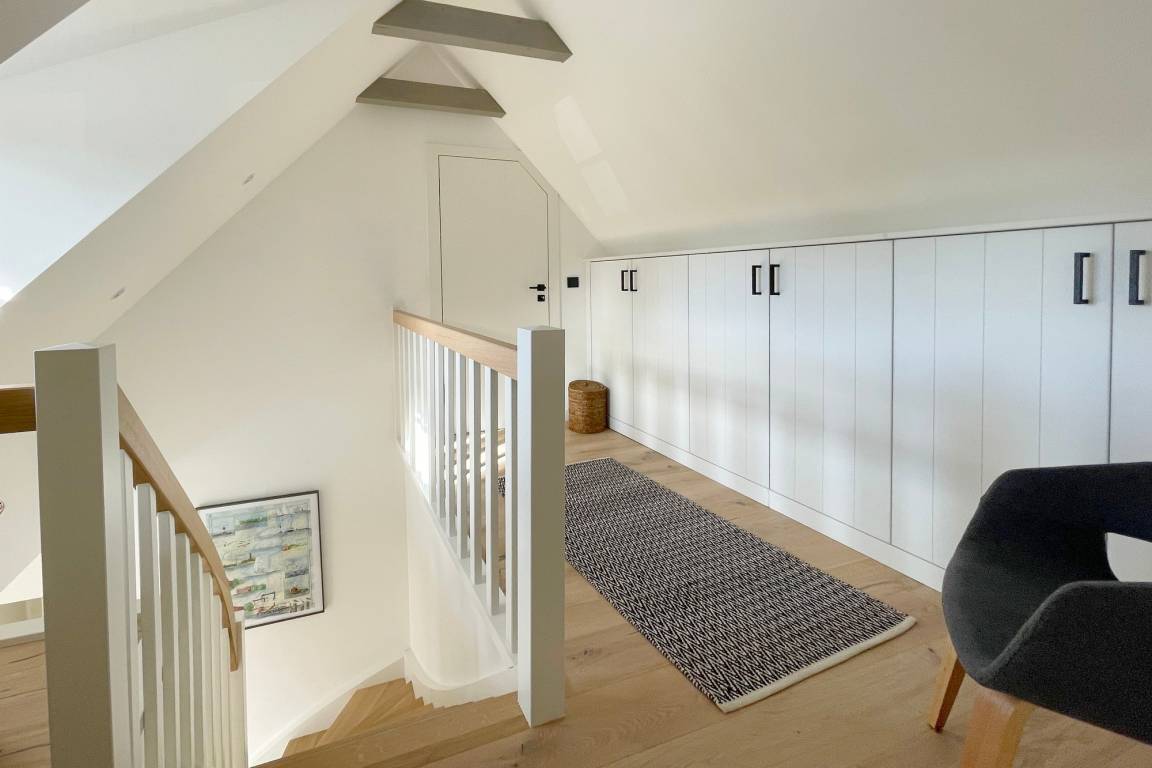OG: Bis in den Giebel geöffnete kleine Galerie mit Reetdach-Gaube, von der nach links und rechts jeweils ein Schlafzimmer mit Doppelbett, Einbauschrank und Sprossenfenstern mit Verdunklungsrollo abgehen.