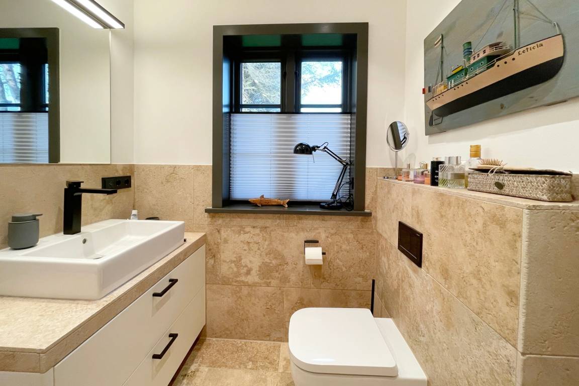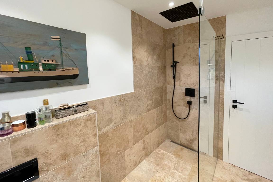 Badezimmer: Natursteinbad mit großer Walk-In-Dusche und Raindance-Deckendusche und Handbrause. Handtuchheizkörper, WC und Einbau-Duravit-Waschtisch