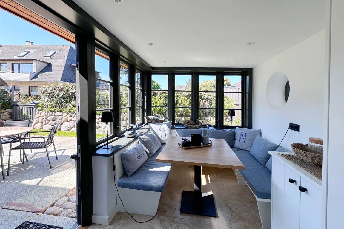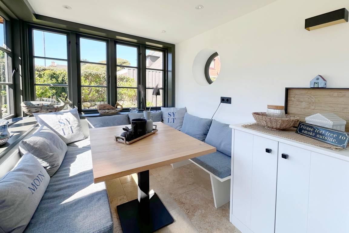 Das exklusive Ferienhaus Rosie [&] Piet wurde aufwendig von Grund auf saniert. Der ursprüngliche Charakter des Ferienhauses konnte in seiner Einzigartigkeit erhalten bleiben, gleichzeitig präsentiert sich dieses kleine Schmuckstück unter Reet mit erstklassiger Ausstattung und Möblierung im neuen Glanz. Der Zugang erfolgt über den überdachten Wintergarten, dort befindet sich auch die von Tischlerhand eingebaute Essecke mit Platz für bis zu 4 Personen.