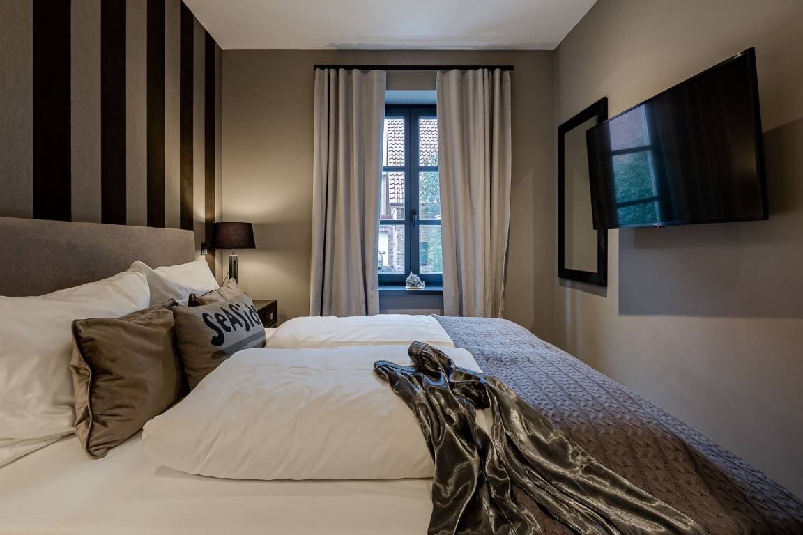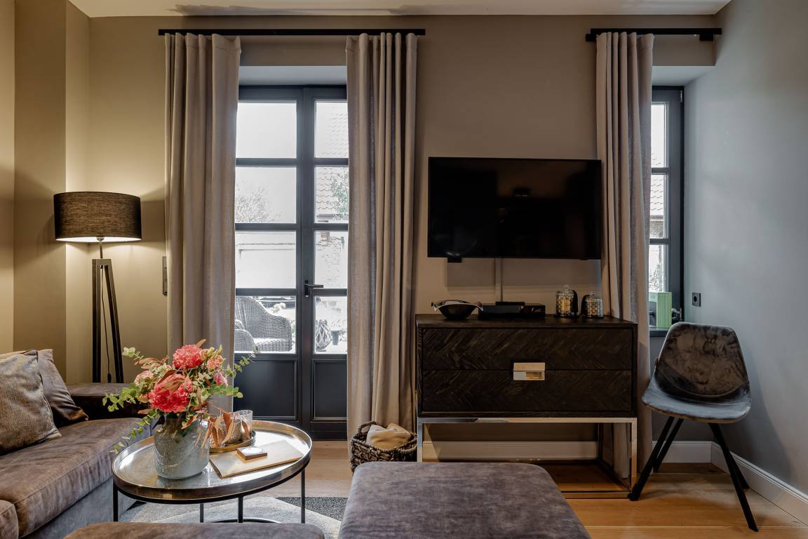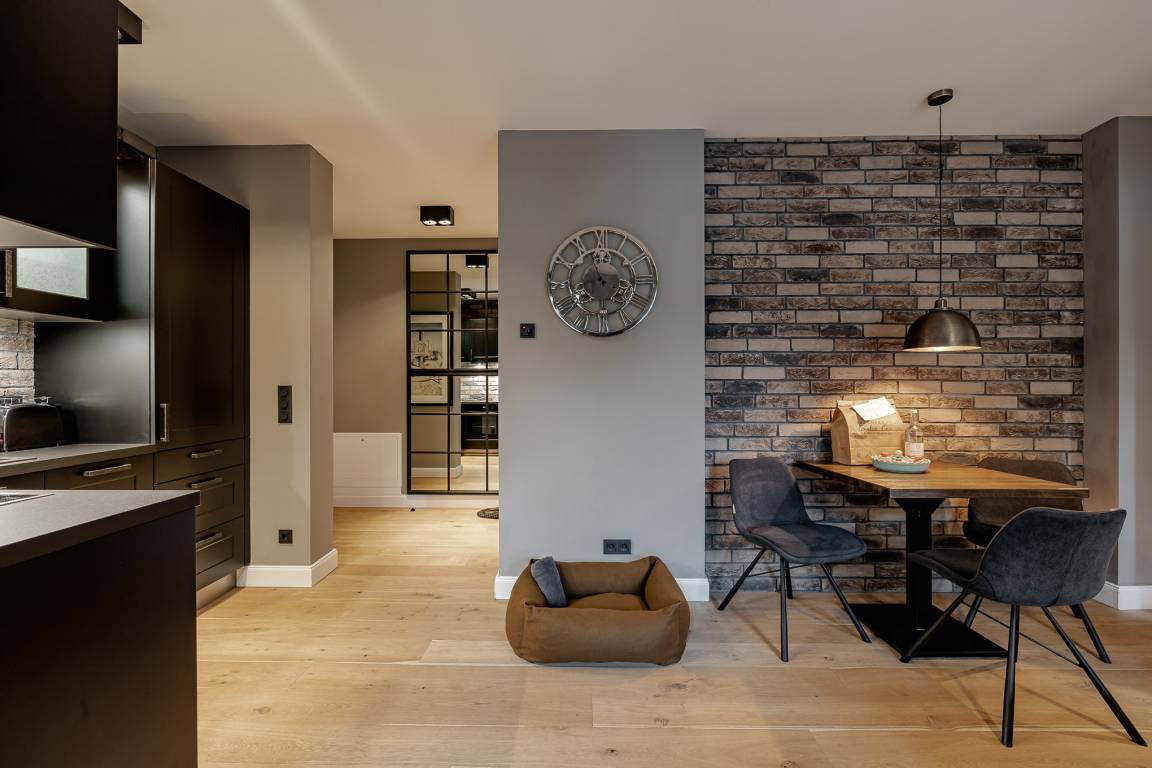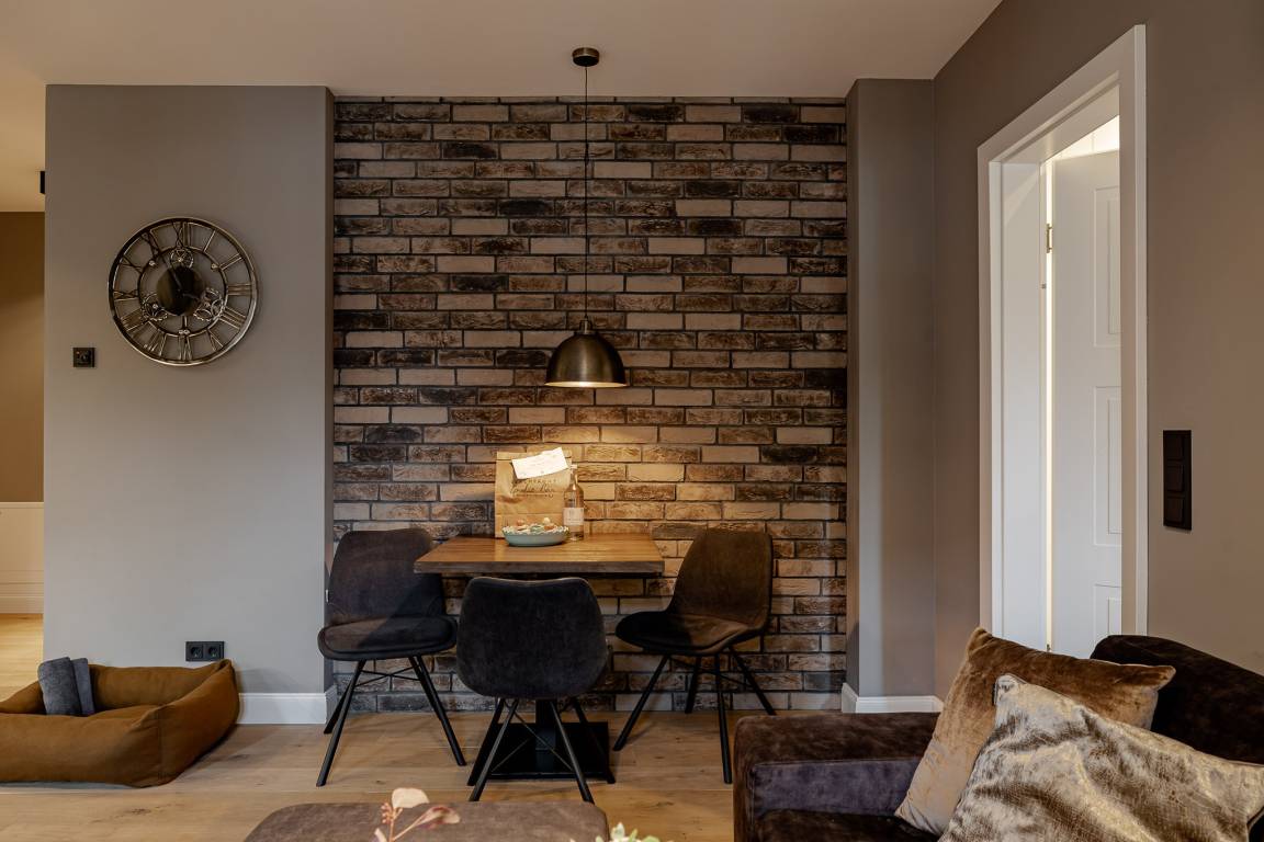 Schon beim Betreten spüren Sie die besondere Atmosphäre: hohe Decken und eine moderne, durchdacht abgestimmte Einrichtung schaffen ein echtes Zuhause-auf-Zeit. Der großzügige Wohn- und Essbereich ist der Mittelpunkt der Wohnung. Hier lädt ein bequemes Schlafsofa zu entspannten Stunden ein und bietet bei Bedarf eine zusätzliche Schlafmöglichkeit.