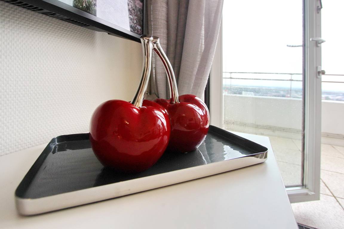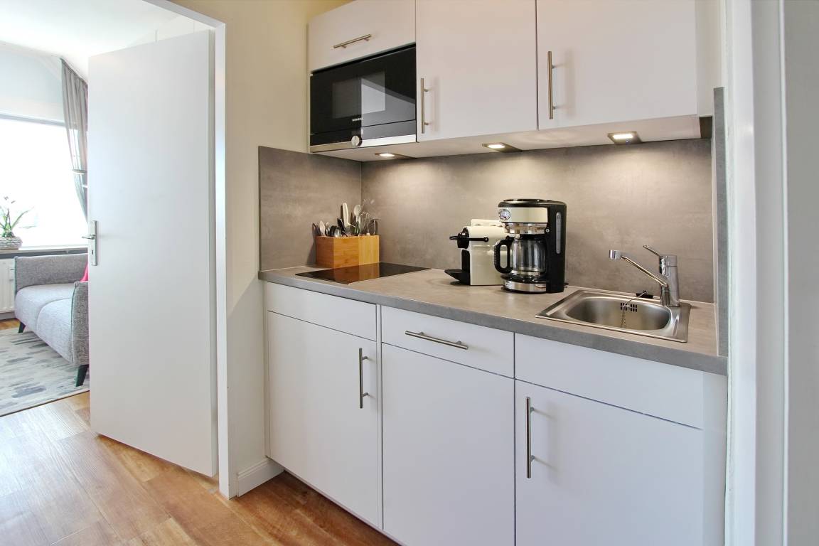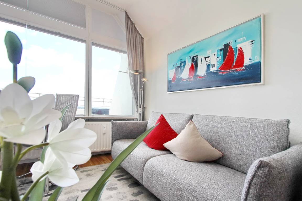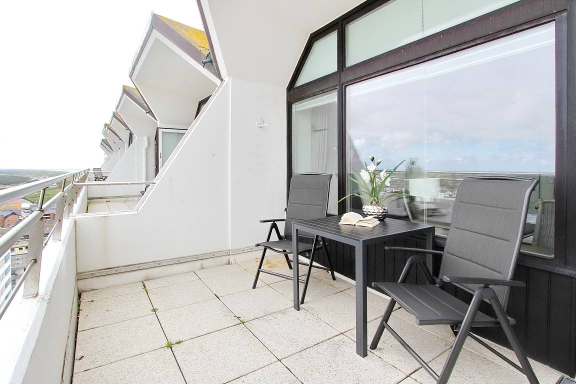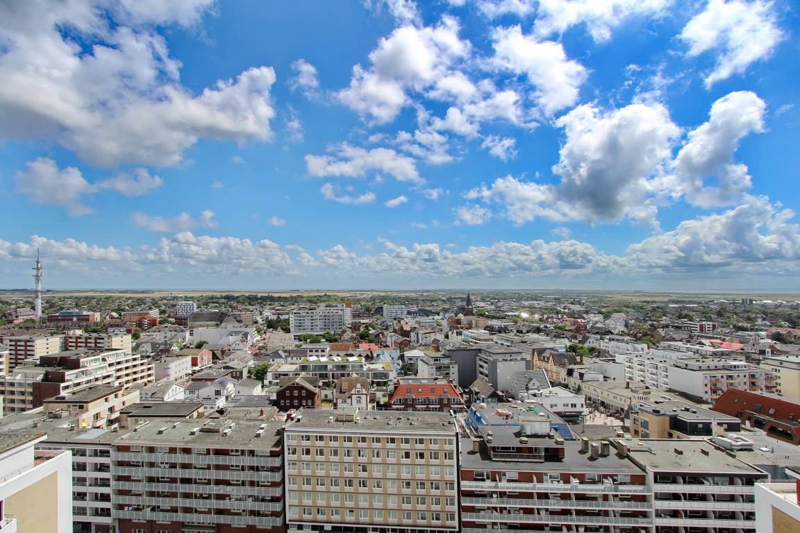 Wunderbare Penthousewohnung in der 14. Etage im Haus Metropol mit herrlichem Weitblick über die Insel und die Stadt. Der hell und freundlich, im Frühjahr 2020 neu eingerichtete Wohn-/Schlafraum, verfügt über ein feststehendes Boxspringbett für allerhöchsten Schlafkomfort. Auf der Ostdachterrasse gibt es eine gemütliche Rattanlounge, die bei Sonnenschein zum verweilen einlädt. Sollte es draußen zu frisch sein, gibt es drinnen am Fenster einen Essplatz mit 2 Stühlen. Im Wohnraum und Flur wurde Designfussboden verlegt. Das Badezimmer hat eine Dusche. Im Flur gibt es eine Küchenzeile, mit 2 Platten Cerankochfeld, Geschirrspüler und Mikrowelle, in der sie kleine Mahlzeiten zubereiten können. Eine zusätzliche Nespresso-Kapselmaschine ist vorhanden und selbst einen Eierkocher gibt es. Stilvolldecken Sie den Tisch mit Geschirr von Thomas Trend. Eine Bluetoothanlage der Marke Sony mit Radio und CD Player, ein großer Flachbildfernseher von Samsung und ein DVD Player gehören zur technischen Ausstattung. Eine Smartphone Ladestation ist ebenfalls vorhanden. Der freie WLAN Hotspot (WEG Haus Metropol - Passwortfrei - ohne Gewähr) steht ihnen kostenfrei zur Verfügung. Diese Nichtraucherwohnung ist nur über eine Treppe erreichbar, da der Aufzug in der 13. Etage endet. Wohnungsgröße: ca. 30 m².