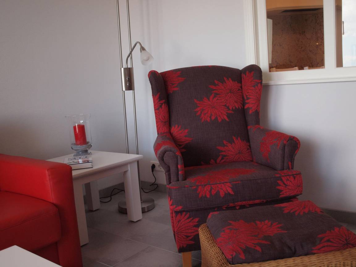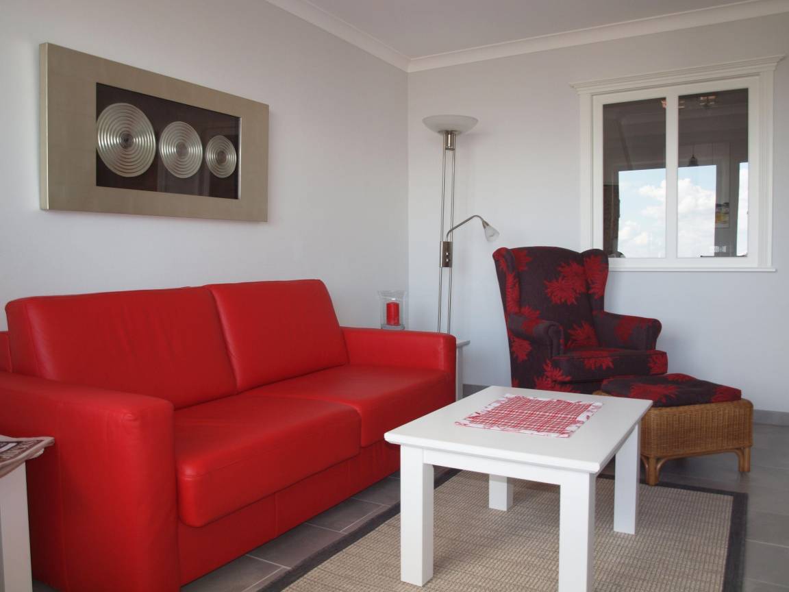 Das Wohnzimmer mit Ausrichtung zum Osten, hat ein gemütliches rotes Lederschlafsofa und einen Ohrensessel. Ein großer Flat-TV ist vorhanden.