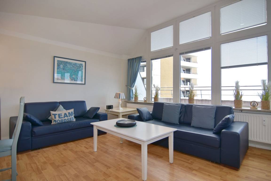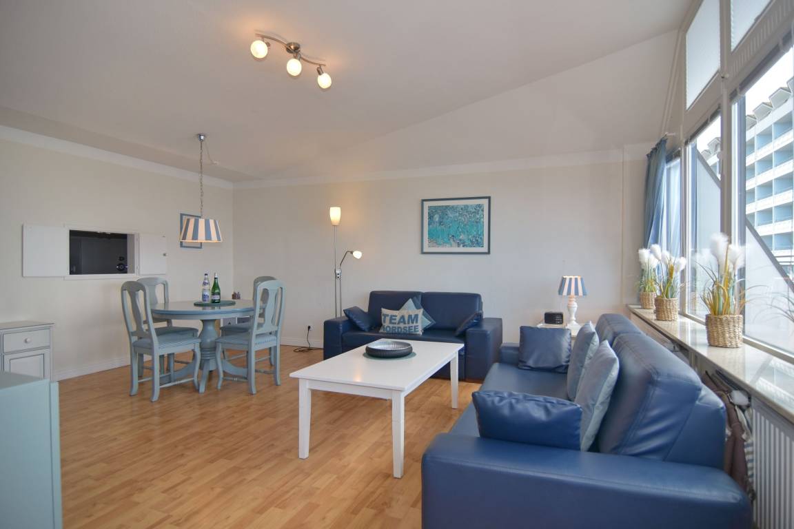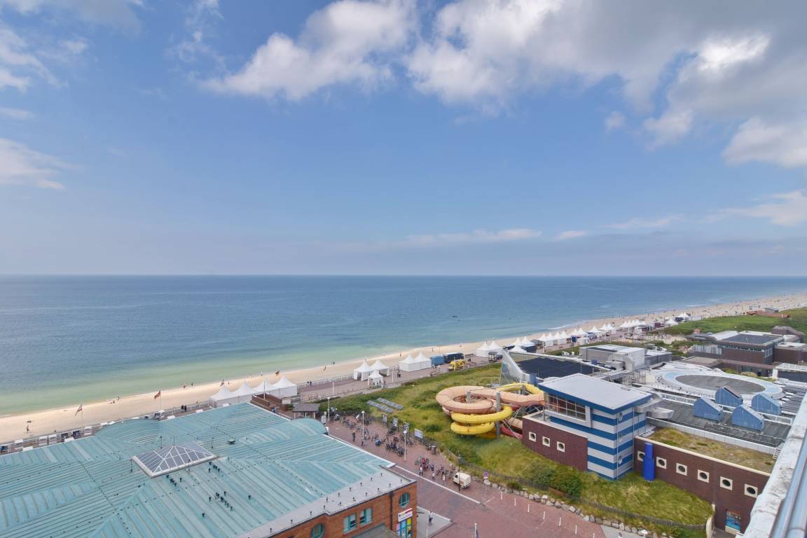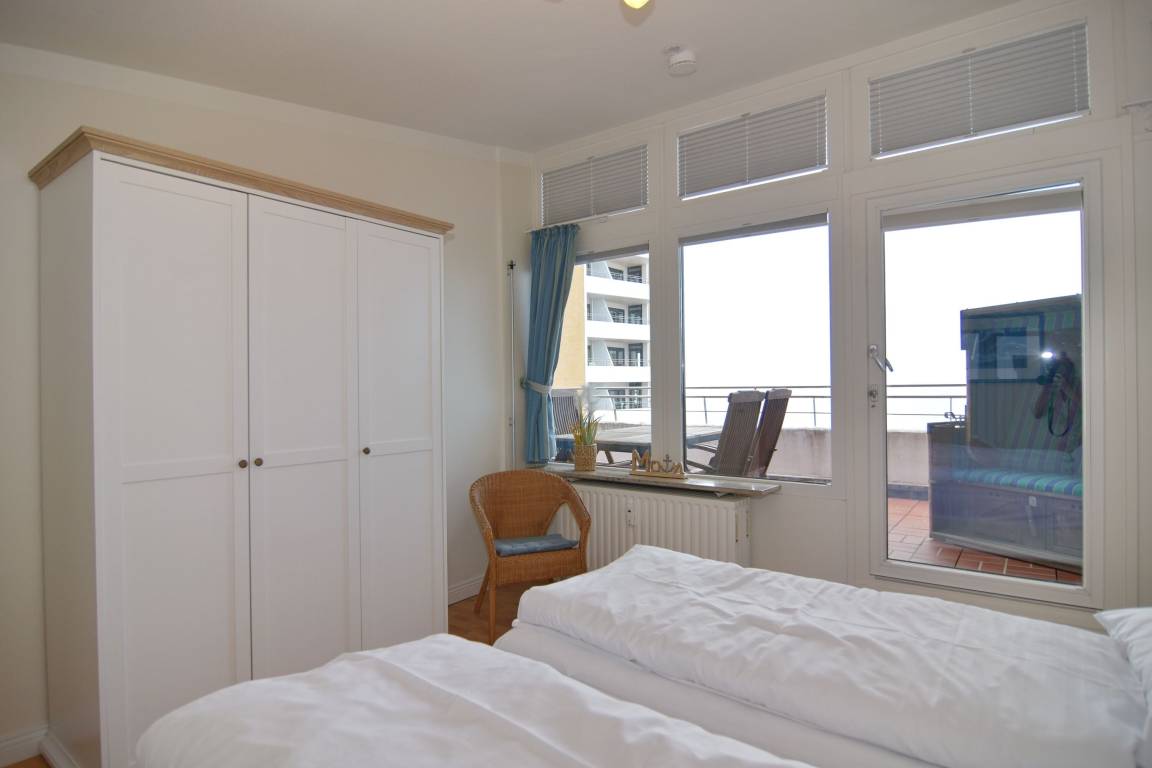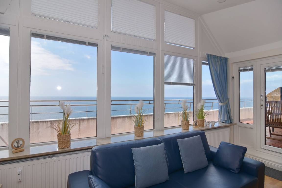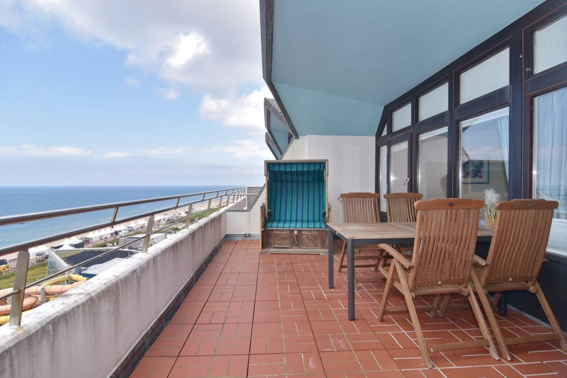 3-Zimmer-Penthouse zur Seeseite im 10.OG mit großer Dachterrasse. Nichtraucher-Whg.! 1 Treppe zur Whg.!. Wohnzimmer mit Sitz- und Essecke (1Schlafcouch), Flat-TV, Stereo, W-Lan (ohne Gewähr), Durchreiche zur separaten Küche mit Geschirrspüler, Backofen, Geschirrspüler, 1 Schlafzimmer mit Doppelbett, 1 Schlafzimmer mit 1 Einzelbett, neues Duschbad/WC mit 2 Waschbecken. Zugang zur Terrasse aus Wohnzimmer und gr. Schlafzimmer, Achtung hoher Absatz! Tierhaltung gestattet - bitte anmelden - Ein Garagen-Stellplatz kann bei Buchungsabschluss zu € 15,--/Nacht gebucht werden. Waschküche und Fahrradkeller befinden sich im Haus. Bettwäsche und Handtücher sind zur Anreise aufgezogen.