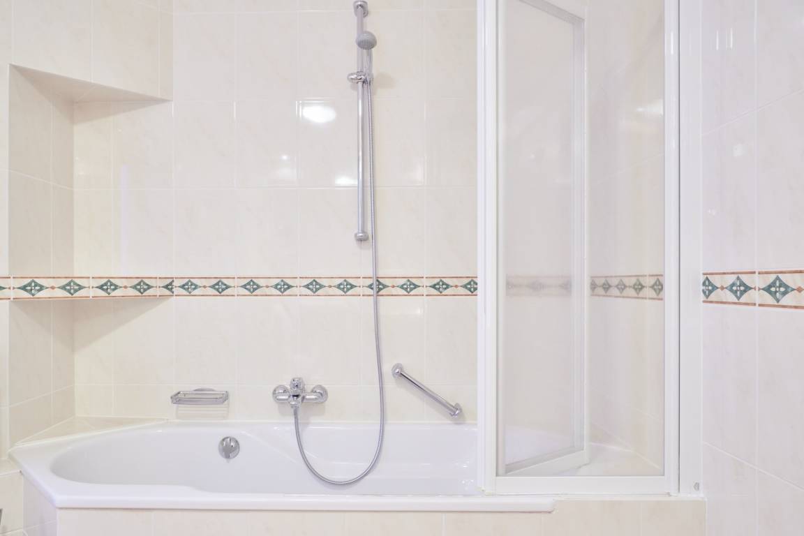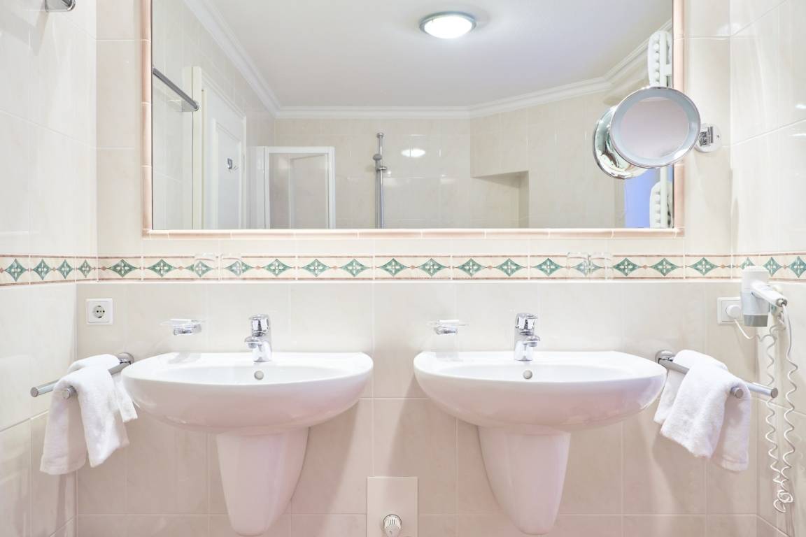 Zwei Badezimmer, einmal mit Wanne, Doppelwaschbecken und WC und ein Duschbad mit WC.