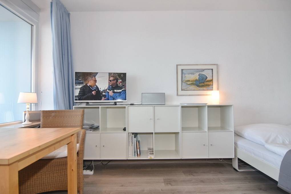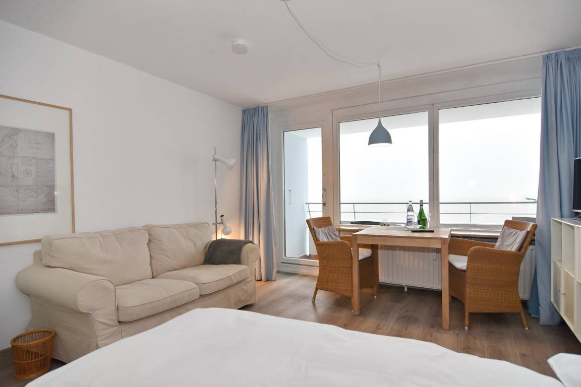 1-Zimmer-Ferienwohnung, ca. 34 qm, Haus Metropol, 9. OG, Seeseite. Wohn-/ Schlafraum mit Designboden, Doppelbett (160x200, 2 Matratzen), Eßplatz am Fenster mit traumhaften Blick auf die Nordsee, 2-Sitzer-Couch, Flat-TV, Internet ( ohne Gewähr), Westbalkon mit Meeresblick, Küchenzeile im Flurbereich mit Geschirrspüler und Mikrowelle, DuschbadWC, Allergikerfreundliche Ausstattung. Bitte in der Wohnung nicht rauchen. Tierhaltung ist nicht gestattet. Bettwäsche und Handtücher sind zur Anreise aufgezogen. Ein PKW-Stellplatz kann kostenpflichtig zugebucht werden.