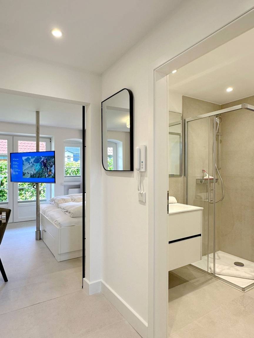 Die Wohnanlage "Olympia" bietet eine zentrale Lage in kurzer Entfernung zur Promenade, dem Badestrand und dem Meer. Auch die Fußgängerzone ist nur wenige Gehminuten entfernt. Die 1-Zimmer-Wohnung liegt im Erdgeschoss, wurde im Jahr 2025 von Grund auf renoviert und ist für 2 Personen ideal geeignet. Sie hat eine Größe von ca. 30 m² und besteht aus einem Wohn- und Schlafzimmer mit Doppelbett, Einbauschränken, Couch und Essplatz sowie einer geschützten Südterrasse mit Gartenmöbeln. Das TV-Gerät ist schwenkbar, sodass sowohl vom Bett als von Couch ferngesehen werden kann. Die integrierte Küche ist mit einem Induktionskochfeld und Kühlschrank ausgestattet. Das moderne Duschbad ist vom Dielenbereich erreichbar. In der Diele befinden sich Einbauschränke und eine Garderobe für Jacken und andere Dinge. WLAN steht zur Verfügung, jedoch ohne Gewähr. Das Mitbringen von Haustieren und das Rauchen sind nicht gestattet. Bei Anreise sind Bettwäsche und Handtücher bereits aufgezogen. Die Wohnanlage verfügt über einen Schwimmbad- und Saunabereich sowie einen zusätzlichen Wellnessbereich mit finnischer Sauna, Dampfsauna und Ruhebereich. Fahrzeuge können gegen Gebühr und vorheriger Anmeldung in der Tiefgarage abgestellt werden. Waschmaschinen und ein Trockner stehen kostenfrei zur Verfügung. Für Fahrräder gibt es einen Abstellbereich in der Garage.