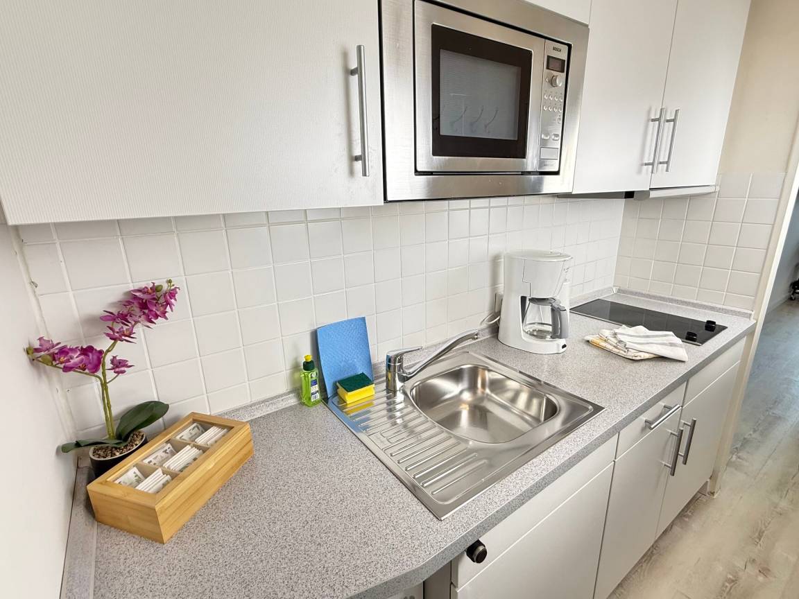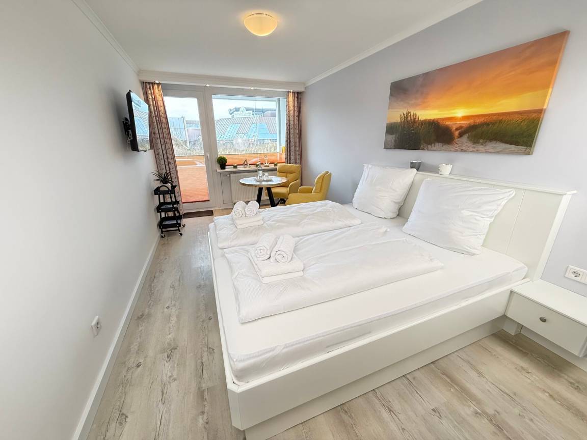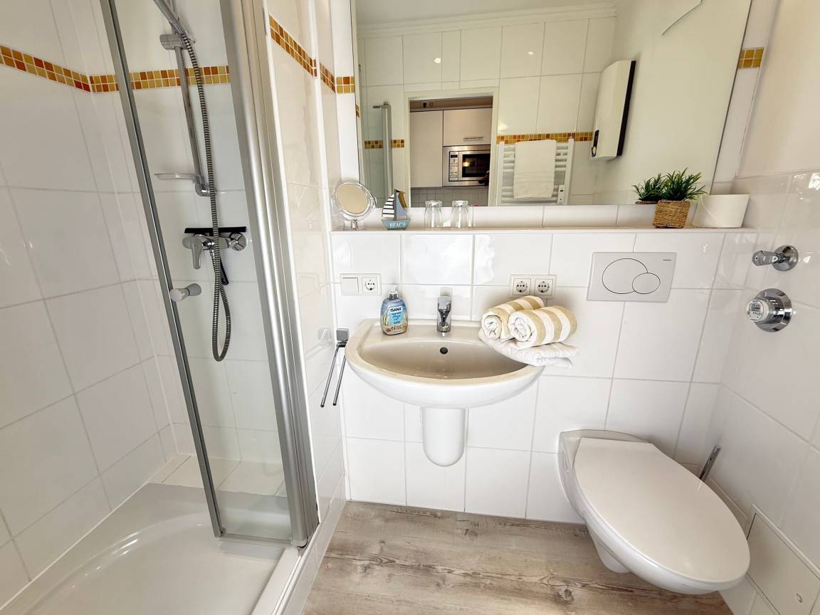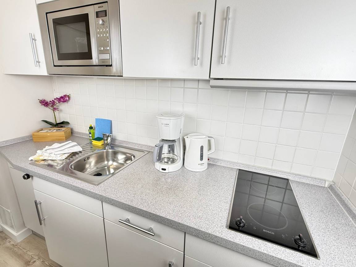 Moderne City-Ferienwohnung mit feststehendem Doppelbett zur Seeseite!1-Zimmer-Nichtraucher-Ferienwohnung zum Wohlfühlen (ca. 25 qm), im Hochparterre zur Seeseite mit Westloggia (Nachmittagssonne, mit Balkonmöbeln und Auflagen) ideal für 1-2 Personen.Vom Vorflur mit Garderobe und Küchenzeile gelangt man in das kombinierte Wohn-/Schlafzimmer (mit Austritt zur Loggia) und in das Duschbad/WC.Der Wohn-/Schlafraum mit trendaktuellem Designerboden in Holzoptik ist mit 2 bequemen Polster-Dreh-Stühlen, einem dazugehörigen Esstisch, feststehendem Tischler-Einbau-Doppelbett (Komforthöhe, Liegefläche 1,80 x 2 m - Einzelmatratzen) mit Ambientebeleuchtung, Tischler-Einbau-Kleiderschrank mit Schiebetüren, Kabel-Flachbild-TV mit Wandhalterung (+ Schwenkarm) und einem Radio ausgestattet. Die Küchenzeile besitzt ein Cerankochfeld (2 Kochfelder), eine Mikrowelle mit Grillfunktion und einen Kühlschrank mit 3*-Gefrierfach. Kaffeemaschine, Wasserkocher und Toaster gehören zur Grundausstattung. Im modernen Badezimmer befinden sich eine Dusche mit flachem Einstieg, ein Waschtisch, Handtuchtrockner, Fön und das WC.Eine Duplex-Garage kann für 8,00 €/Tag oder ein PKW-Außenstellplatz für 14,00 €/Tag mit gebucht werden (begrenztes Kontingent!).