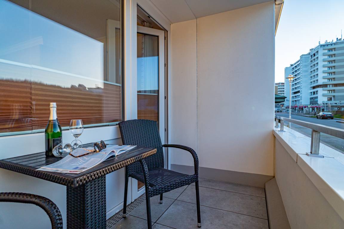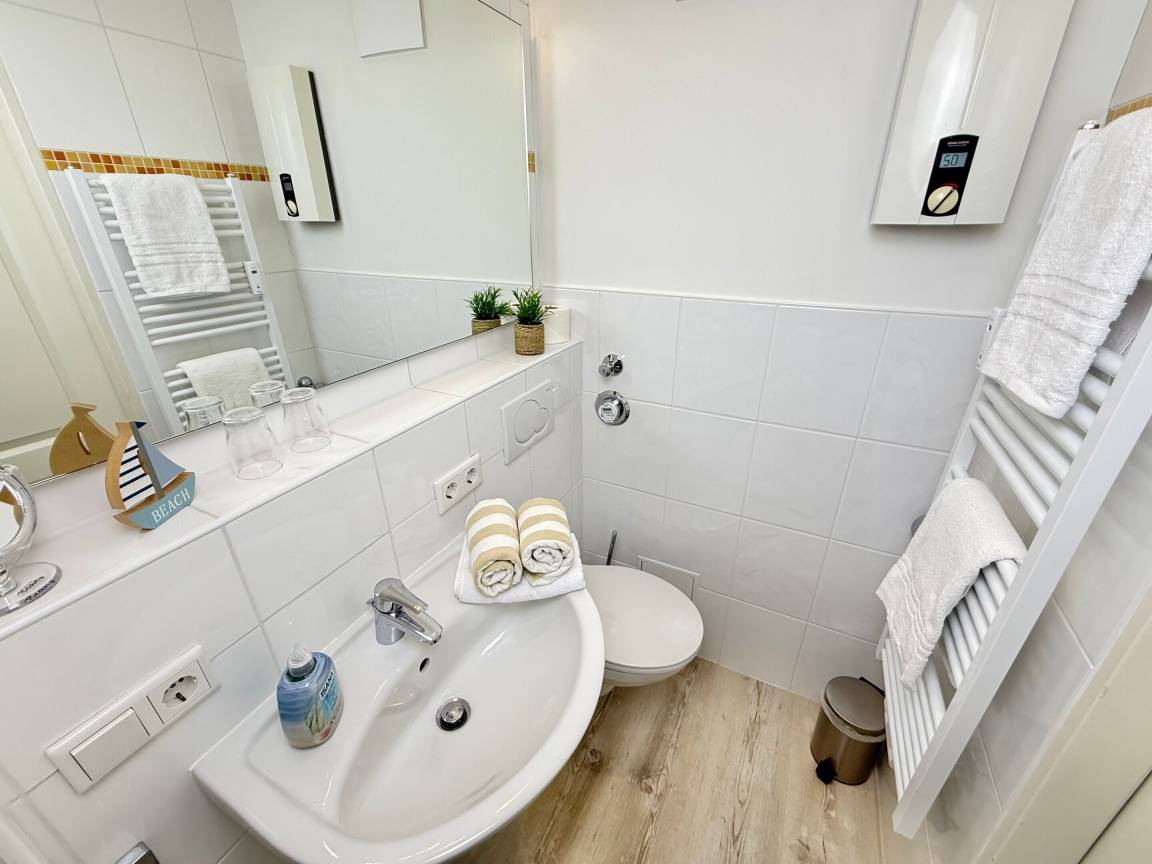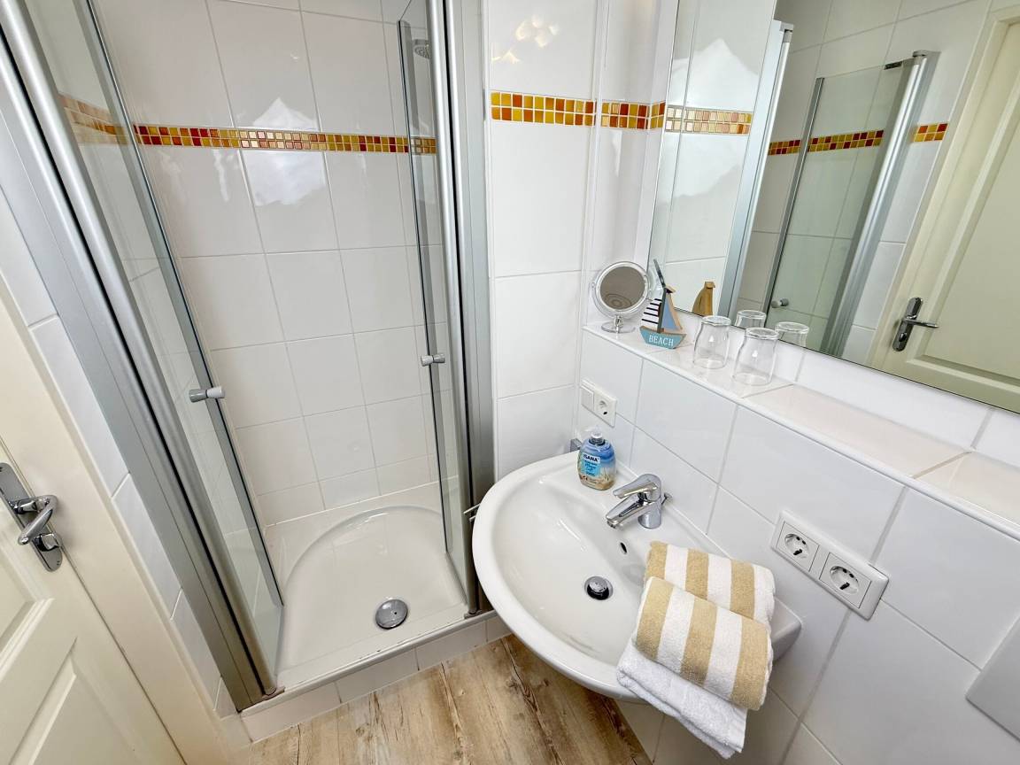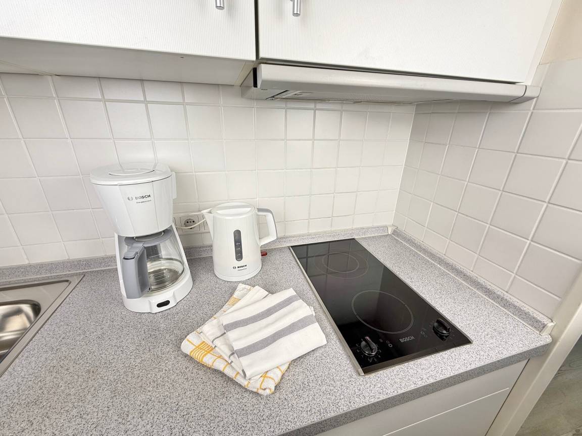 Moderne City-Ferienwohnung mit feststehendem Doppelbett zur Seeseite!1-Zimmer-Nichtraucher-Ferienwohnung zum Wohlfühlen (ca. 25 qm), im Hochparterre zur Seeseite mit Westloggia (Nachmittagssonne, mit Balkonmöbeln und Auflagen) ideal für 1-2 Personen.Vom Vorflur mit Garderobe und Küchenzeile gelangt man in das kombinierte Wohn-/Schlafzimmer (mit Austritt zur Loggia) und in das Duschbad/WC.Der Wohn-/Schlafraum mit trendaktuellem Designerboden in Holzoptik ist mit 2 bequemen Polster-Dreh-Stühlen, einem dazugehörigen Esstisch, feststehendem Tischler-Einbau-Doppelbett (Komforthöhe, Liegefläche 1,80 x 2 m - Einzelmatratzen) mit Ambientebeleuchtung, Tischler-Einbau-Kleiderschrank mit Schiebetüren, Kabel-Flachbild-TV mit Wandhalterung (+ Schwenkarm) und einem Radio ausgestattet. Die Küchenzeile besitzt ein Cerankochfeld (2 Kochfelder), eine Mikrowelle mit Grillfunktion und einen Kühlschrank mit 3*-Gefrierfach. Kaffeemaschine, Wasserkocher und Toaster gehören zur Grundausstattung. Im modernen Badezimmer befinden sich eine Dusche mit flachem Einstieg, ein Waschtisch, Handtuchtrockner, Fön und das WC.Eine Duplex-Garage kann für 8,00 €/Tag oder ein PKW-Außenstellplatz für 14,00 €/Tag mit gebucht werden (begrenztes Kontingent!).