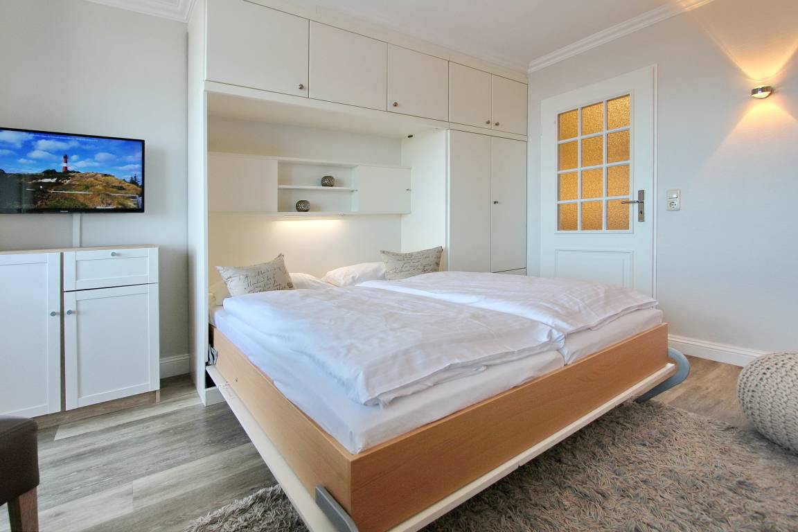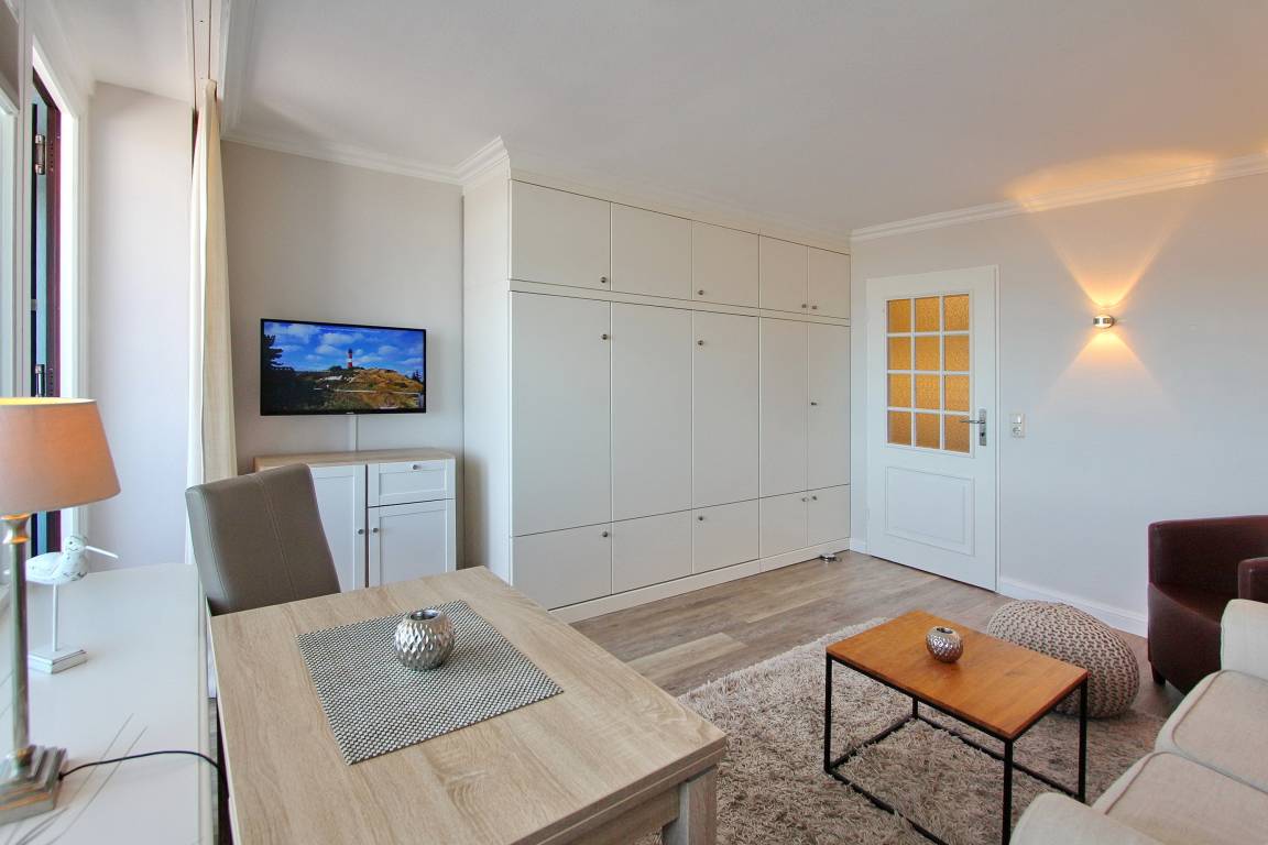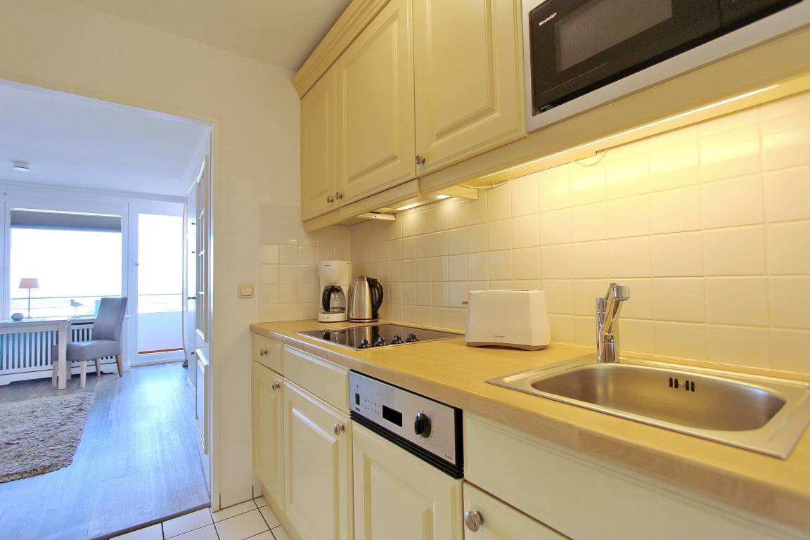 Herrlicher Weitblick über Insel und Stadt, bei klarem Wetter auf das nordfriesische Wattenmeer bis zum Festland aus der 13. Etage im Haus Metropol. Hell, freundlich und modern eingerichteter Wohn-/Schlafraum mit vorgelagertem Ostbalkon. Neben einem Doppelschrankbett befindet sich in der Schrankwand auch reichlich Stauraum für ihre Kleidung und Habseligkeiten und am Fenster gibt es einen Essplatz mit 2 Stühlen. Wenn die Sonne scheint, können sie bei Sonnenschein frühstücken und den tollen Blick genießen. Zum Lesen und Fernsehgucken gibt es eine bequeme 2er Couch und einen Sessel. Das Badezimmer verfügt über eine Dusche. Die kleine, aber feine, Einbauküche im Flur hat ein Ceranfeld und einen Geschirrspüler. Flachbild-TV, Radio mit CD Player gehören zur Ausstattung dieser Nichtraucherwohnung dazu. Der freie WLAN Hotspot (WEG Haus Metropol - Passwortfrei - ohne Gewähr) steht ihnen kostenfrei zur Verfügung. Wohnungsgröße: ca. 30 m².