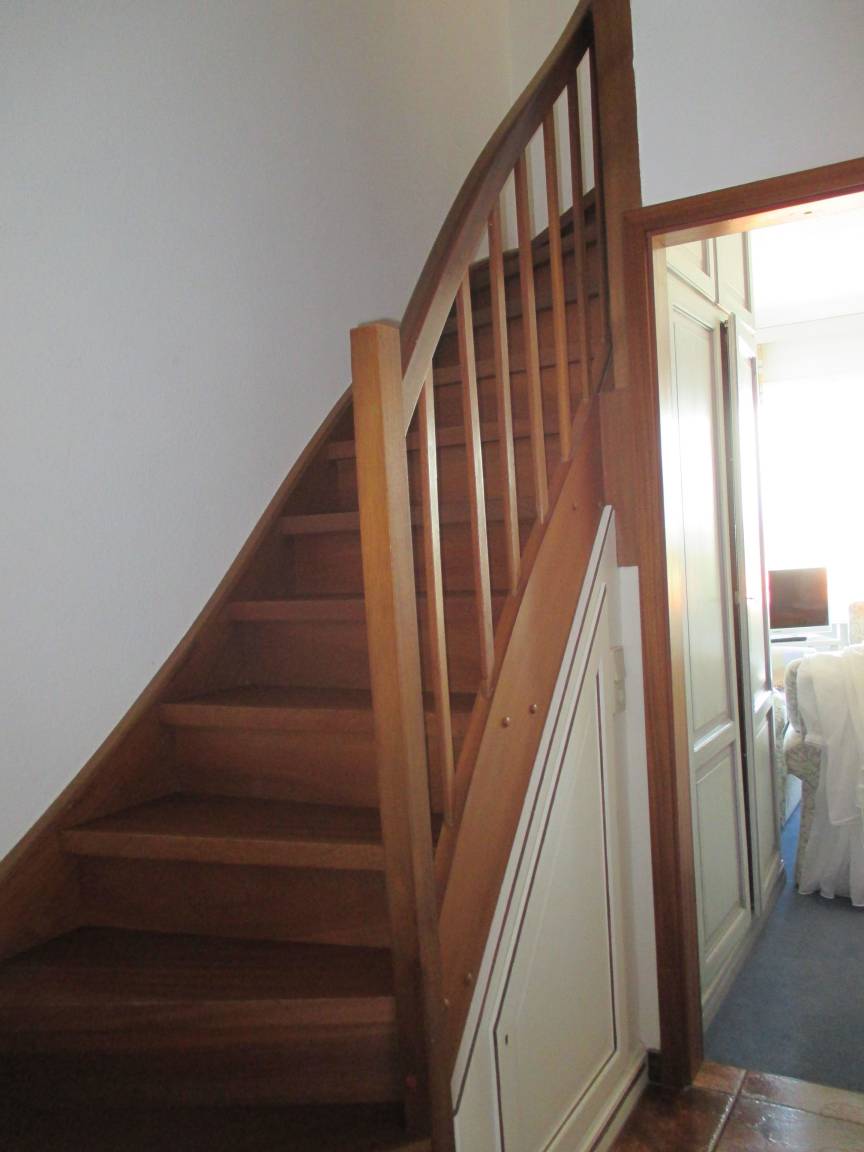 Die beiden Schlafzimmer in der oberen Etage haben Dachschrägen und sind mit einem Doppelbett (1,60m breit) sowie zwei einzelnen Betten ausgestattet. Vom Wohnzimmer mit Küchenzeile aus tritt man auf einen hellen Balkon mit Morgensonne. Die Küchenzeile ist mit vier Herdplatten und Kochgeschirr ausgestattet. Im Wohnzimmer befindet sich ein Flachbild-Fernseher. Die Wohnung besitzt ein Duschbad auf der unteren Etage.