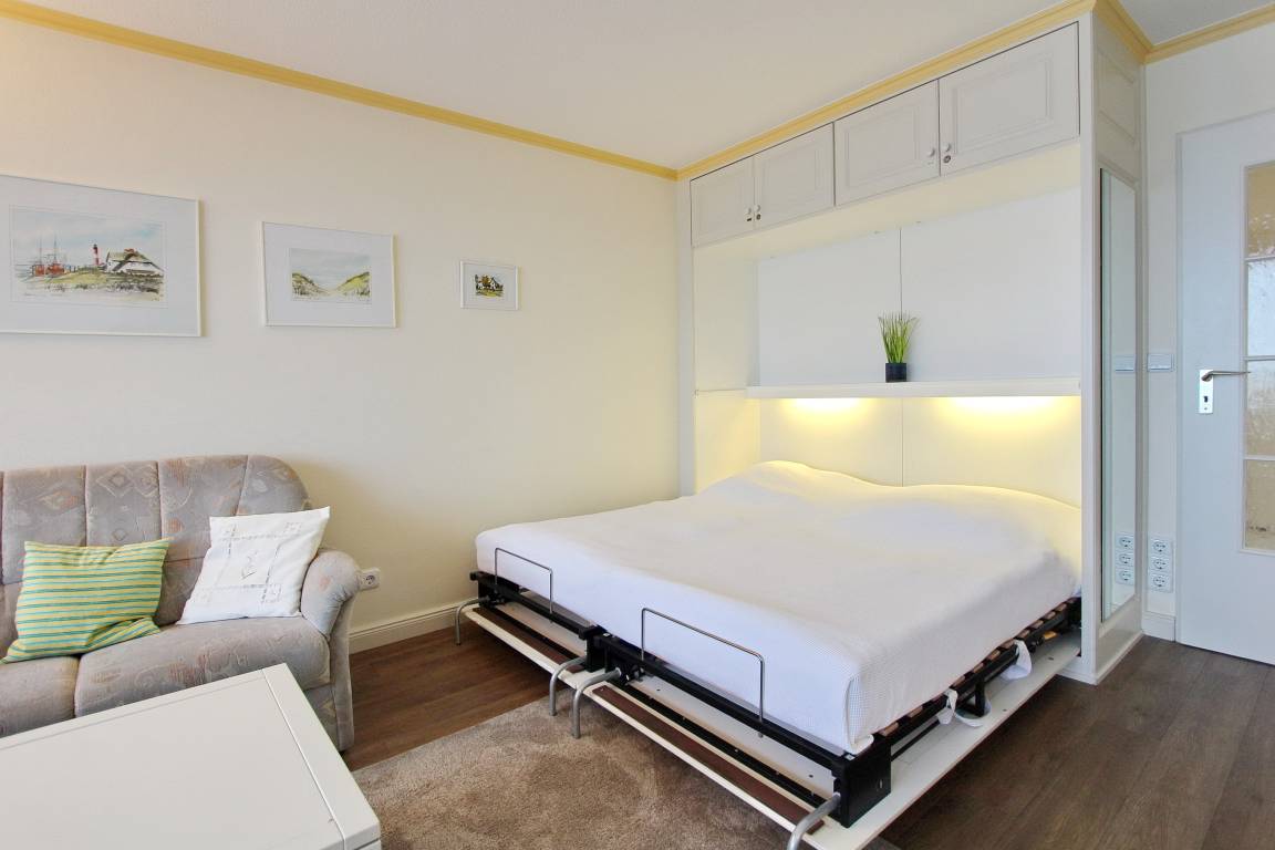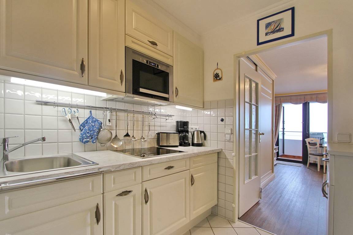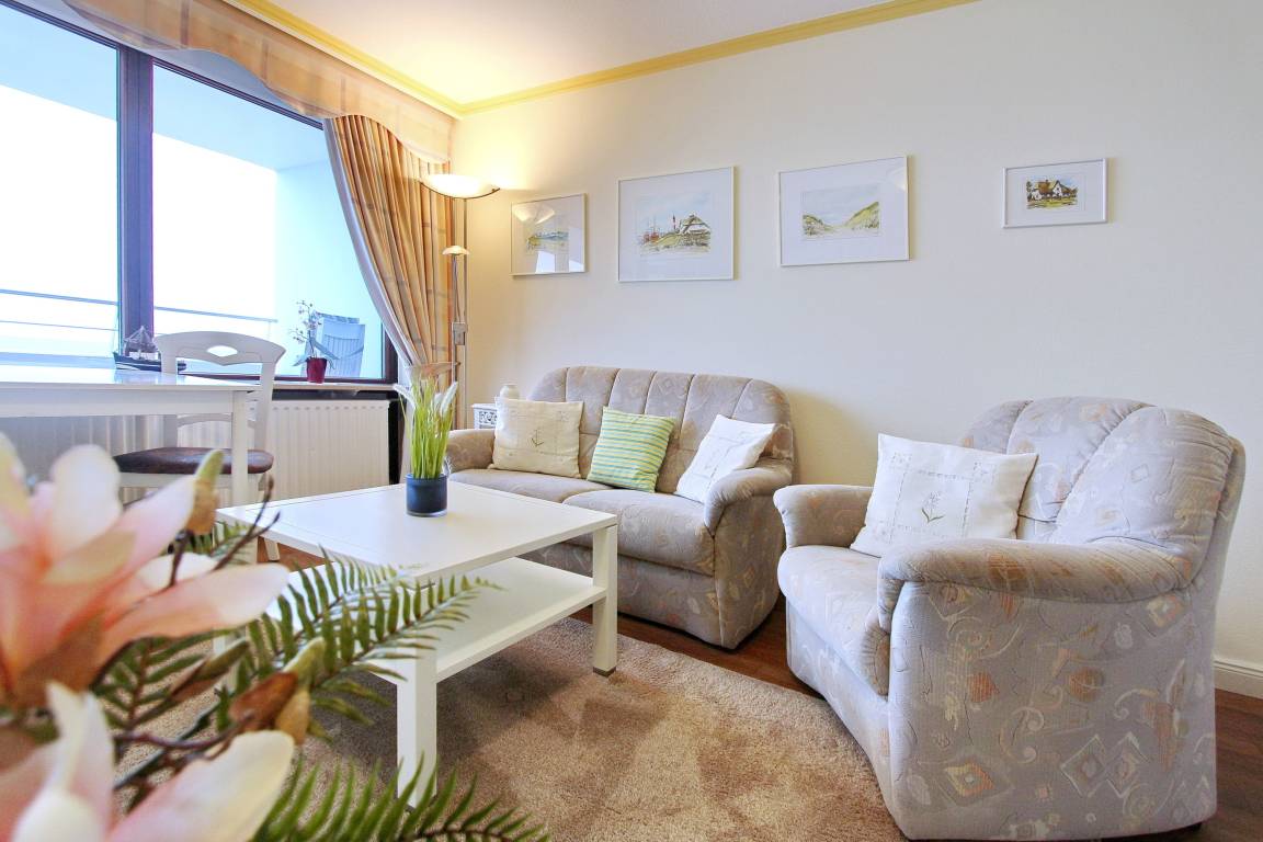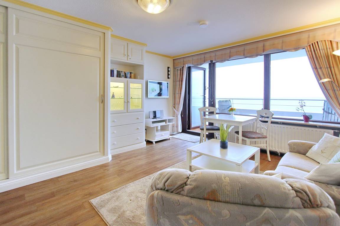 Schöne Einzimmerwohnung in der 4. Etage im Haus Metropol mit herrlichem Weitblick über den Strand und die Nordsee. Der kombinierte Wohn-/Schlafraum mit vorgelagertem Westbalkon (Balkonmöbel inkl.) verfügt über Einzelschrankbetten mit 2 Matratzen (Einstieg nur von einer Seite), einen Essplatz mit 2 Stühlen am Fenster sowie eine komfortable, ansprechende Sitzgruppe mit Sessel. In der Wohnung wurde Designfussboden in Holzoptik verlegt, was für besondere Gemütlichkeit sorgt. Es gibt ein Badezimmer mit Dusche, sowie eine Einbauküche mit Mikrowelle im Flur. Zur technischen Ausstattung dieser Wohnung gehört: ein Flachbildfernsehe und ein Radio. Ein freies WLAN Netzwerk (WEG Haus Metropol - Passwortfrei - ohne Gewähr) steht ihnen ebenfalls kostenfrei zur Verfügung. Wohnungsgröße: ca. 34 m².