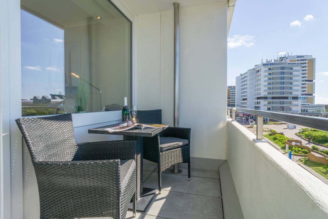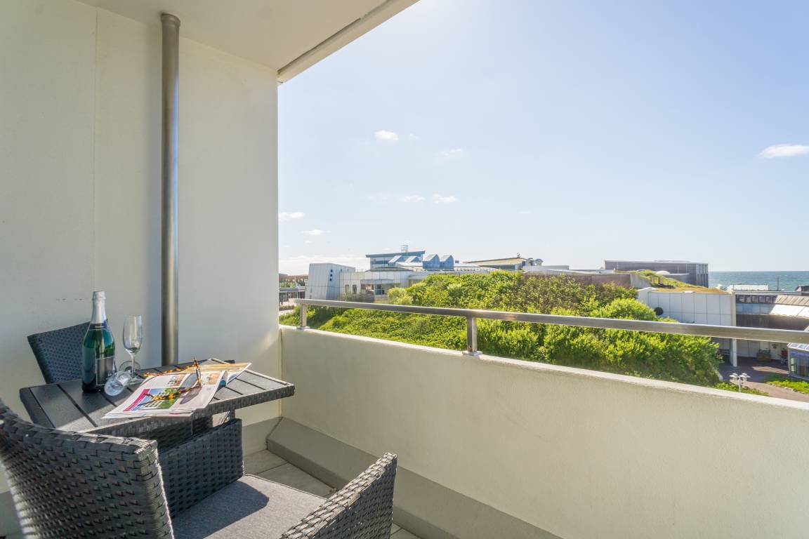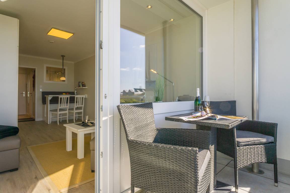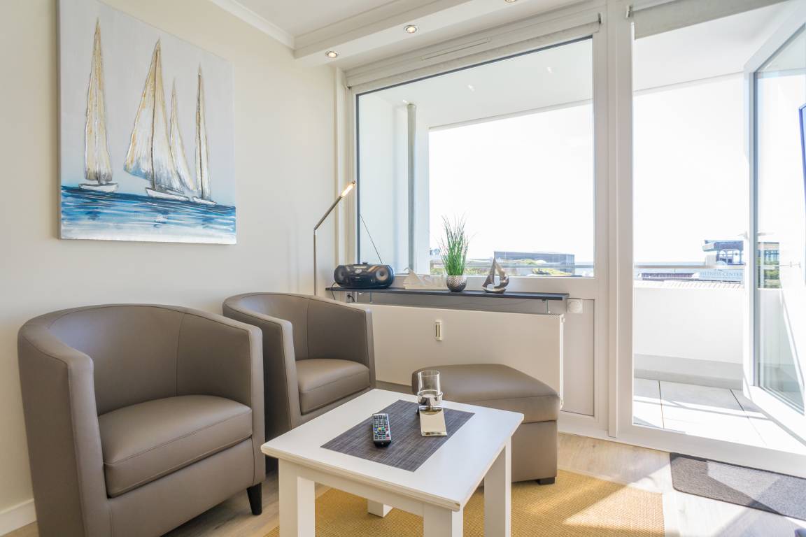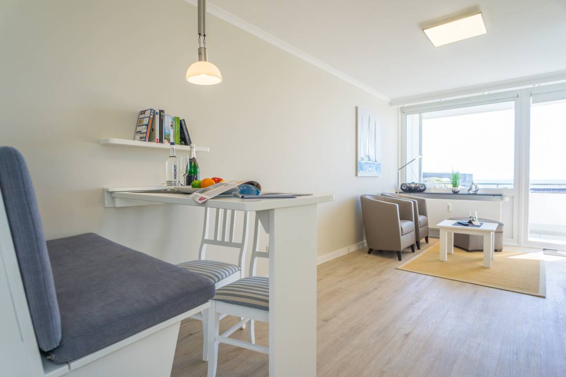 1-Zimmer-Nichtraucher-Ferienwohnung (ca. 25 qm) mit modernem Designerboden in Holzoptik, in der 3. Etage, mit Meerblick zur Seeseite mit Westloggia (Nachmittagssonne, mit Balkonmöbeln und Auflagen) für max. 2 Personen.
