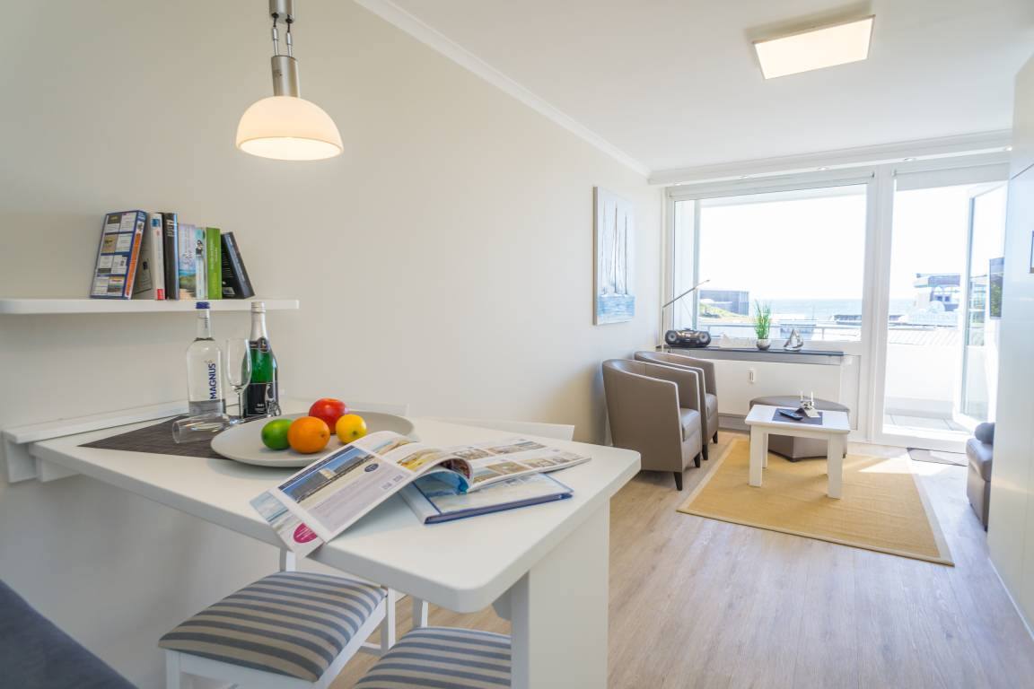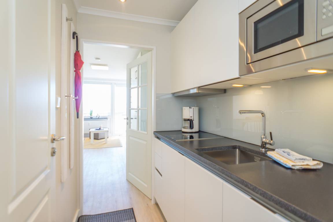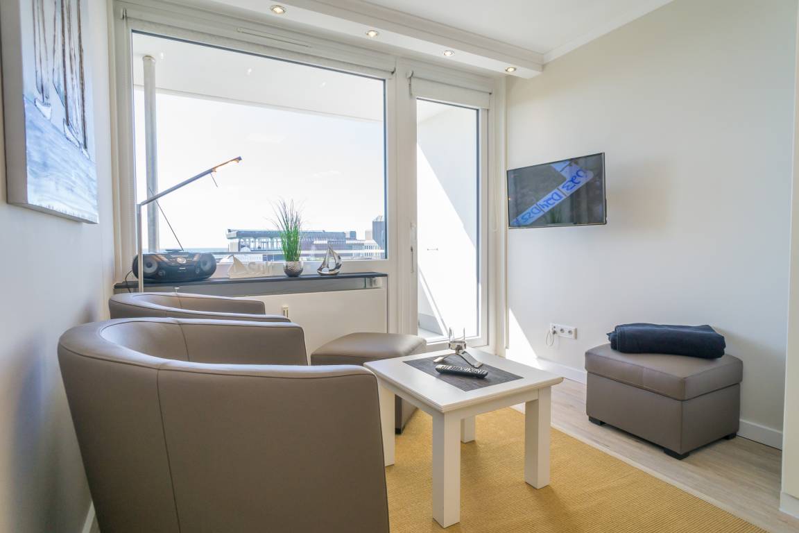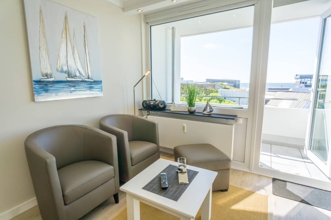 1-Zimmer-Nichtraucher-Ferienwohnung (ca. 25 qm) mit modernem Designerboden in Holzoptik, in der 3. Etage, mit Meerblick zur Seeseite mit Westloggia (Nachmittagssonne, mit Balkonmöbeln und Auflagen) für max. 2 Personen.