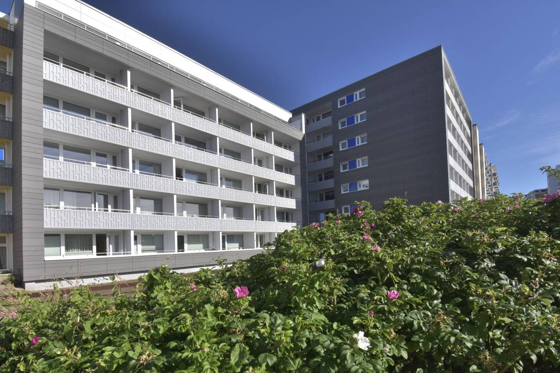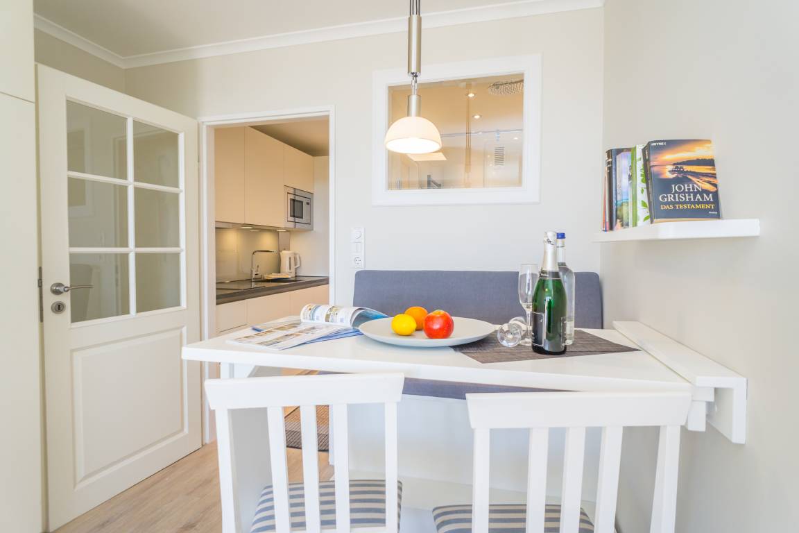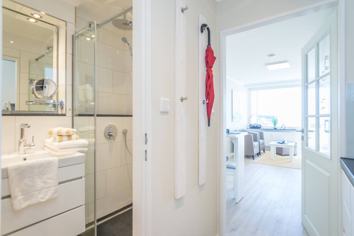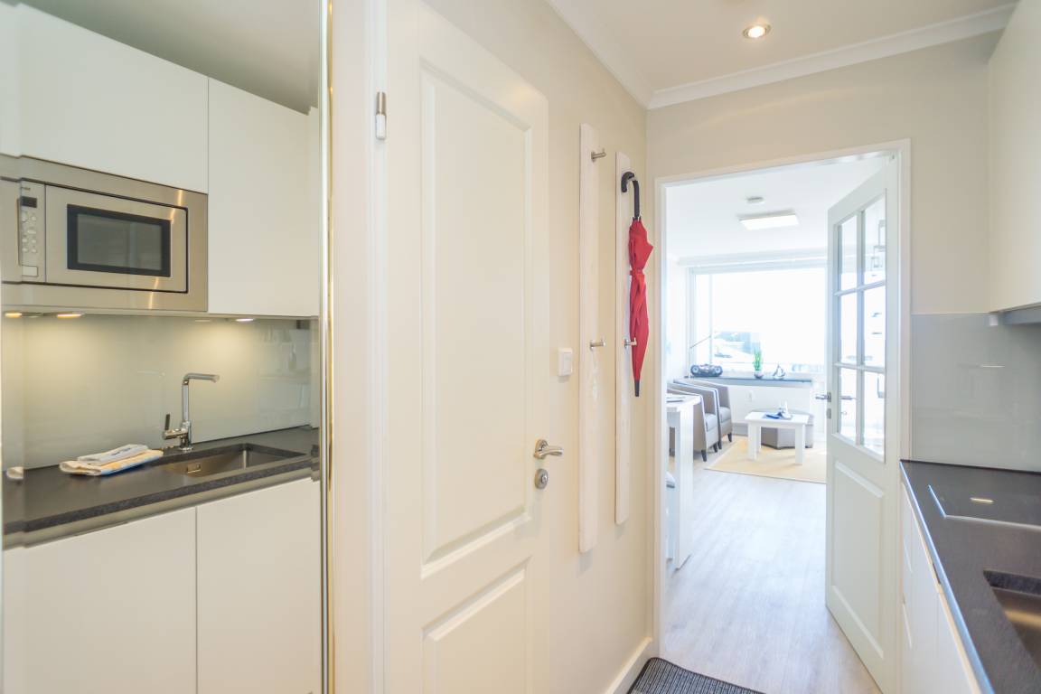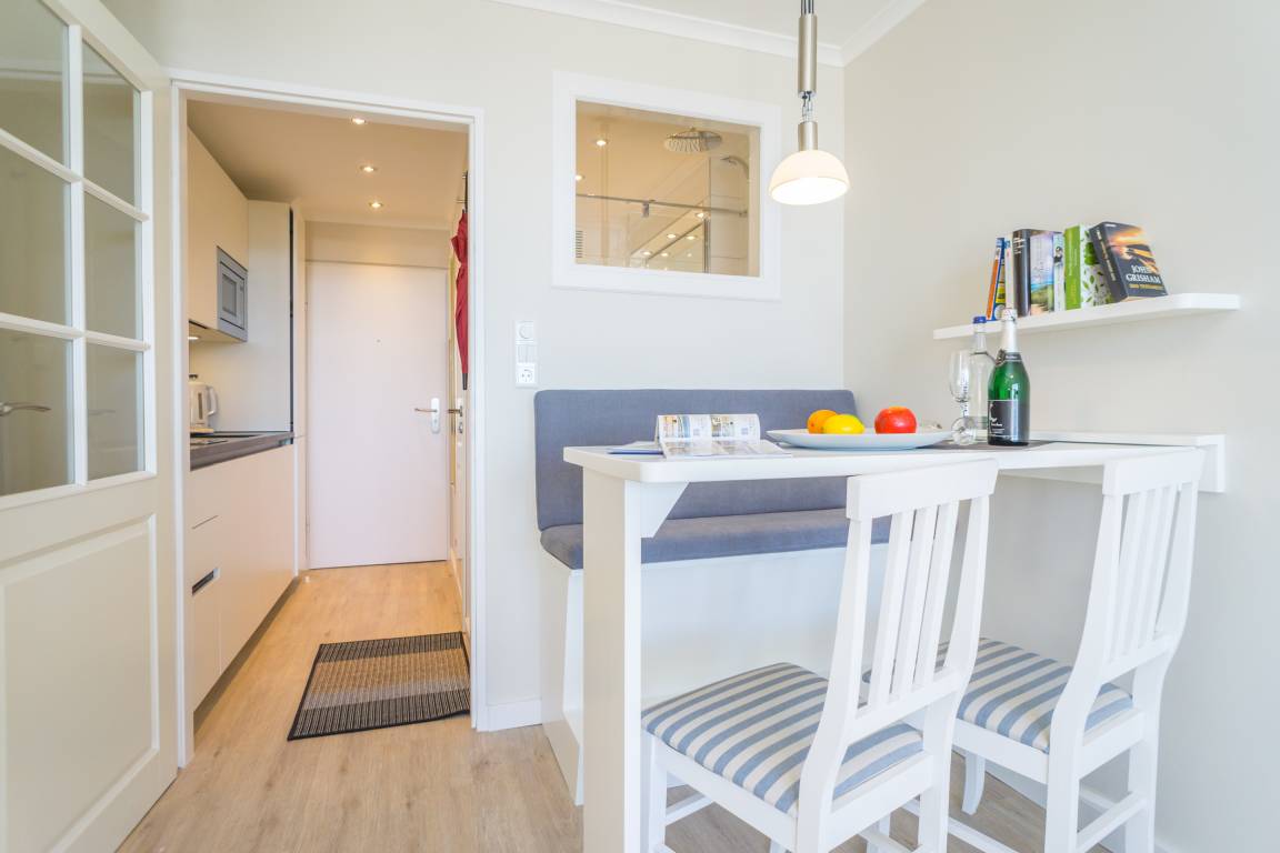 1-Zimmer-Nichtraucher-Ferienwohnung (ca. 25 qm) mit modernem Designerboden in Holzoptik, in der 3. Etage, mit Meerblick zur Seeseite mit Westloggia (Nachmittagssonne, mit Balkonmöbeln und Auflagen) für max. 2 Personen.