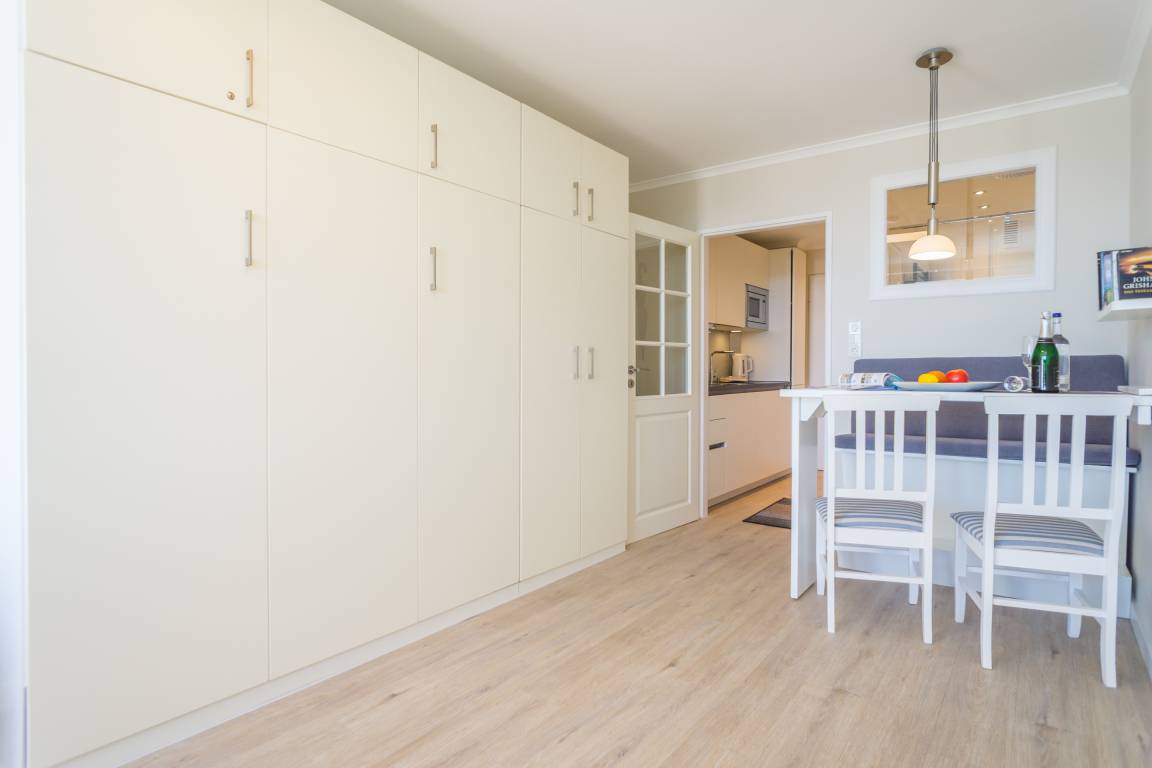 Im Wohn-/Schlafraum stehen zwei Cocktailsessel, ein separater gemütlicher Essplatz, ein Doppelschrankbett (Liegefläche 1,60 x 1,98 m), 1 Kleiderschrank, 1 Kabel-Flachbild-TV und Radio/CD-Player zu Verfügung.