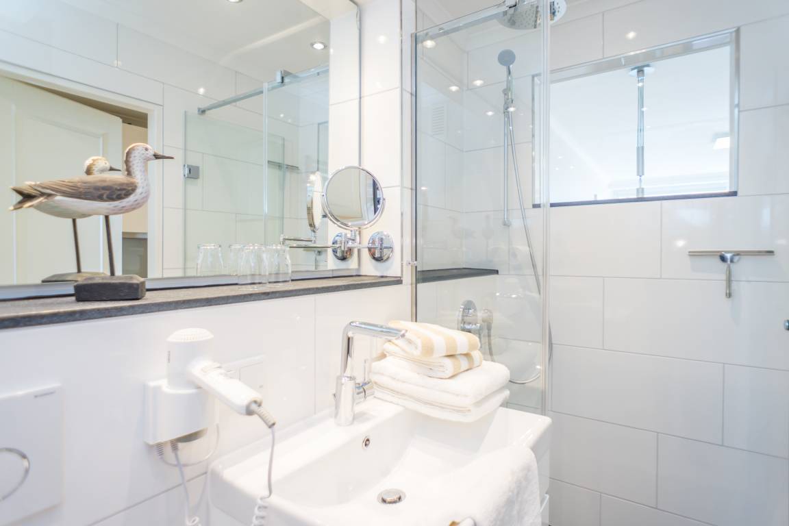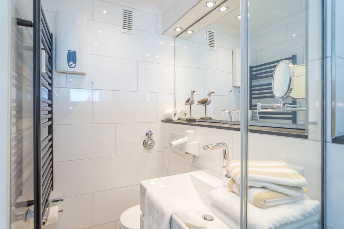 Das Badezimmer ist mit einer Dusche, einem Waschtisch, WC und Fön ausgestattet.