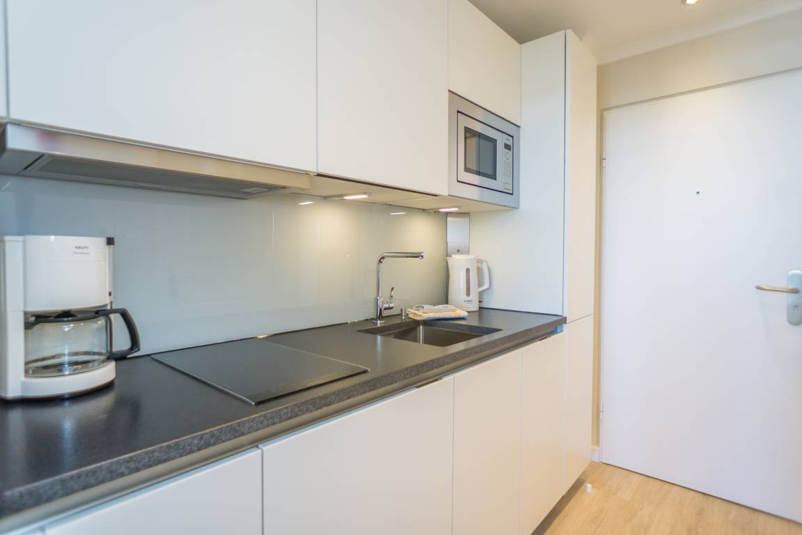Die helle Küchenzeile hat einen 2-Plattenherd, einen Geschirrspüler, eine Nespresso-Maschine, eine Mikrowelle und einen Kühlschrank mit 3*-Gefrierfach.
