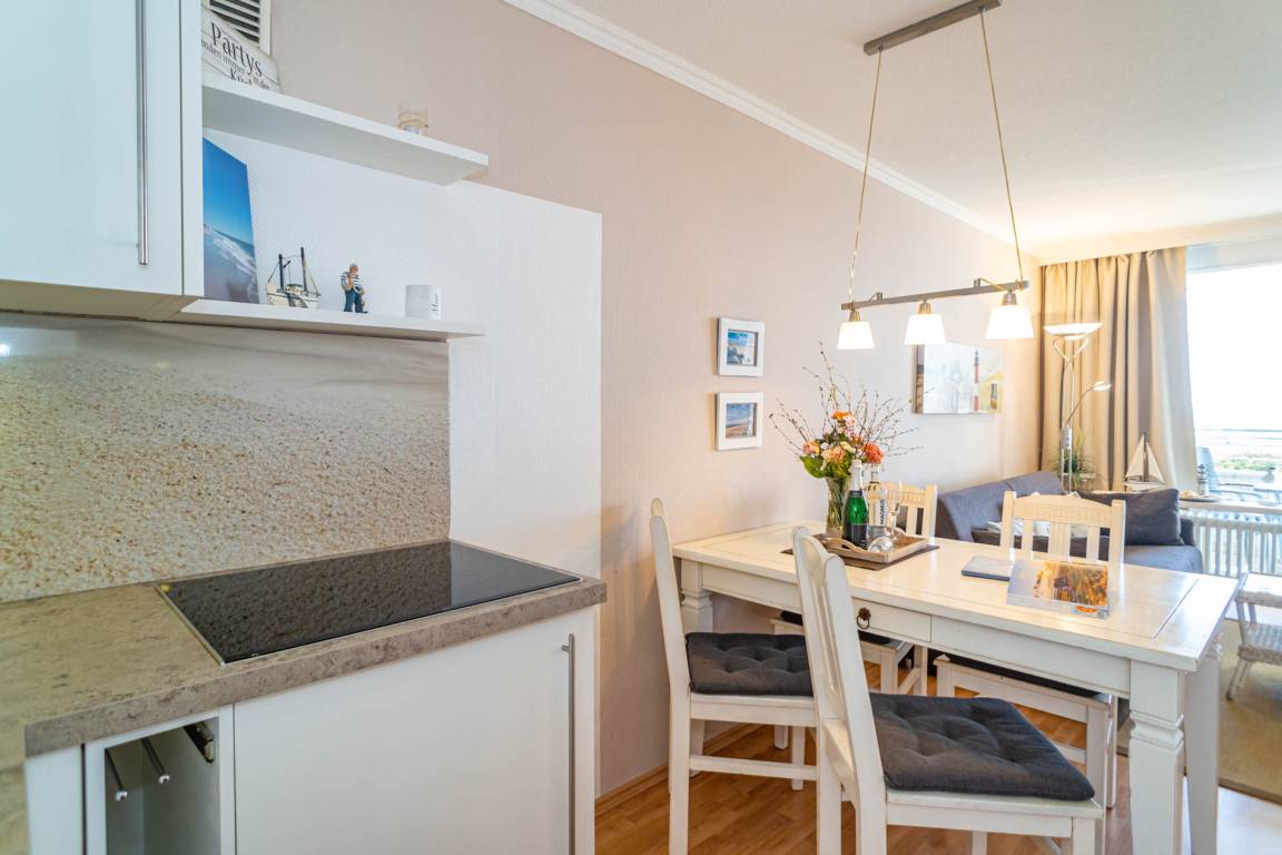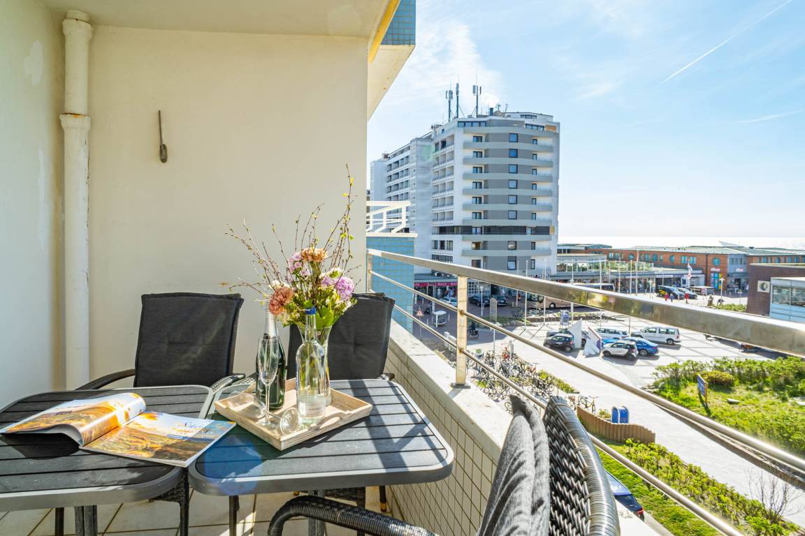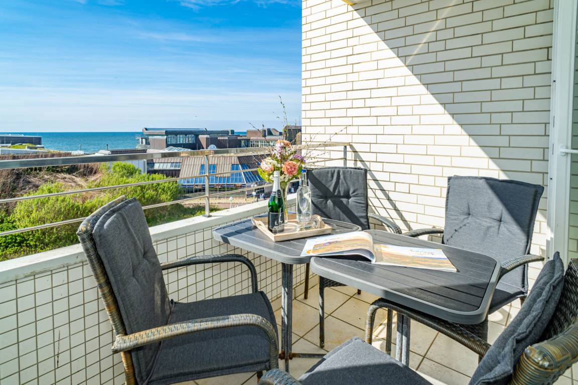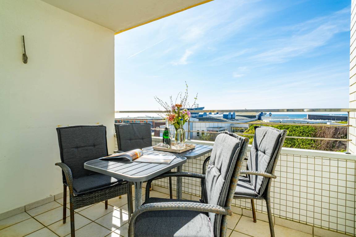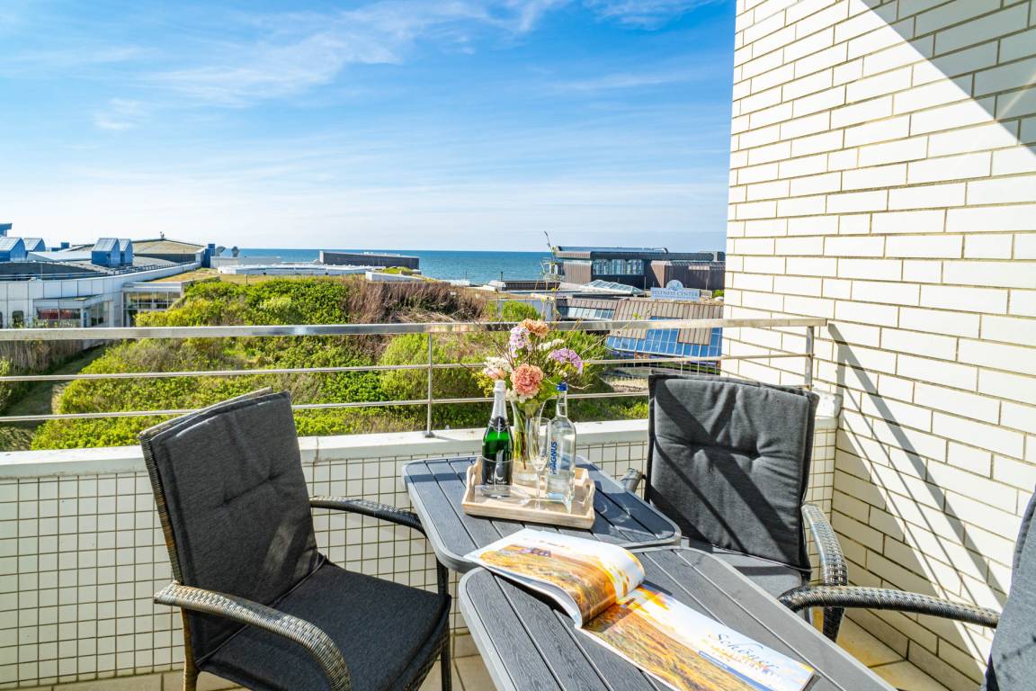 2-Zimmer-Nichtraucher-Ferienwohnung, ca. 54 m², in der 4. Etage zur Seeseite mit tollem Meerblick und sonniger Westloggia (Nachmittags- und Abendsonne, mit Balkonmöbeln und Auflagen) für max. 4 Personen.