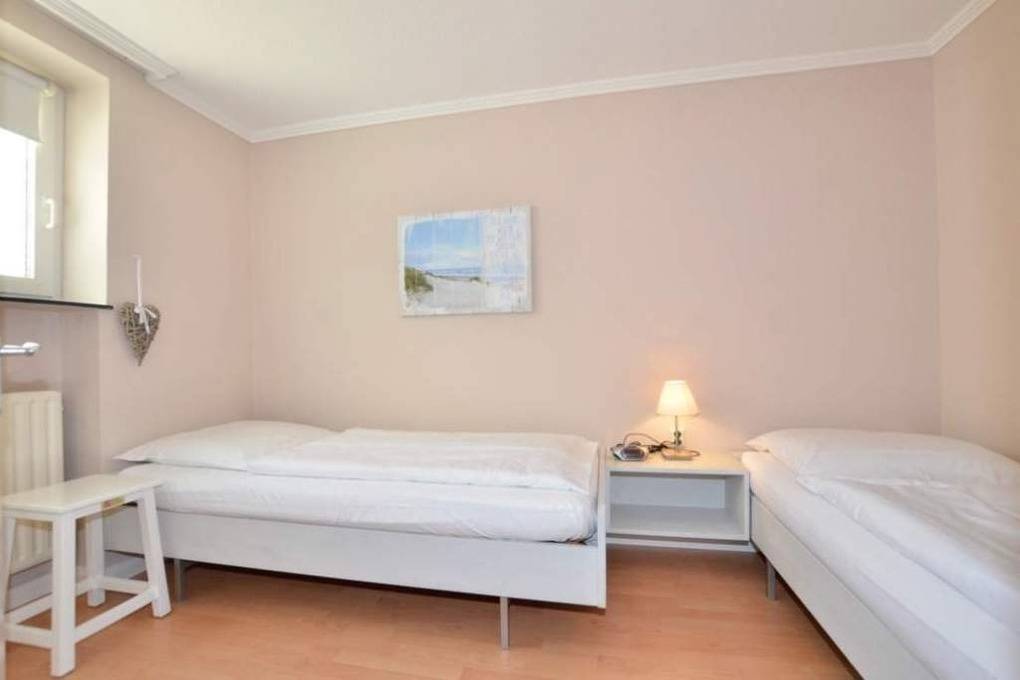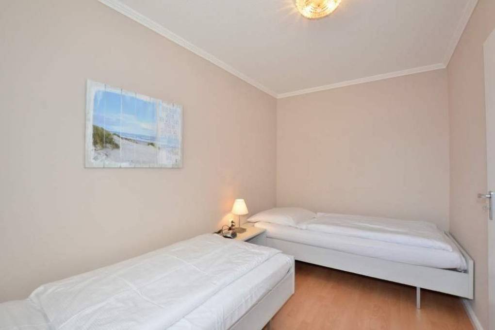 Das Schlafzimmer ist mit zwei über Eck stehenden Einzelbetten und hochwertigen Kaltschaummatratzen ausgestattet.