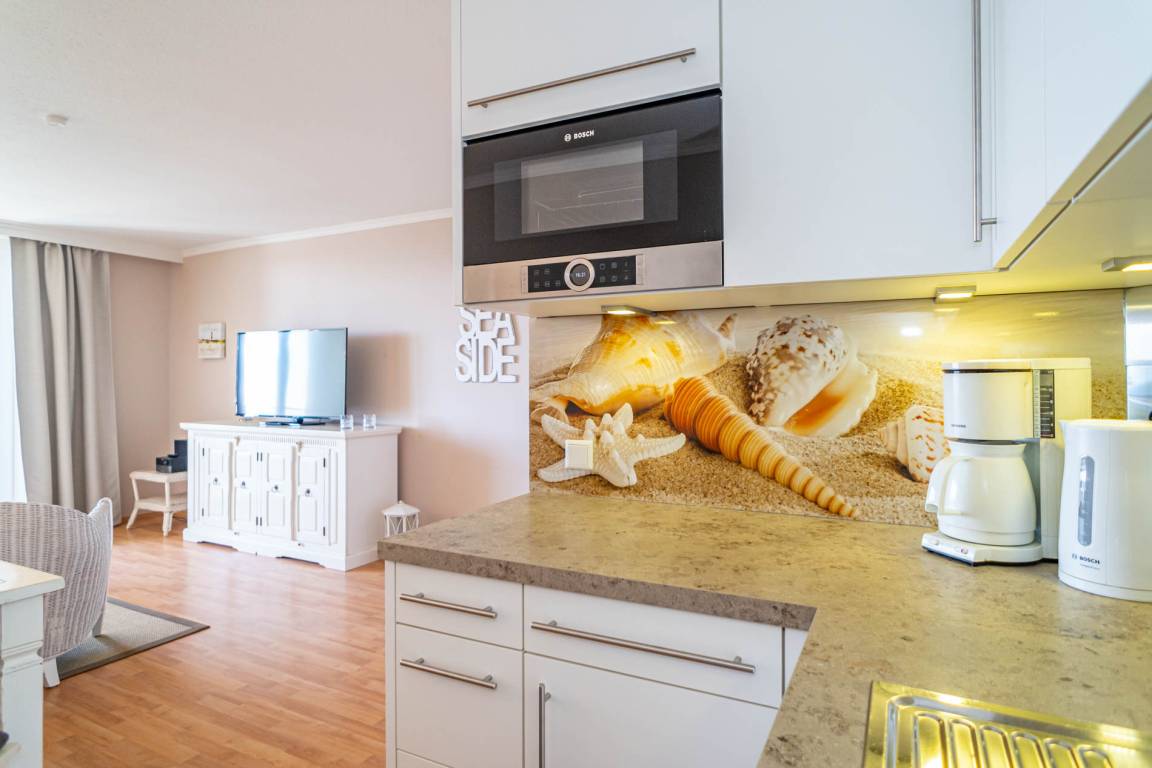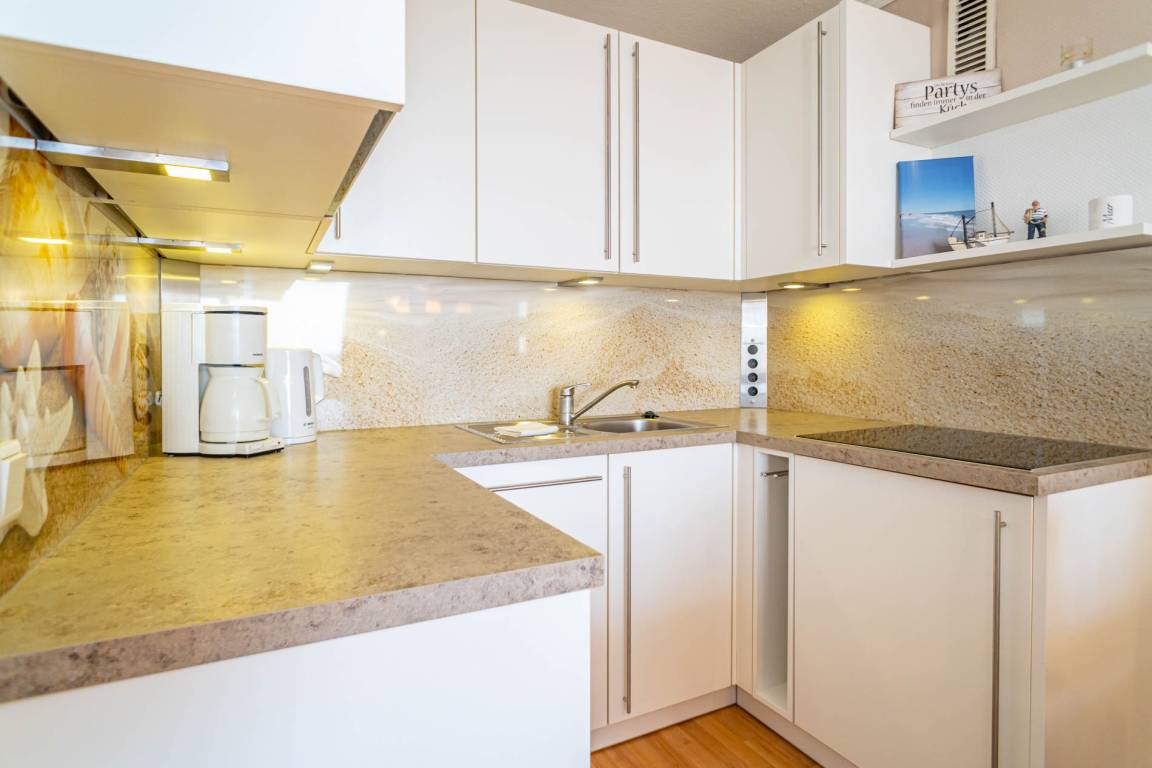 Die moderne, voll ausgestattete Einbauküche hat einen Geschirrspüler, eine Mikrowelle, ein Ceranfeld mit 4 Kochfeldern und einen Kühlschrank mit 3*-Gefrierfach. Kaffeemaschine, Wasserkocher und Toaster gehören zur Grundausstattung.