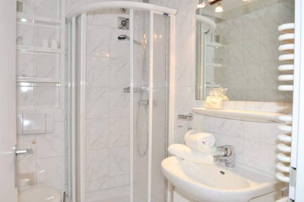Im Bad befinden sich eine Dusche, ein WC, ein Waschtisch und ein Handtuchtrockner. Haustiere sind in dieser Ferienwohnung nicht gestattet.