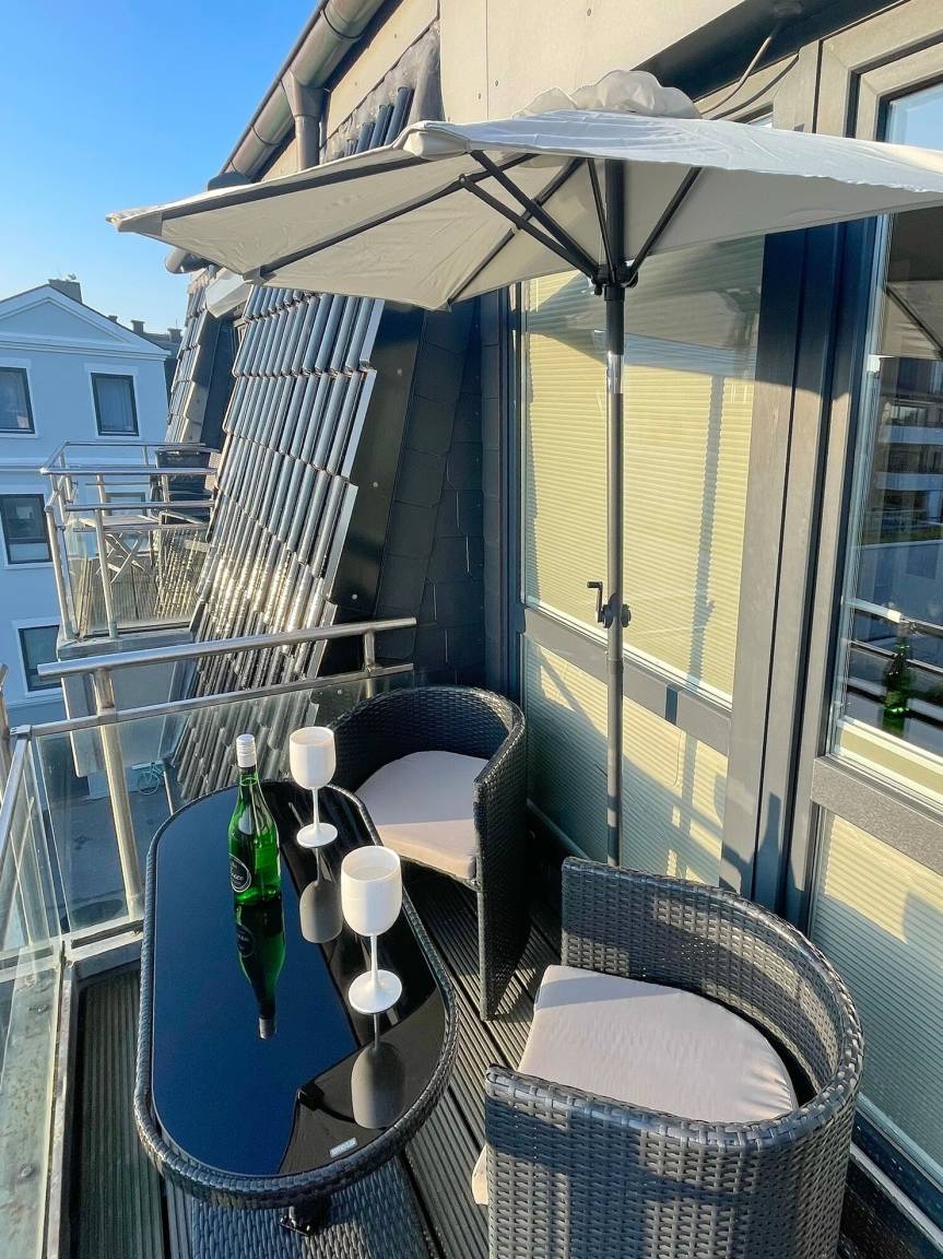 Schöne 2-Zimmer-Wohnung in Innenstadtlage auf 2 Etagen. Ca. 50qm, 3. Etage (Fahrstuhl vorhanden). Wohnzimmer mit Couch mit Schlaffunktion (140x200 cm), 2 Sessel, Essplatz, TV und Musikanlage, WLAN (ohne Gewähr), offene Küche mit Geschirrspüler, Backofen und Mikrowelle, Westbalkon mit Balkonmöbeln. Auf der Ebene befindet sich ein kleines Duschbad/WC. Im offenen Dachgeschoß befindet sich ein Schlafzimmer mit Box-Springbett (160x200 cm ), Kleiderschrank und Flat-TV sowie ein weiteres Duschbad/WC. Die Etage ist über eine Wendeltreppe erreichbar. Duplex-Garagenstellplatz (Bedienungsanleitung dringend beachten, Nutzung auf eigene Gefahr, nicht für SUV/Kombi geeignet, max. Maße/Gewichte: 500 cm Länge, 180 cm Breite, 150 cm Höhe, max. 2.000 kg Gewicht, max. 500 kg Radlast). Nichtraucher-Appartement. Tierhaltung ist nicht gestattet. Bettwäsche und Handtücher sind zur Anreise aufgezogen.