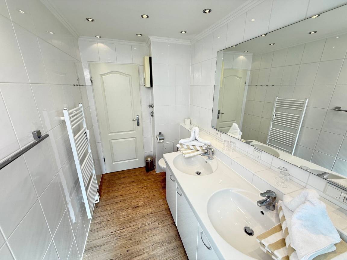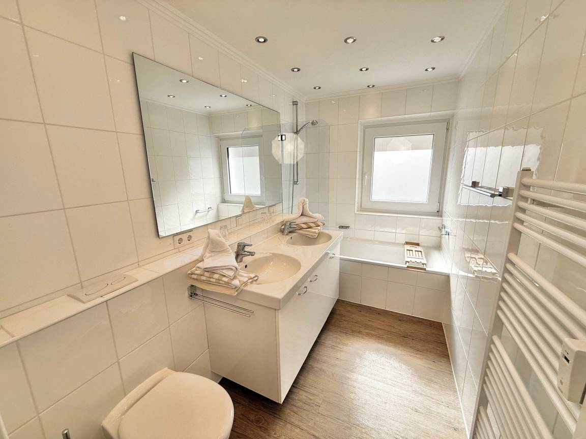 Das neue großzügige Bad hat eine Badewanne mit Duschmöglichkeit und Glastrennwand, einen Doppelwaschtisch, einen Handtuchtrockner, ein WC und einen Fön.