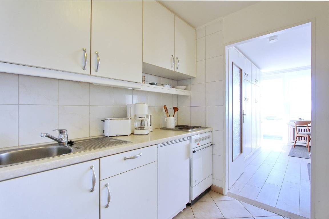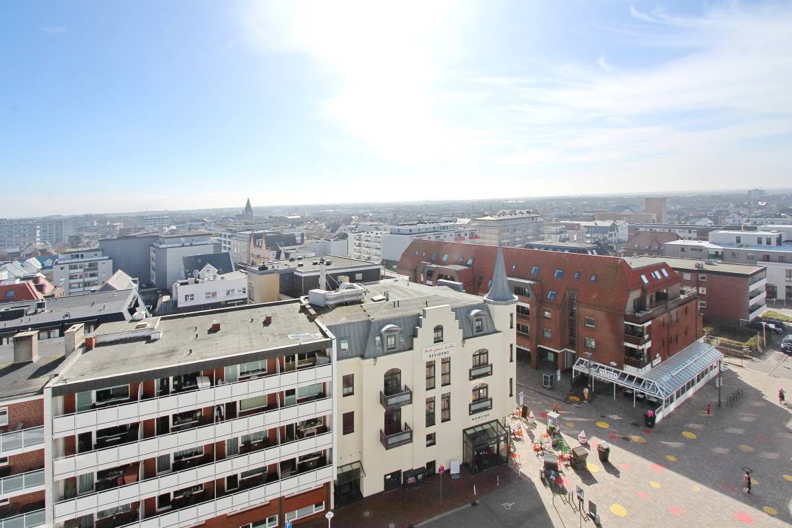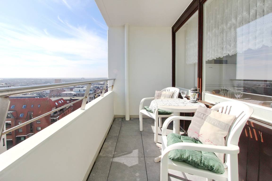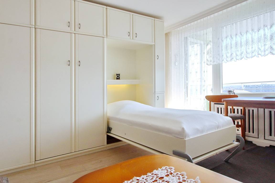 Einzimmerwohnung in der 7. Etage des Haus am Meer mit unmittelbarer Strand- und Innenstadtlage. Der kombinierte Wohn-/Schlafraum mit vorgelagertem Ostbalkon (Balkonmöbel und Auflagen sind vorhanden) ist eingerichtet mit Einzelschrankbetten, einem Essplatz am Fenster mit 2 Stühlen und einer Sitzgruppe mit Couch und Sessel. Das moderne, Badezimmer verfügt über eine Dusche mit flachem Einstieg. In der Küchenzeile im Flur mit Backofen und 3 Platten Herd können sie sich selbst verpflegen. Zur technischen Ausstattung gehört: ein Flachbildfernseher und ein Radio. Das passwortfreie Netzwerk (WEG Haus am Meer - Passwortfrei - ohne Gewähr) können sie kostenfrei nutzen. Wohnungsgröße: ca. 32 m².