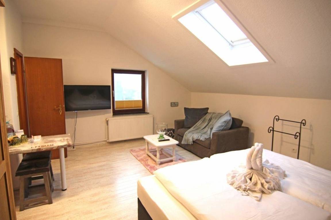 Dieses geräumige Doppel - Zimmer liegt im Dachgeschoss des Hauses.