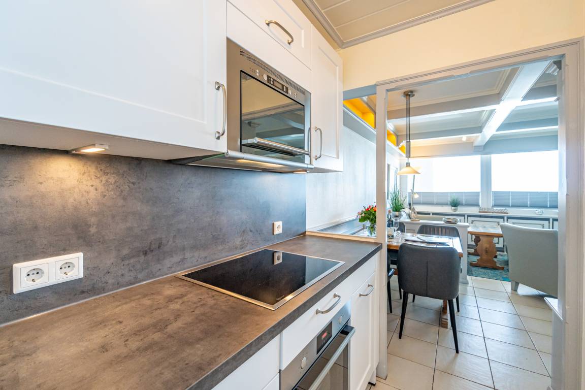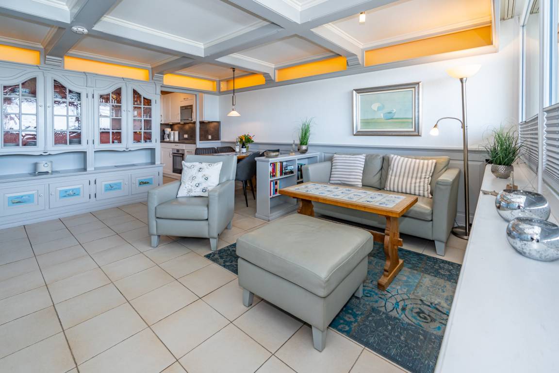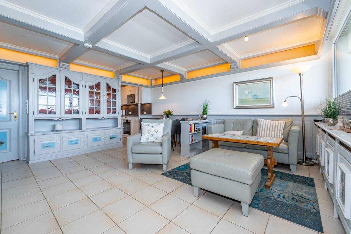 Der Wohnraum besteht aus einer besonders hochwertigen Sitzgarnitur von Bielefelder Werkstätten (2-Sitzer-Couch und ein Sessel mit Fußhocker), einem Essplatz und einer schönen, zum Wohnraum hin geöffneten Küche.