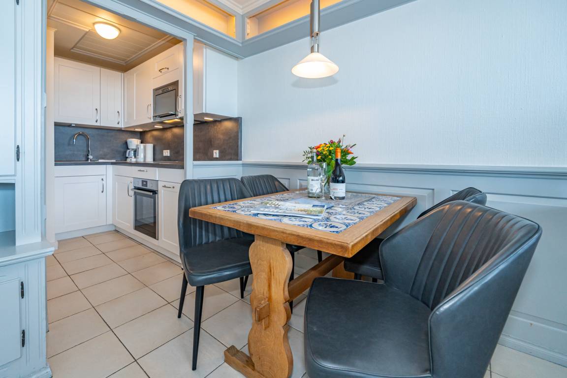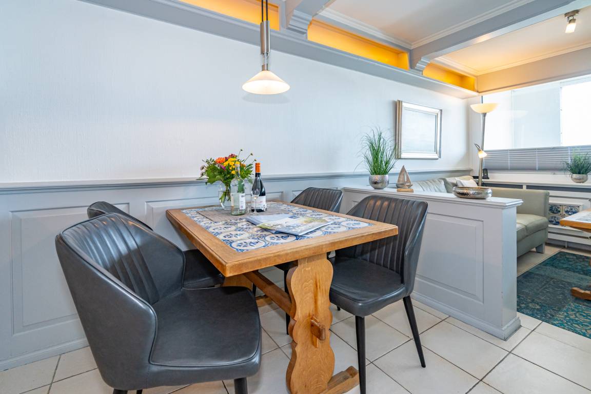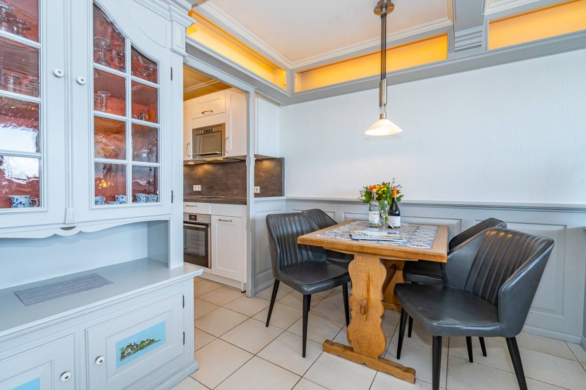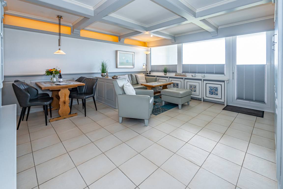 Der Wohnraum besteht aus einer besonders hochwertigen Sitzgarnitur von Bielefelder Werkstätten (2-Sitzer-Couch und ein Sessel mit Fußhocker), einem Essplatz und einer schönen, zum Wohnraum hin geöffneten Küche.
