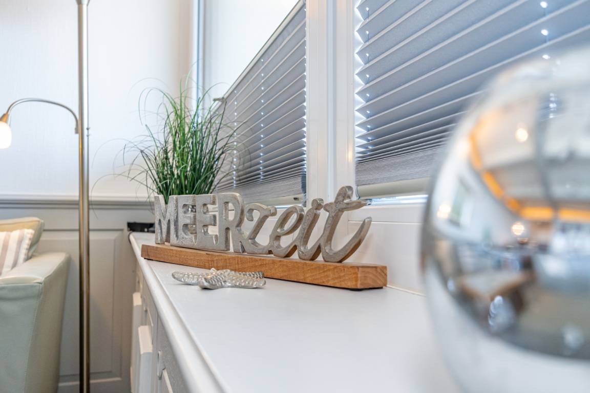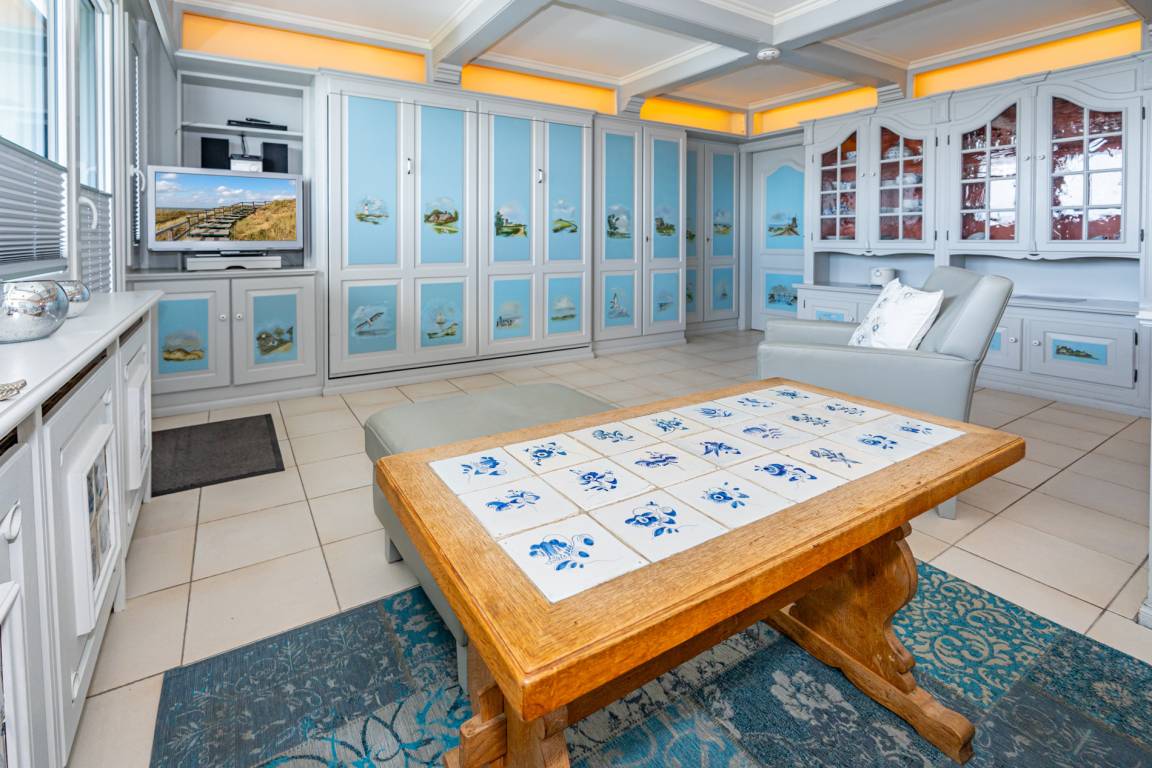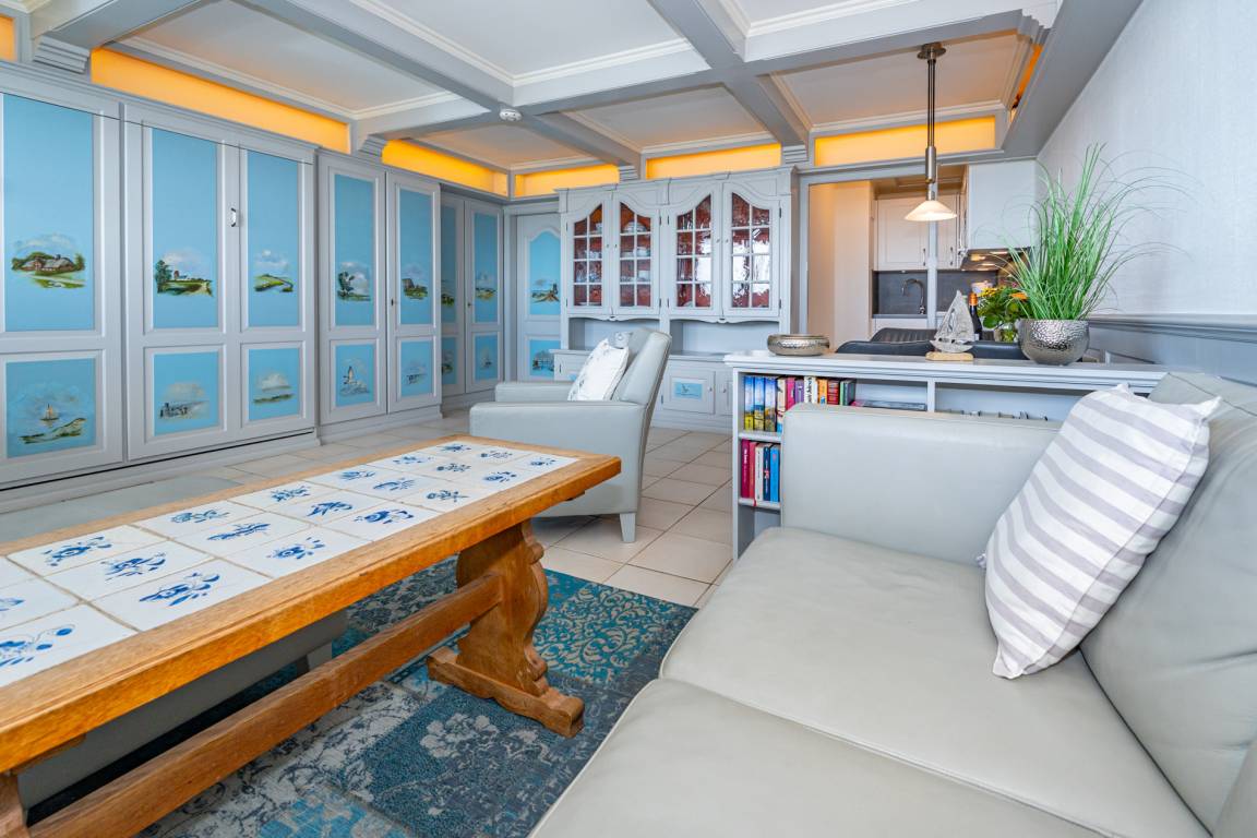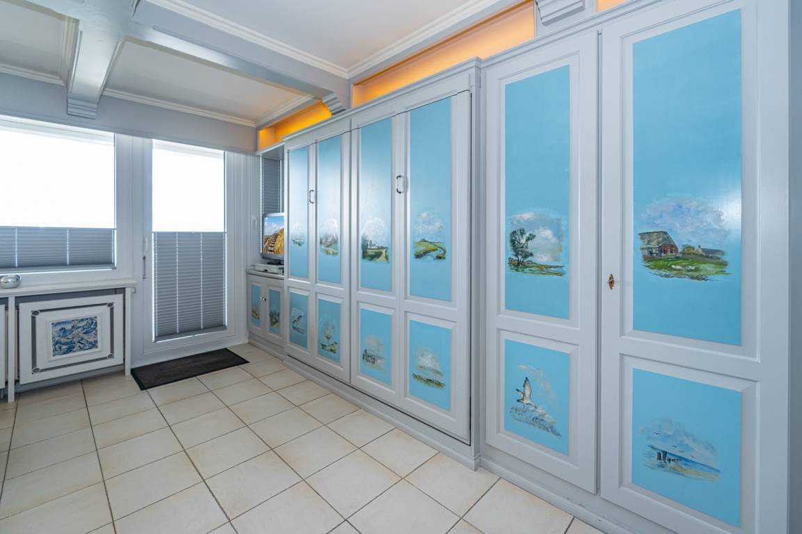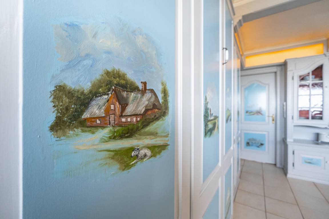Die im modernen Friesenstil gehaltene Wohnung ist mit ihren aufwendigen Tischlereinbauten und handgemalten Sylt-Motiven ein Unikat.