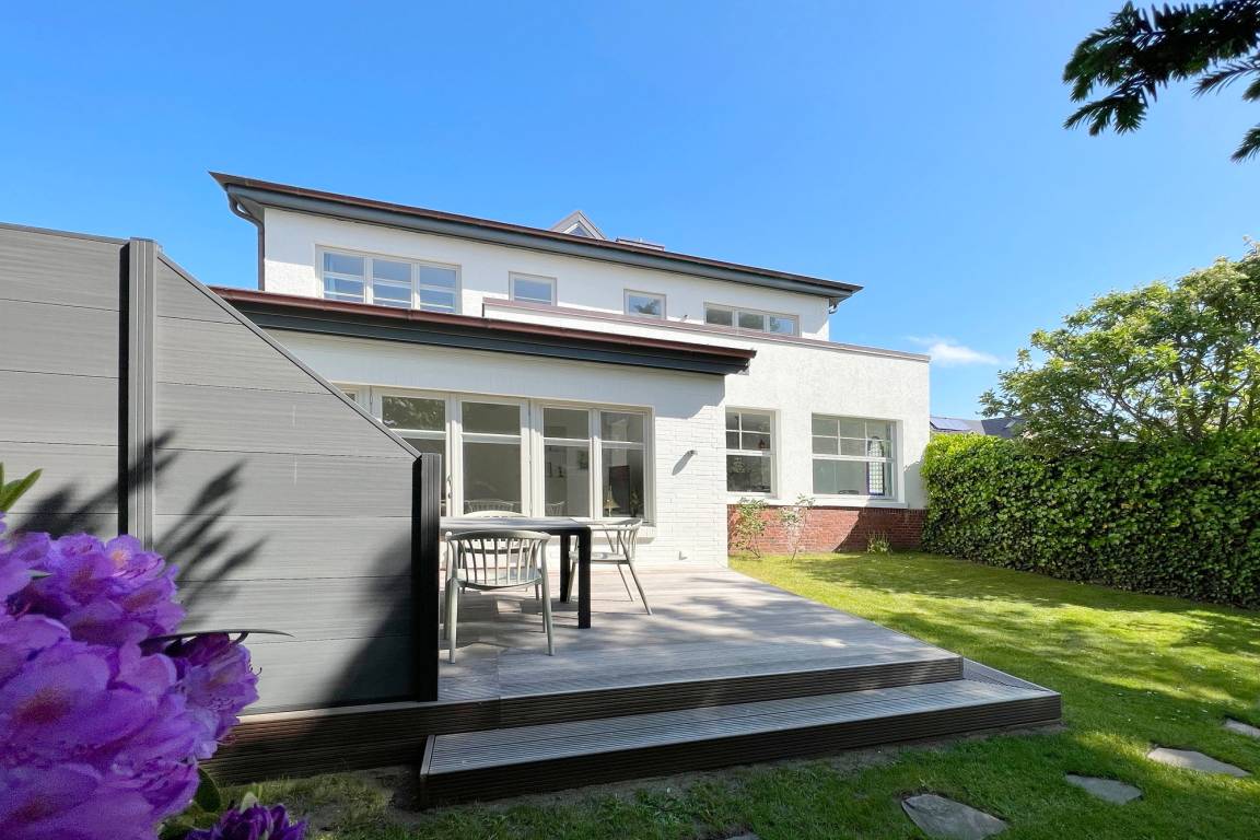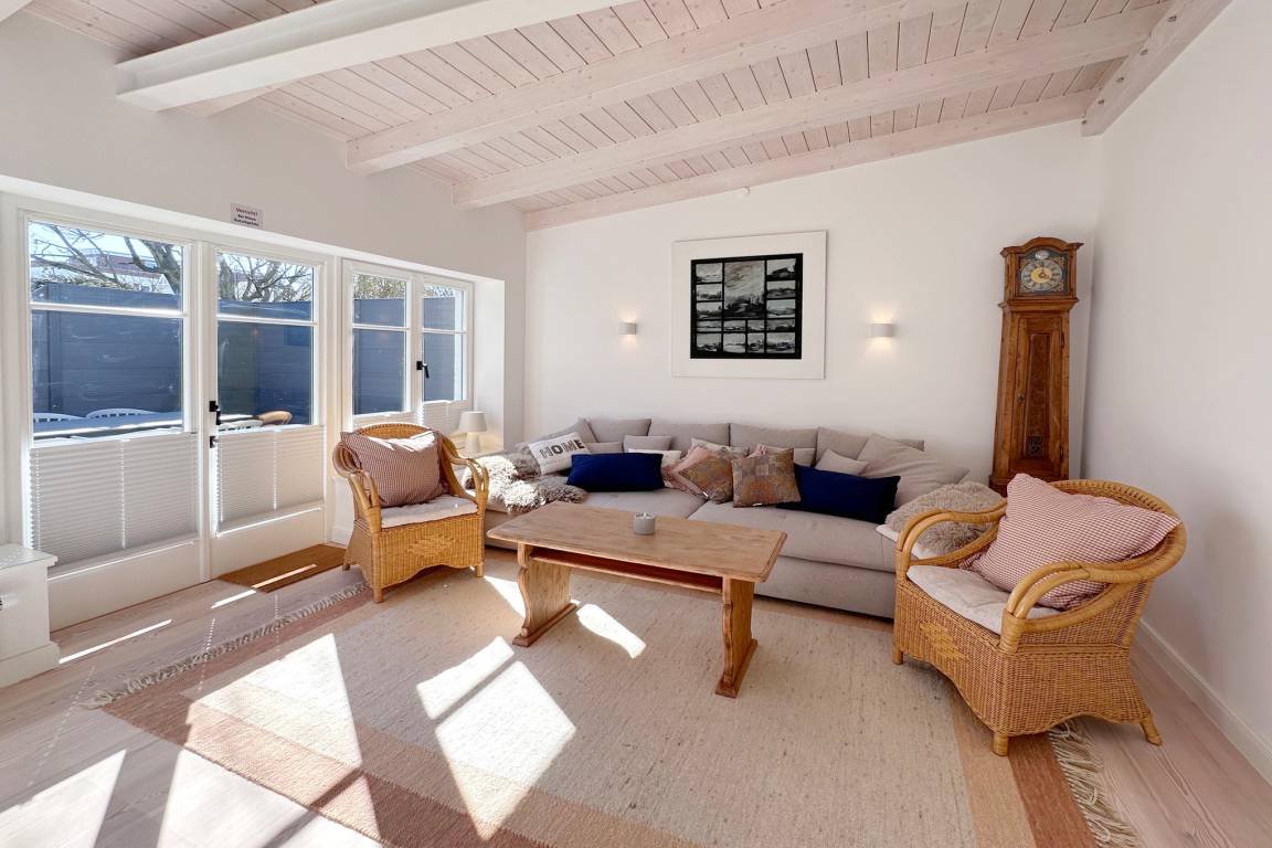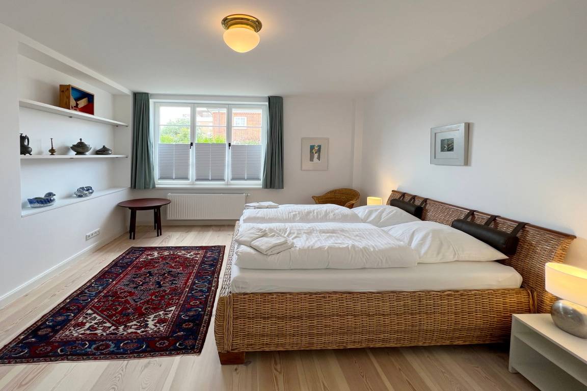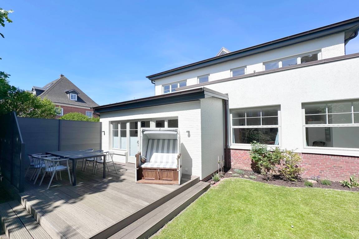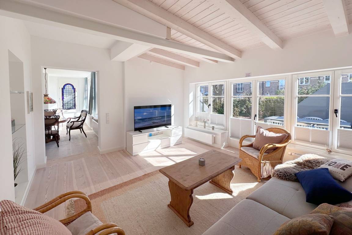 Die Ferienwohnung befindet sich in zentraler und strandnaher Lage und wurde frisch renoviert und saniert. Sie verfügt über einen großzügigen Grundriss von ca. 100 m² und alle Räume befinden sich auf einer Ebene. Im Wohnbereich gibt es eine integrierte Küche und einen Zugang zur Terrasse und dem allein zu nutzenden Garten. Ebenfalls zur Wohnung gehört ein Arbeitszimmer mit Schreibtisch und Blick in den grünen Garten. Auf dem Grundstück gibt es einen PKW-Stellplatz. Die Ferienwohnung verfügt über zwei Schlafzimmer mit jeweils einem Doppelbett und ein modernes Badezimmer mit Dusche und Wanne. Im Haus gibt es eine Waschmaschine und einen Trockner, die gemeinschaftlich mit App. 2 genutzt werden können.