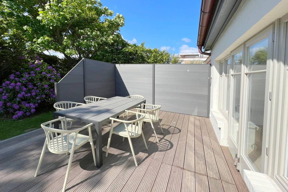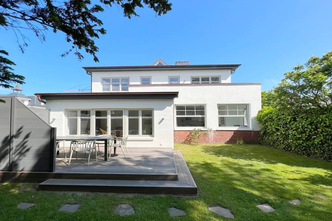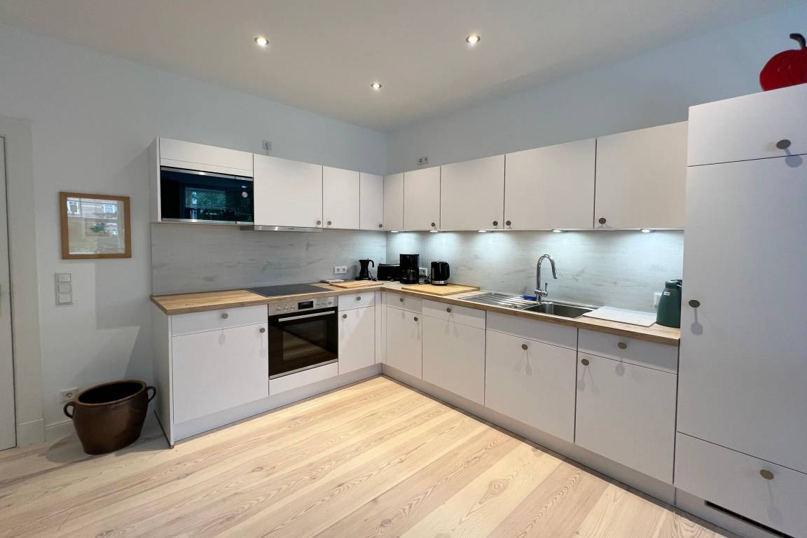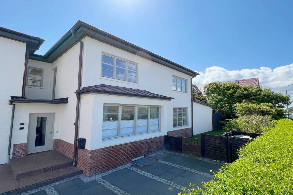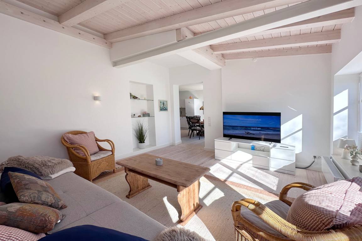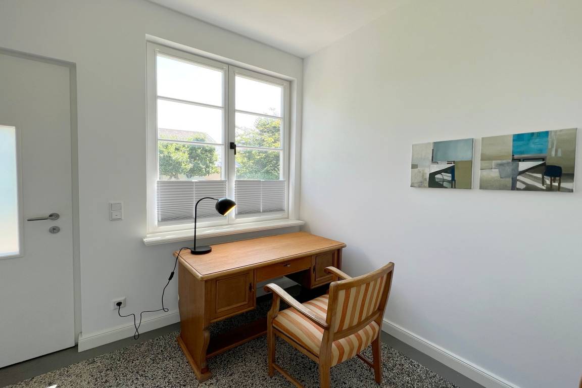 Die Ferienwohnung befindet sich in zentraler und strandnaher Lage und wurde frisch renoviert und saniert. Sie verfügt über einen großzügigen Grundriss von ca. 100 m² und alle Räume befinden sich auf einer Ebene. Im Wohnbereich gibt es eine integrierte Küche und einen Zugang zur Terrasse und dem allein zu nutzenden Garten. Ebenfalls zur Wohnung gehört ein Arbeitszimmer mit Schreibtisch und Blick in den grünen Garten. Auf dem Grundstück gibt es einen PKW-Stellplatz. Die Ferienwohnung verfügt über zwei Schlafzimmer mit jeweils einem Doppelbett und ein modernes Badezimmer mit Dusche und Wanne. Im Haus gibt es eine Waschmaschine und einen Trockner, die gemeinschaftlich mit App. 2 genutzt werden können.