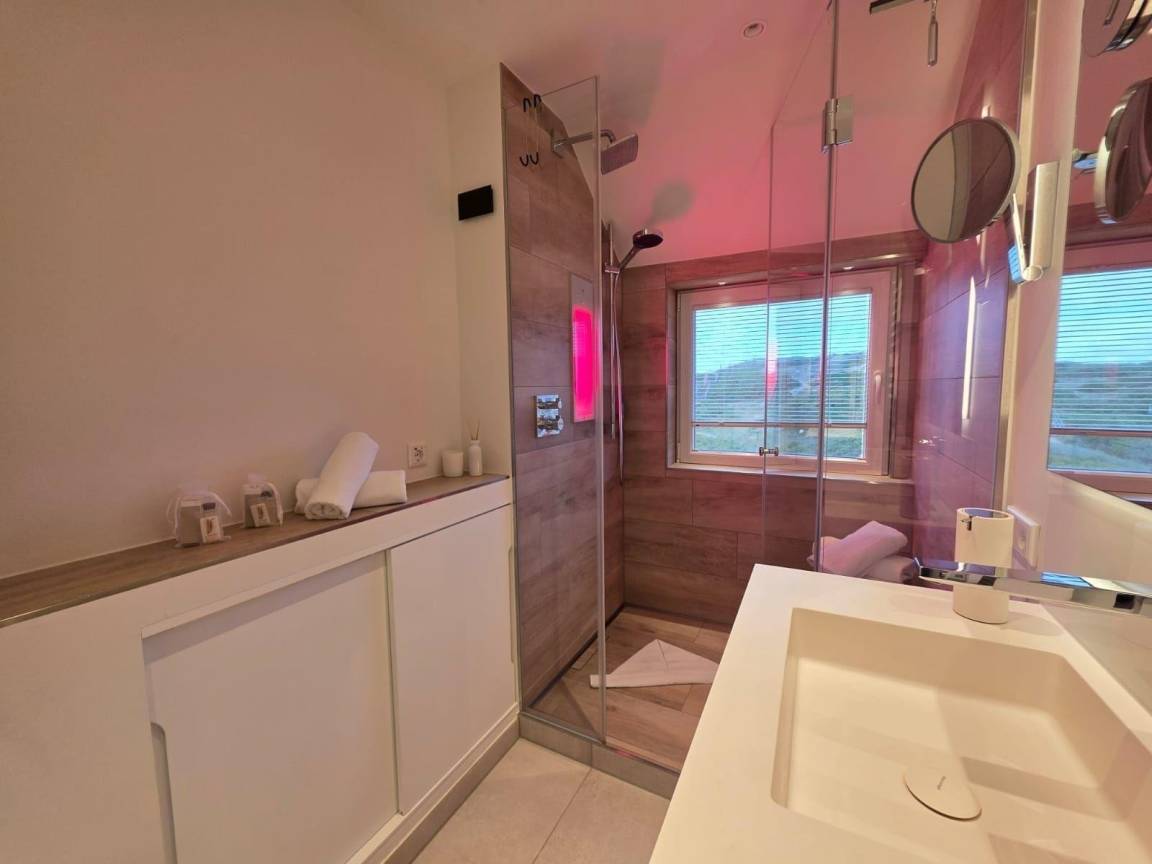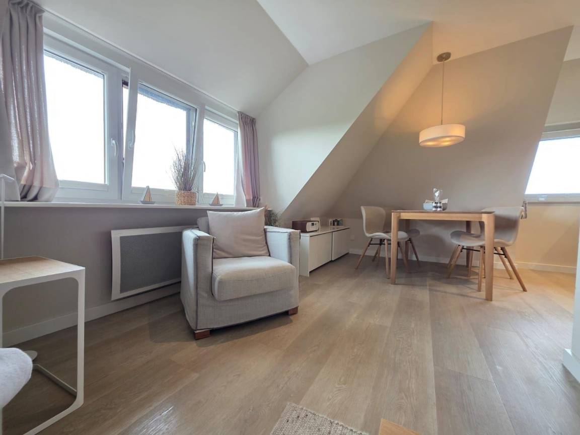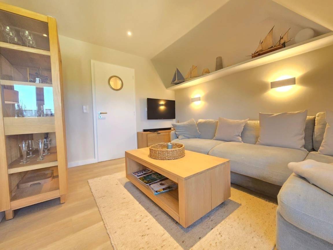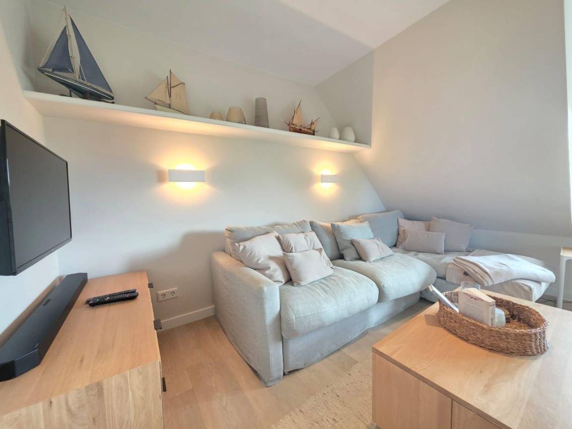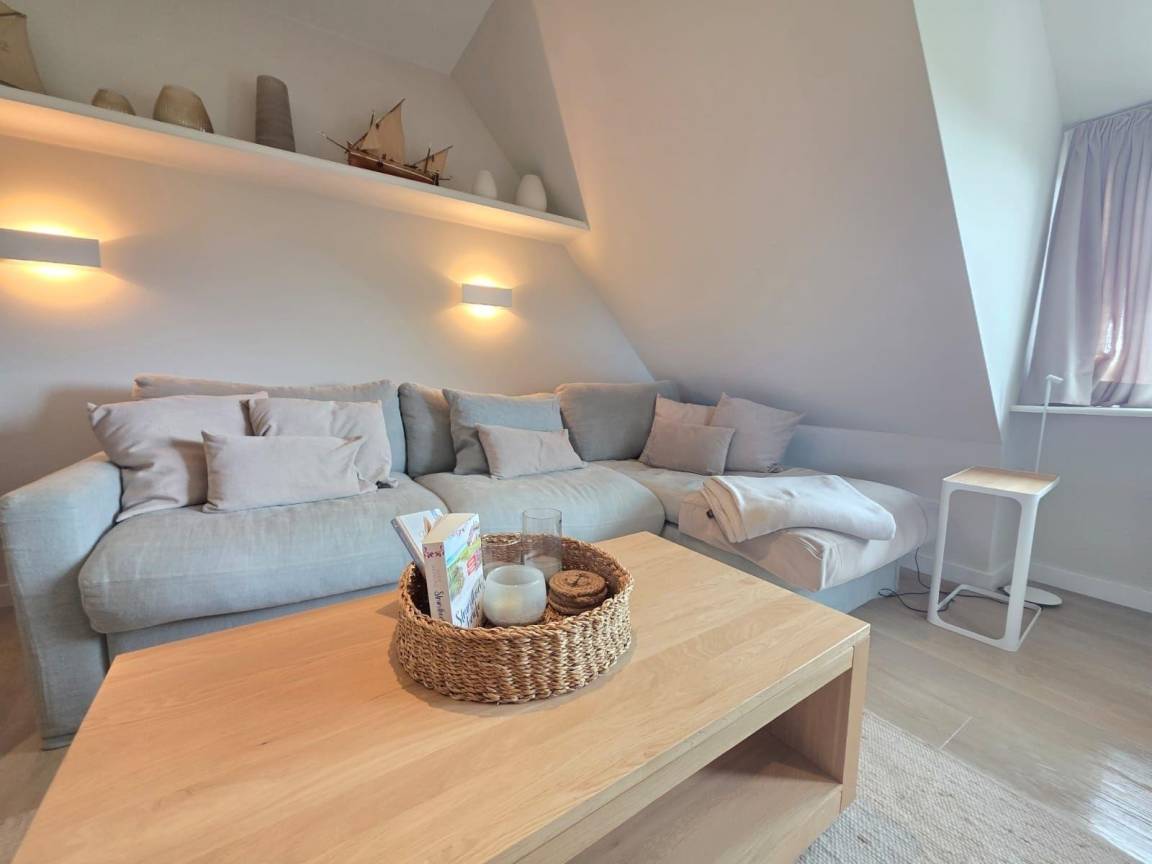 Die moderne Ferienwohnung 'Beachside 21' in Rantum auf Sylt erstreckt sich über 65 Quadratmeter und bietet Platz für bis zu vier Personen. Der offene Wohn- und Essbereich überzeugt mit einem gemütlichen Sofa, das als Schlafcouch genutzt werden kann, sowie einem TV und einem DAB-Radio für Unterhaltungsangebote. Die hochwertig ausgestattete Küche verfügt über einen Miele Backofen mit integrierter Mikrowelle, einen großen Liebherr Kühlschrank mit Gefrierfach, einen Miele Induktionsherd und eine Geschirrspülmaschine. Das Hauptschlafzimmer ist mit einem Boxspringbett (1,80 x 2,00 Meter) und einem Kleiderschrank ausgestattet. Im Dachgeschoss stehen zwei Einzelbetten (0,90 x 1,90 Meter) bereit. Das helle Duschbad bietet eine Regendusche und eine Sunshower. Die ruhige Lage und die stilvolle Ausstattung schaffen eine einladende Atmosphäre für erholsame Urlaubstage.