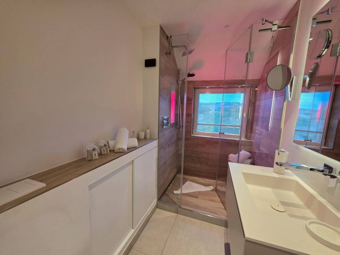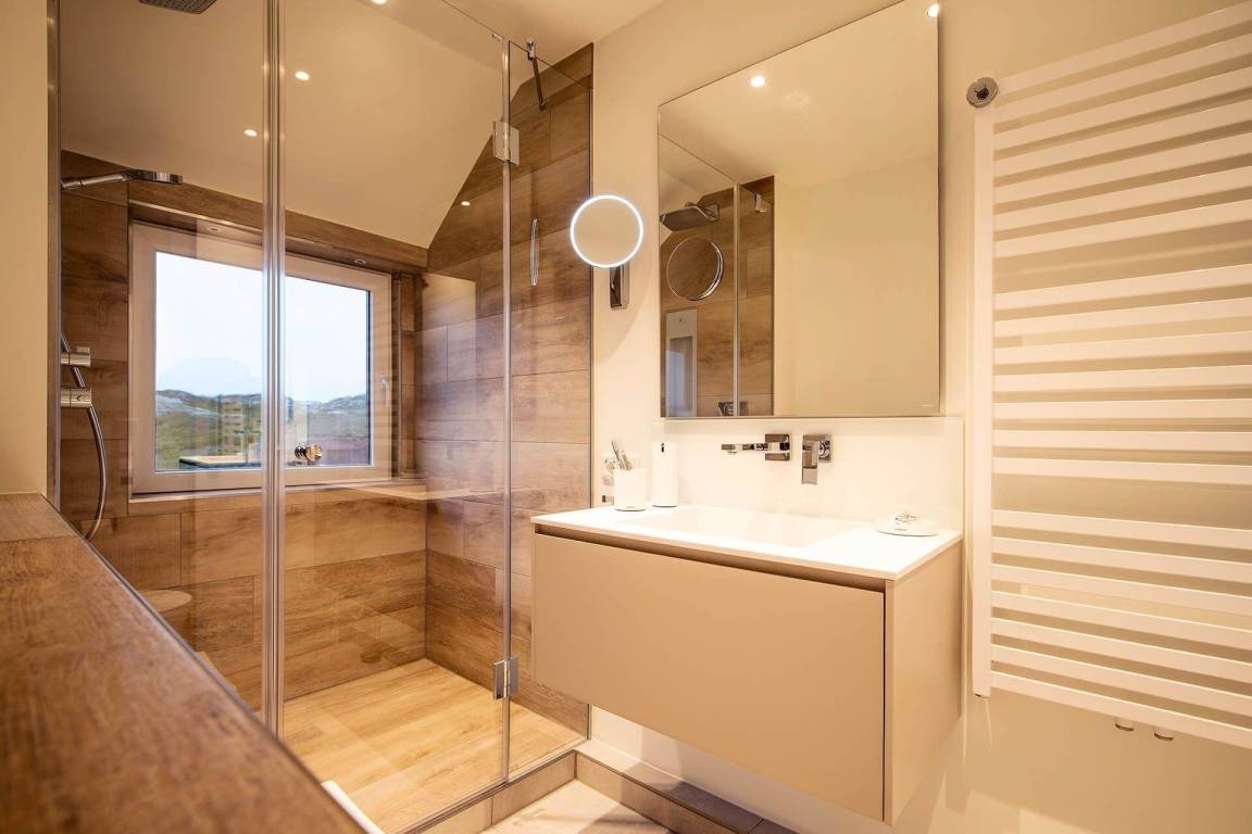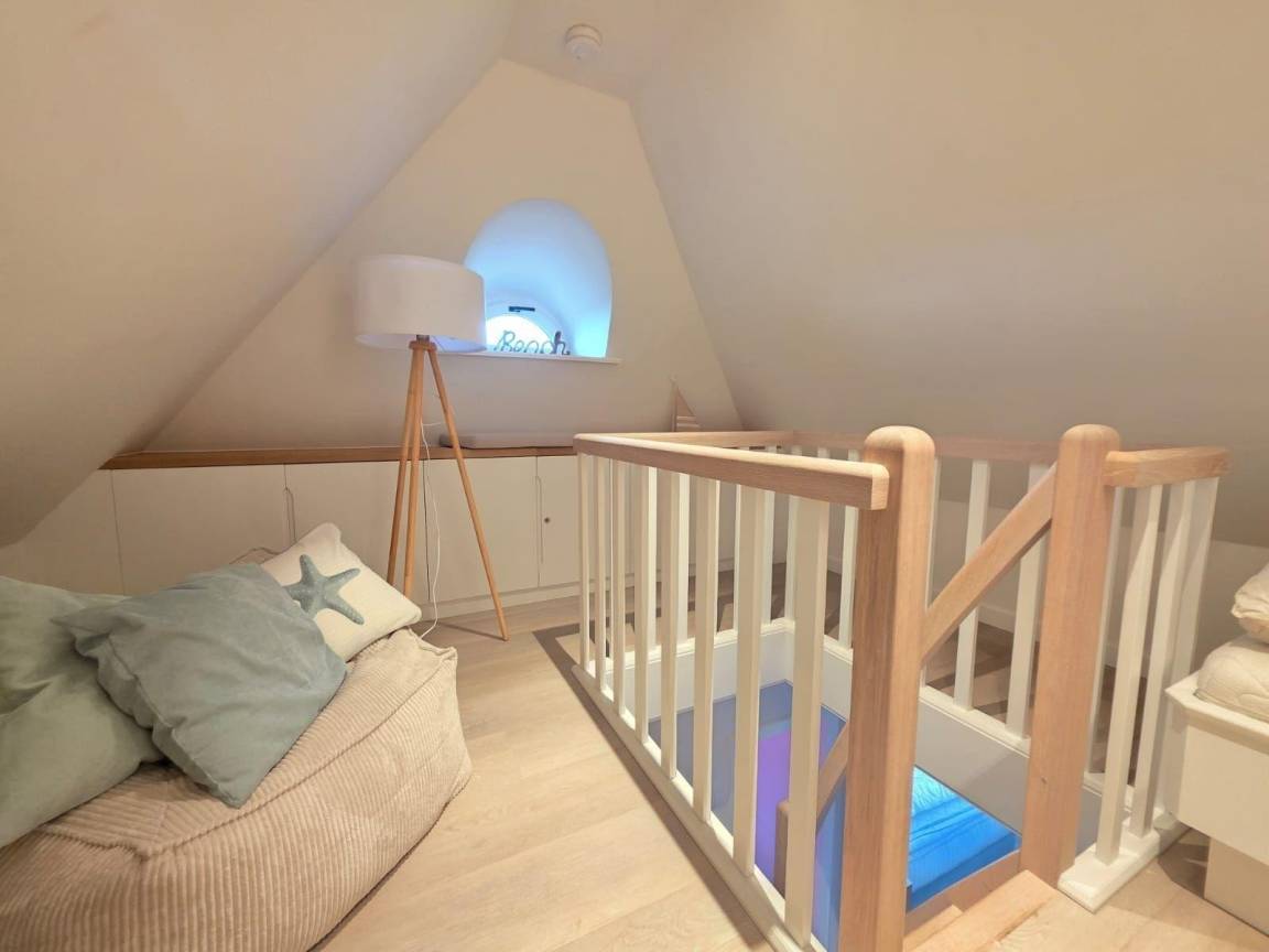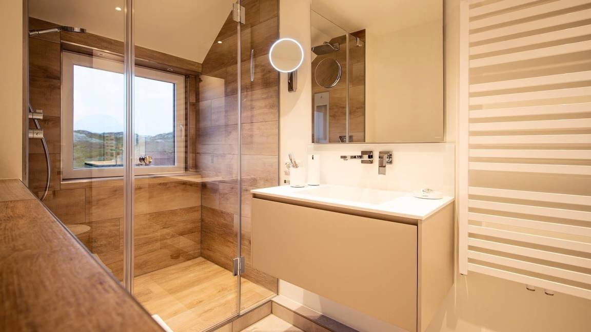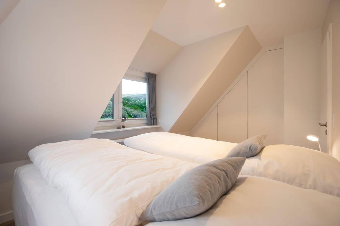 Die moderne Ferienwohnung 'Beachside 21' in Rantum auf Sylt erstreckt sich über 65 Quadratmeter und bietet Platz für bis zu vier Personen. Der offene Wohn- und Essbereich überzeugt mit einem gemütlichen Sofa, das als Schlafcouch genutzt werden kann, sowie einem TV und einem DAB-Radio für Unterhaltungsangebote. Die hochwertig ausgestattete Küche verfügt über einen Miele Backofen mit integrierter Mikrowelle, einen großen Liebherr Kühlschrank mit Gefrierfach, einen Miele Induktionsherd und eine Geschirrspülmaschine. Das Hauptschlafzimmer ist mit einem Boxspringbett (1,80 x 2,00 Meter) und einem Kleiderschrank ausgestattet. Im Dachgeschoss stehen zwei Einzelbetten (0,90 x 1,90 Meter) bereit. Das helle Duschbad bietet eine Regendusche und eine Sunshower. Die ruhige Lage und die stilvolle Ausstattung schaffen eine einladende Atmosphäre für erholsame Urlaubstage.