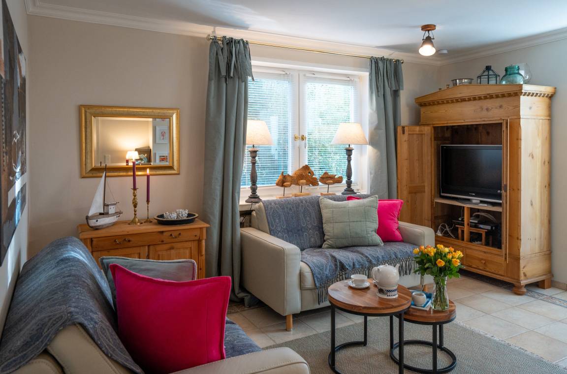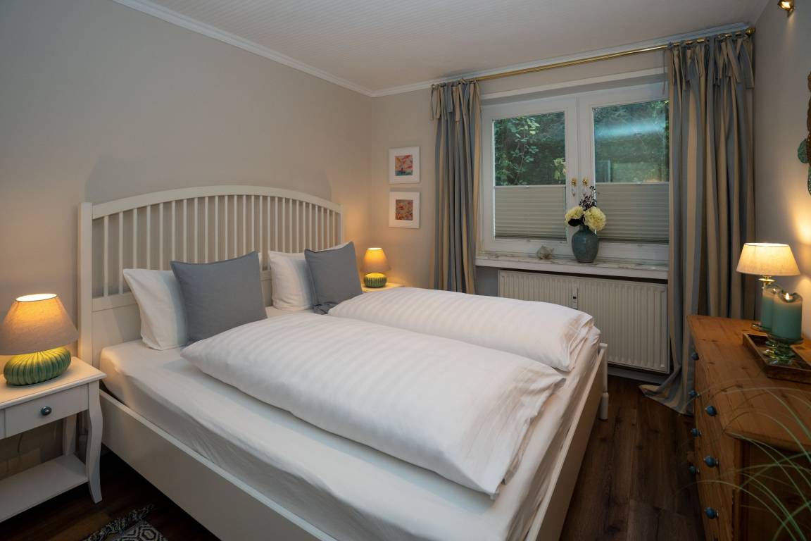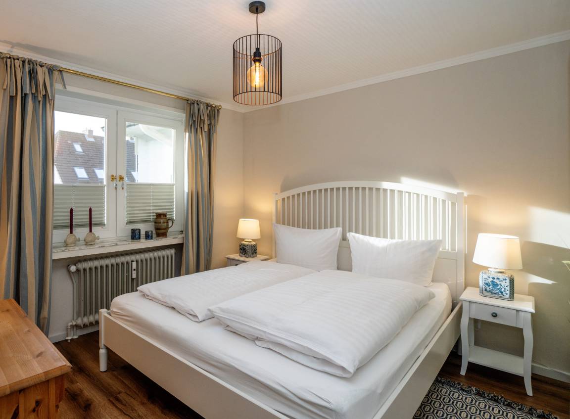 Im Appartement stehen Ihnen zwei behagliche Schlafzimmer mit Doppelbetten zur Verfügung, die zu entspannten Nächten und erholsamem Ausschlafen einladen. Der helle Wohnbereich mit gemütlicher TV-Ecke, Essecke und moderner Küchenzeile bildet das Herzstück der Wohnung und schafft einen einladenden Ort für gemeinsame Mahlzeiten, ruhige Abende und entspannte Stunden nach einem Tag auf der Insel. Das gepflegte Badezimmer ist mit Dusche, WC und Waschbecken ausgestattet und rundet den Wohnkomfort angenehm ab.