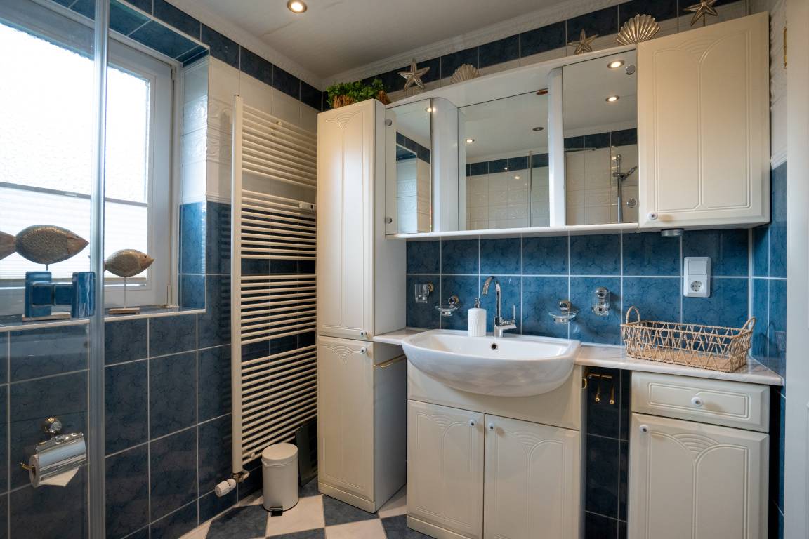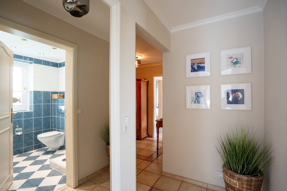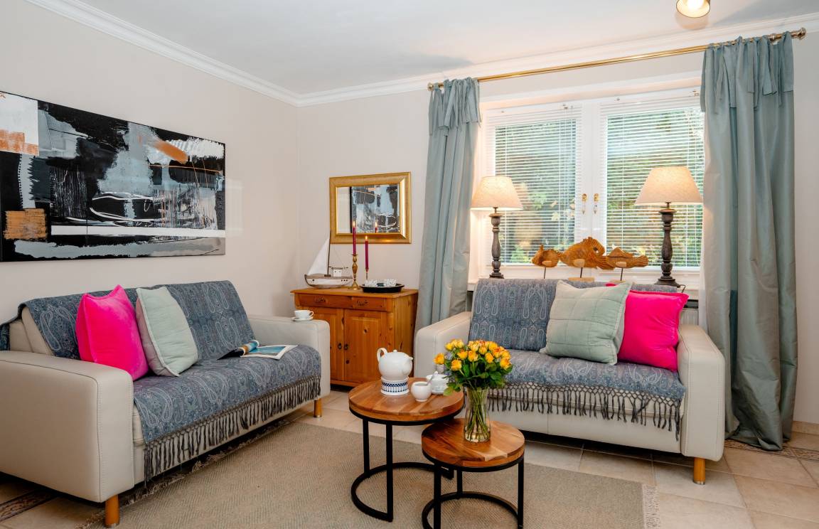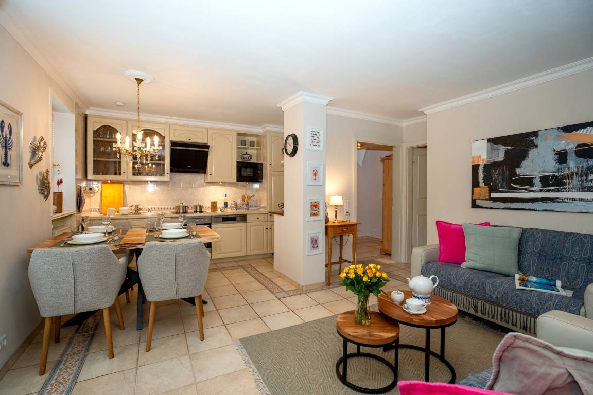 Im Appartement stehen Ihnen zwei behagliche Schlafzimmer mit Doppelbetten zur Verfügung, die zu entspannten Nächten und erholsamem Ausschlafen einladen. Der helle Wohnbereich mit gemütlicher TV-Ecke, Essecke und moderner Küchenzeile bildet das Herzstück der Wohnung und schafft einen einladenden Ort für gemeinsame Mahlzeiten, ruhige Abende und entspannte Stunden nach einem Tag auf der Insel. Das gepflegte Badezimmer ist mit Dusche, WC und Waschbecken ausgestattet und rundet den Wohnkomfort angenehm ab.
