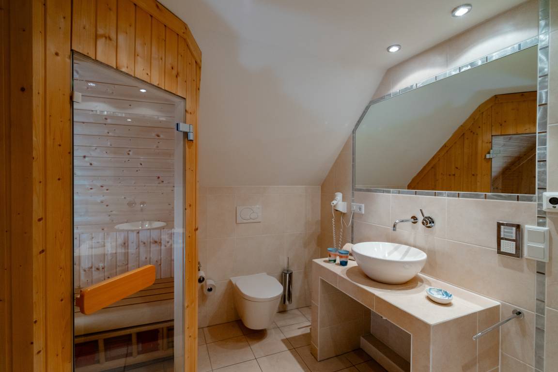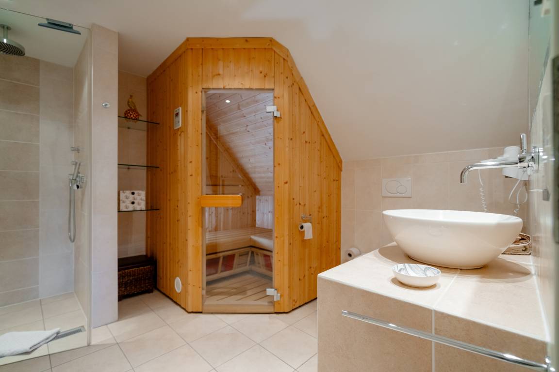 Das Appartement verfügt über ein gemütliches Schlafzimmer mit Doppelbett und begehbarem Kleiderschrank, einen einladenden Wohnbereich mit integrierter Küchenzeile sowie ein modernes Badezimmer, das mit Regenfalldusche, Fußbodenheizung, Radio und eigener Infrarotsauna für besondere Wohlfühlmomente sorgt. Die voll ausgestattete Küche und die kostenlose Nutzung von Waschmaschine und Trockner im Gemeinschaftsraum bieten zusätzlichen Komfort für einen rundum gelungenen Aufenthalt.