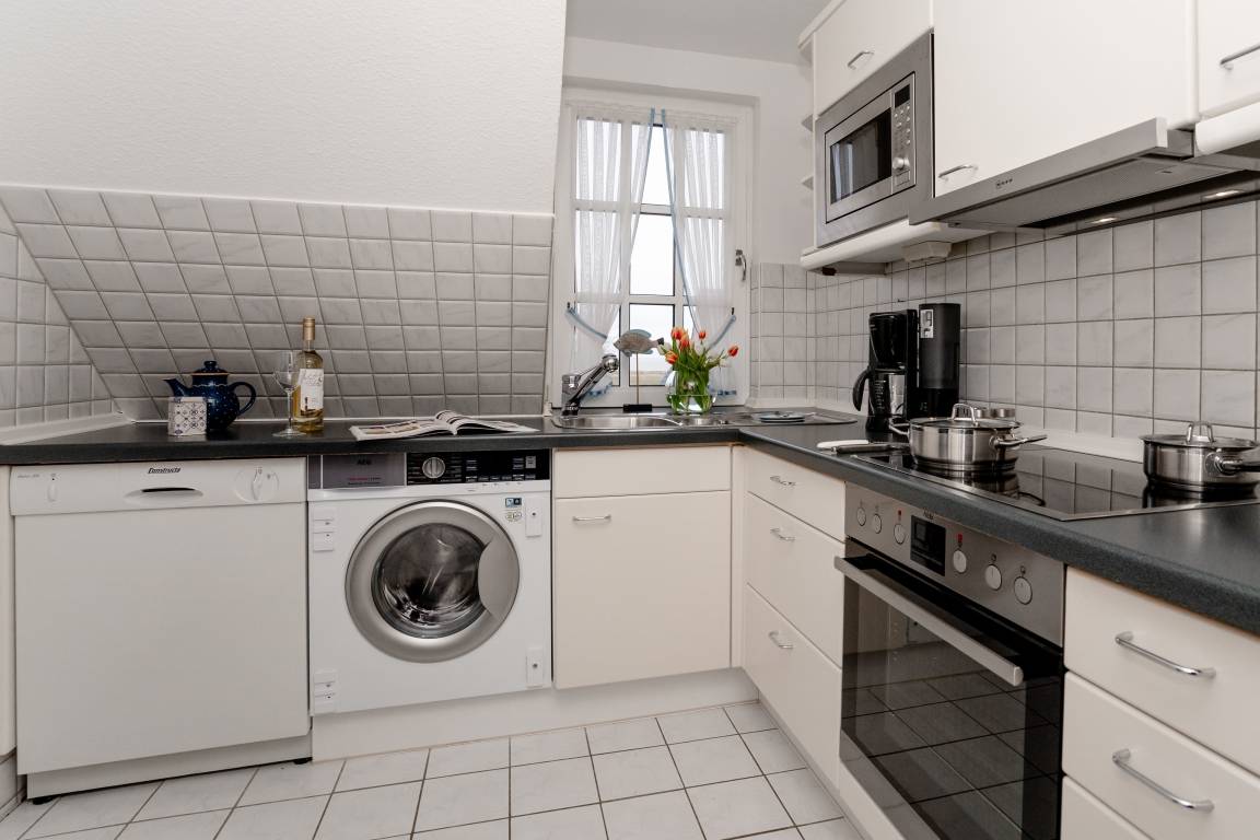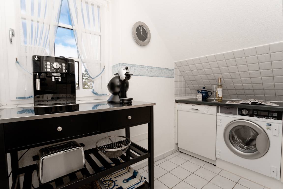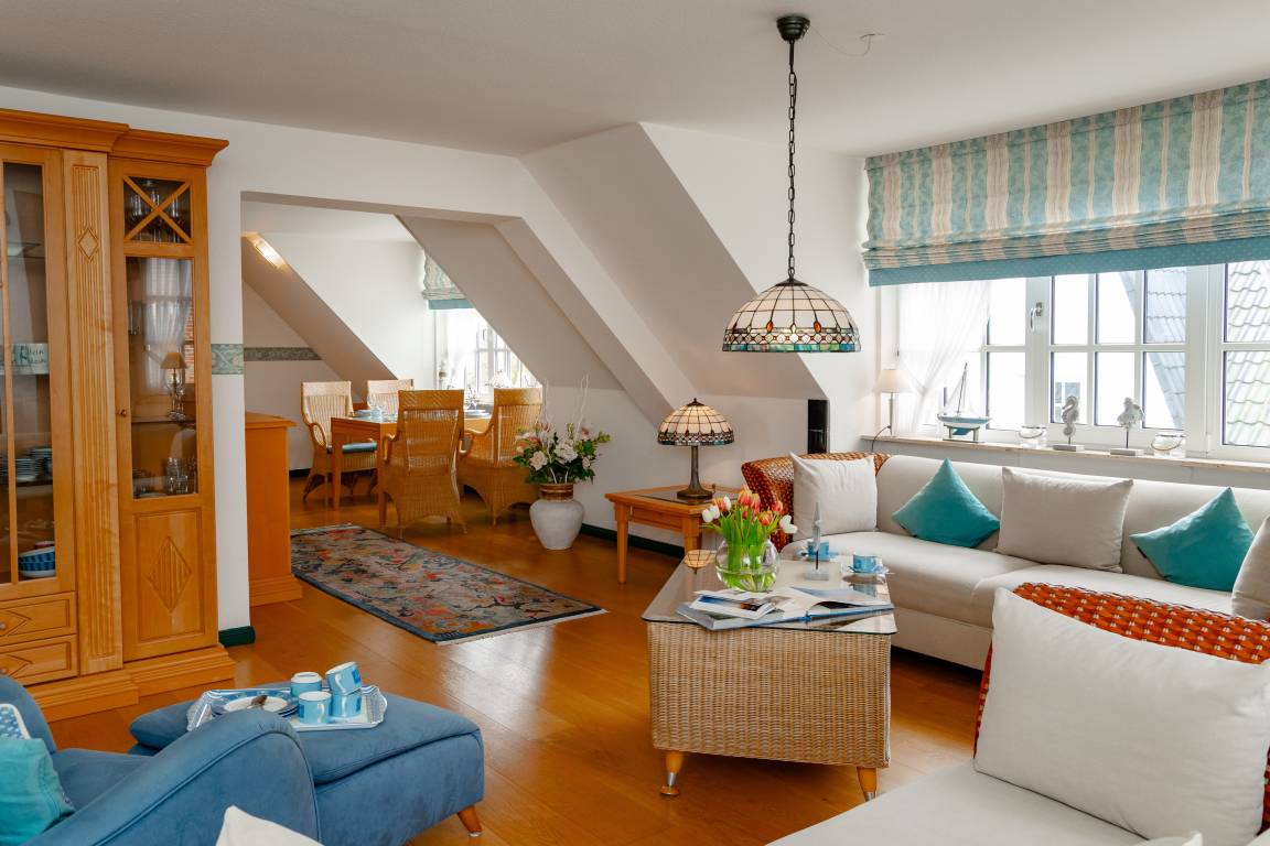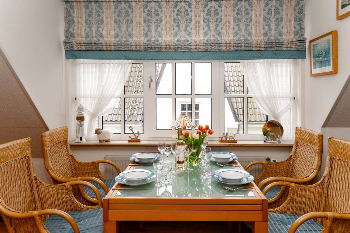 Der großzügige Wohn- und Essbereich lädt zu gemeinsamen Mahlzeiten, entspannten Abenden und gemütlichen Stunden nach einem erlebnisreichen Inseltag ein. Die separate, voll ausgestattete Küche bietet beste Voraussetzungen für einen unkomplizierten Aufenthalt – auch bei längeren Ferien.