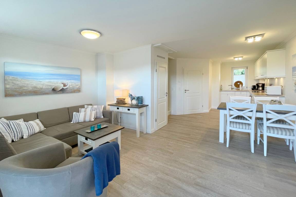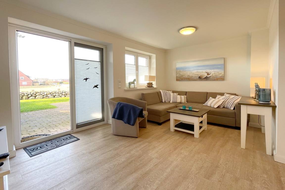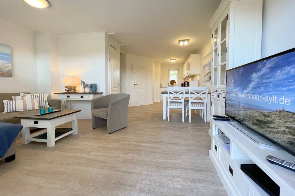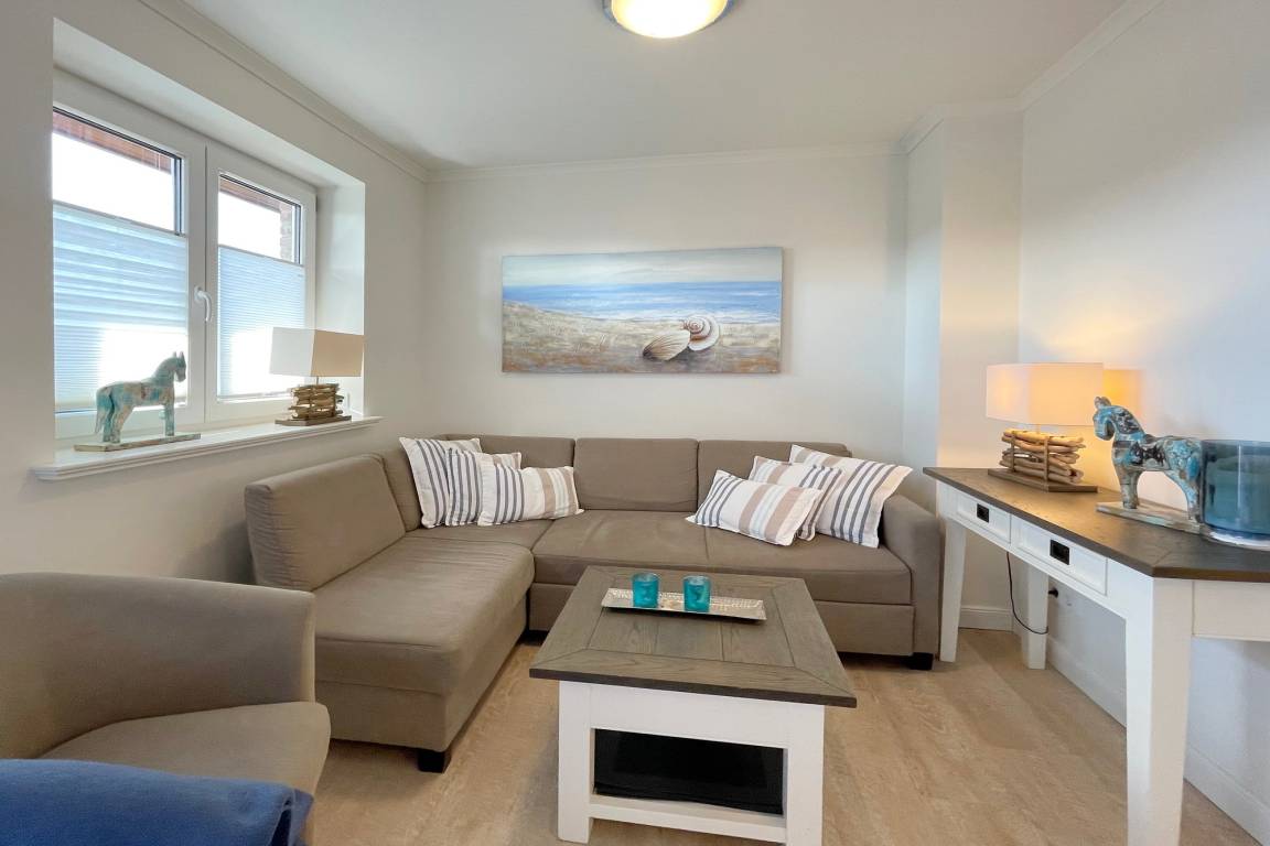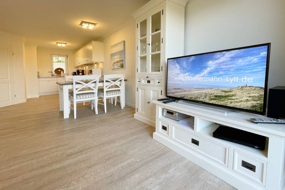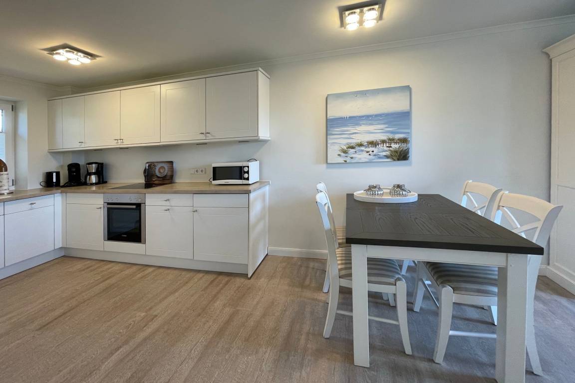 In zentraler Insellage mit Feldblick haben wir diese Mittehausscheibe für Ihren Urlaub auf Sylt im Angebot. Im Erdgeschoss befindet sich der Wohn-Essbereich mit offener Küche, Flur und ein kleines Duschbad.